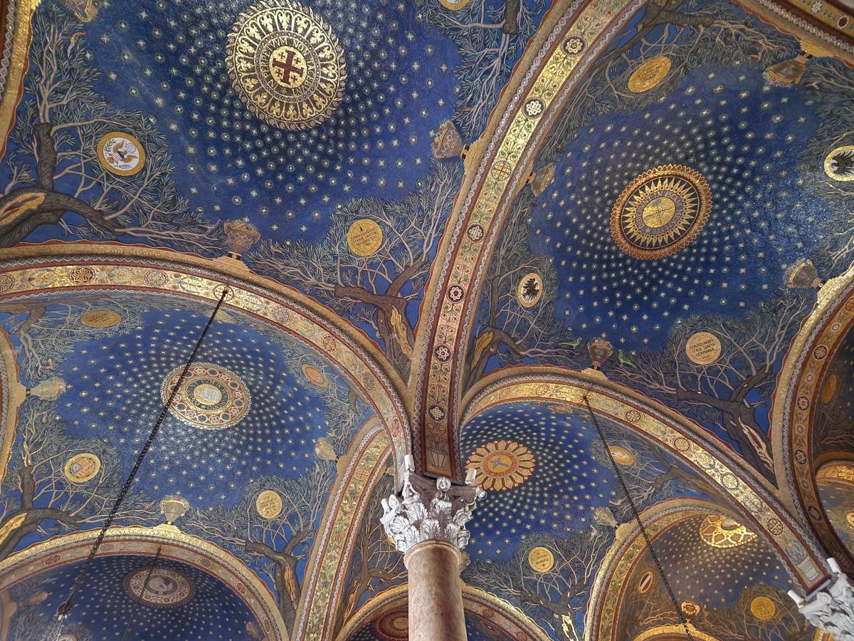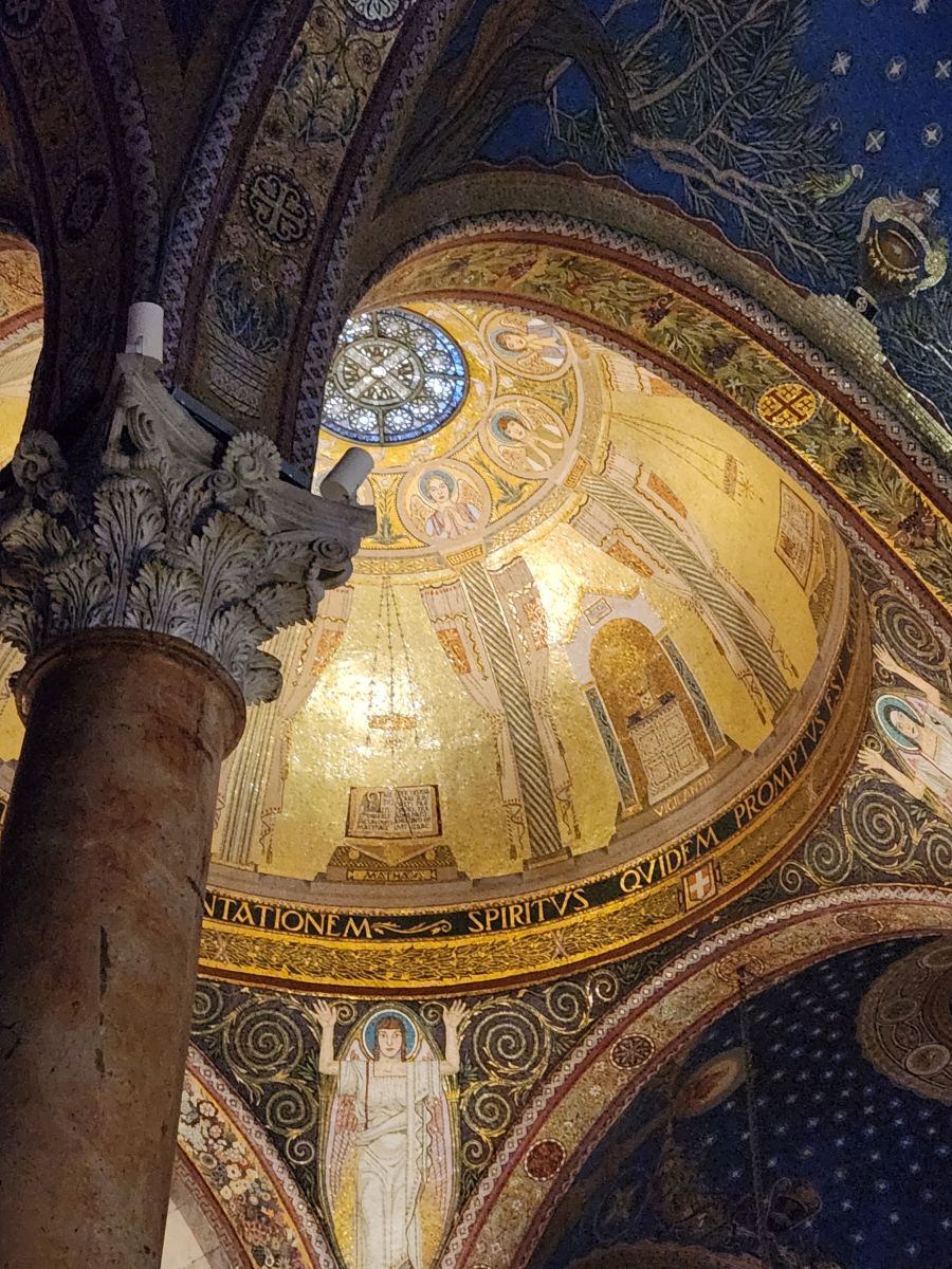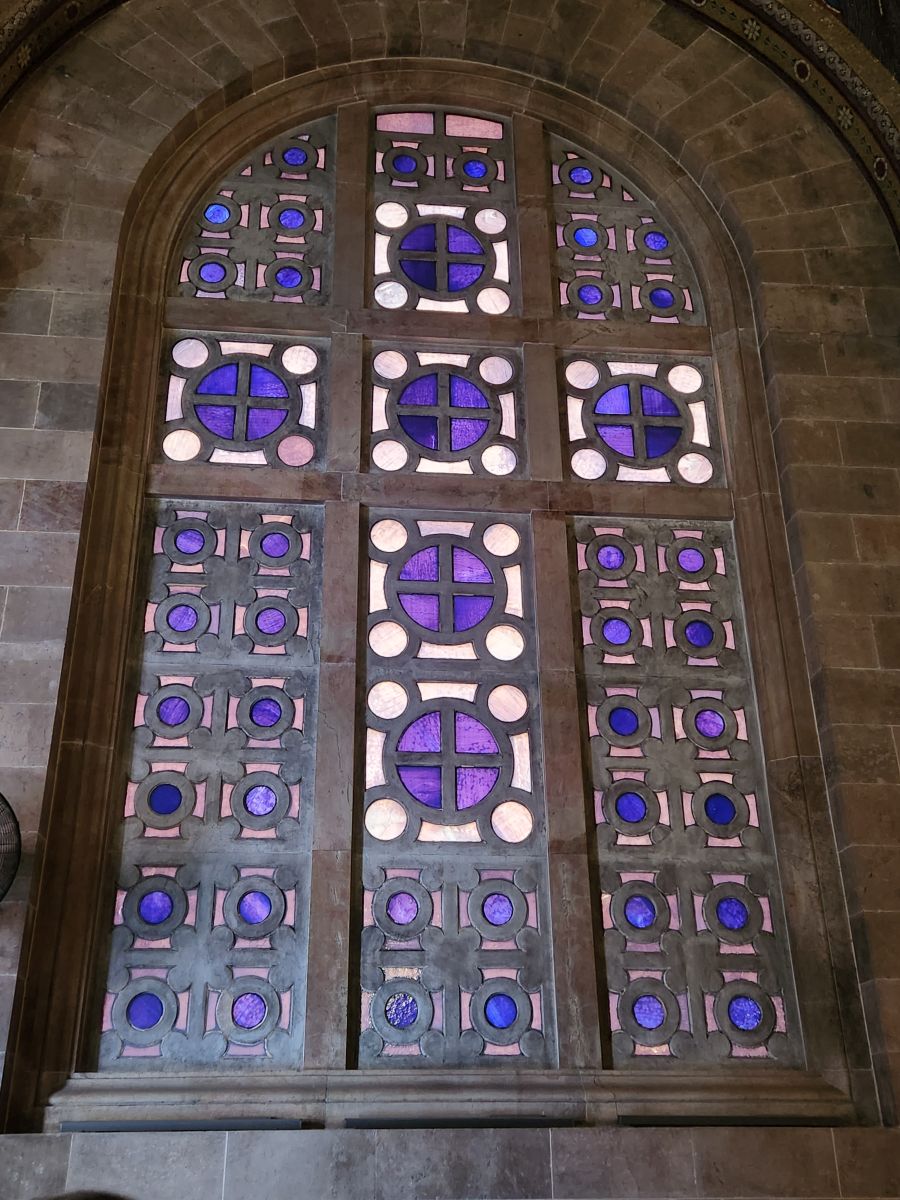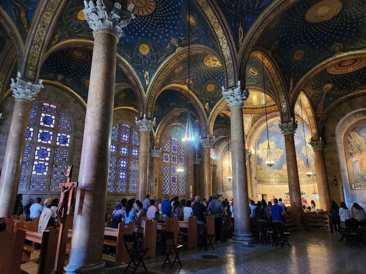Crossing the street en masse (these guys are actually pretty good at listening to instructions…..so far….), we enter into a beautiful garden filled with olive trees and flowers. The church is built in a Romanesque Revivalism and neo-Brick Gothic (ok, technical terms, I think it looks Greek Orthodox – but what do I know?) with those beautiful aforementioned mosaics everywhere. There is some sort of service going on when we enter, which makes it difficult (and a little disrespectful) to take a lot of photos, but we still do. It is an extraordinarily beautiful church – and even if we don’t get to see the Rock of Agony directly in front of the altar (due to the service – they are actually doing communion soon after we arrive), it is still an amazing place with marble pillars, deep blue mosaic ceilings (with different country seals in each cupola indicating the country gave contributions) and some incredible stained glass and metal windows.