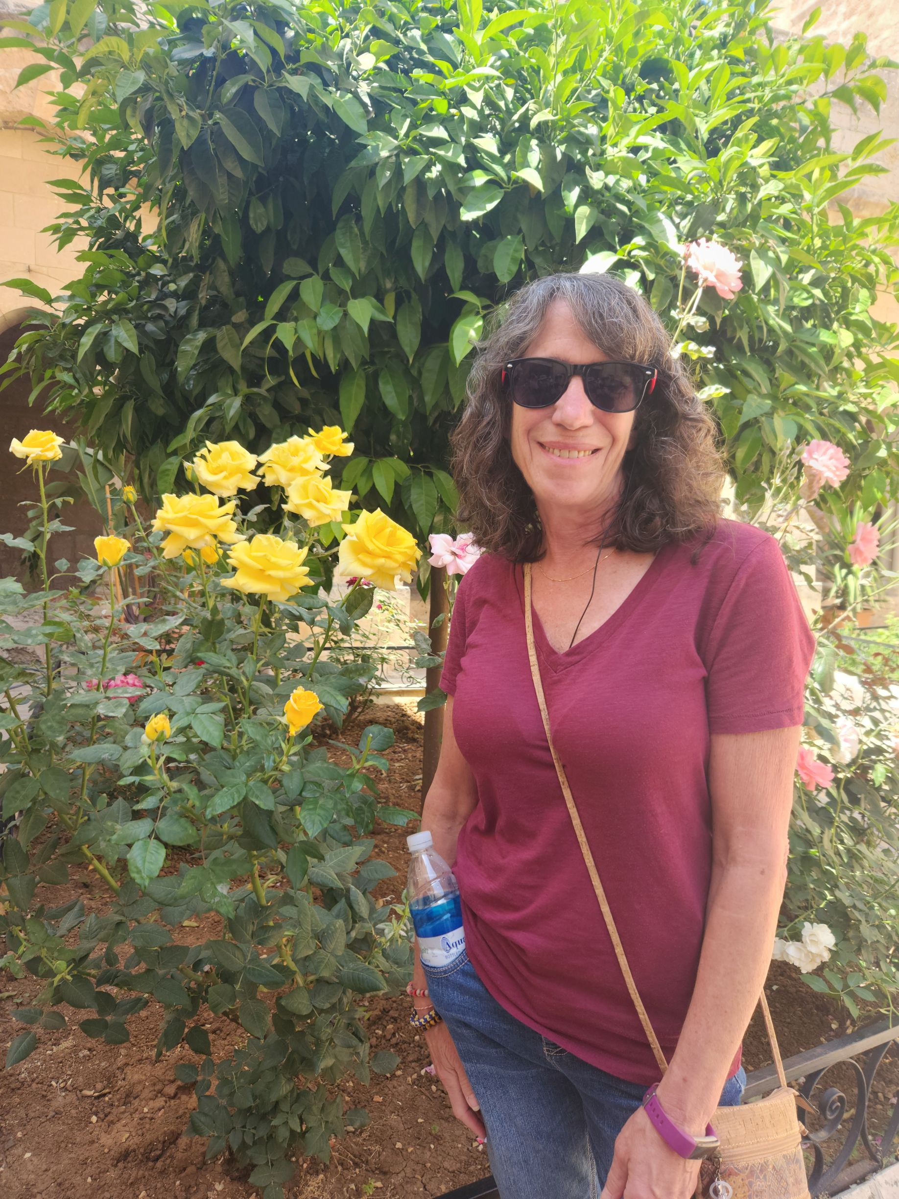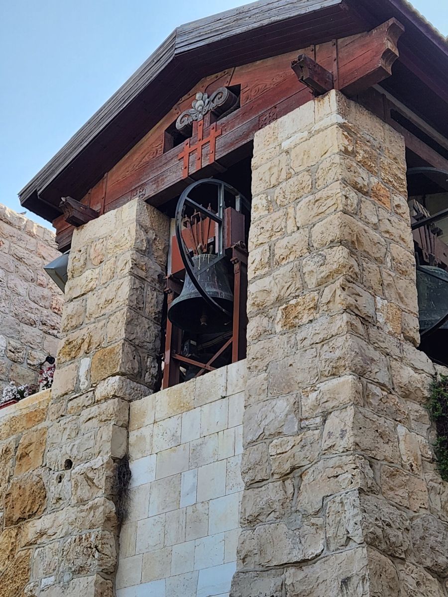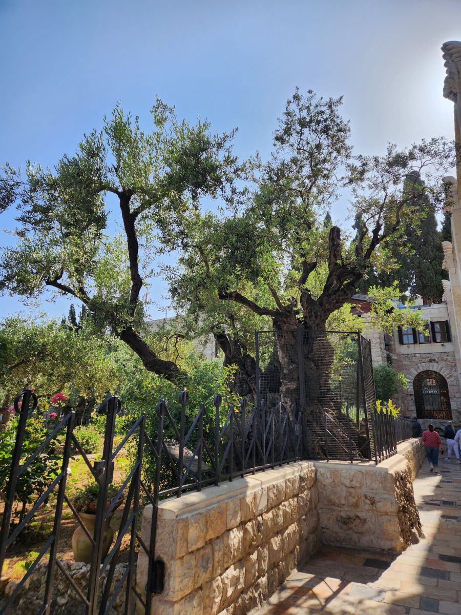 Back outside in the garden, we pass the oldest olive tree in the world at 1500 years old. in church courtyard, then circle the garden, skirting the exterior of the church with magnificent stonework and old bell tower.