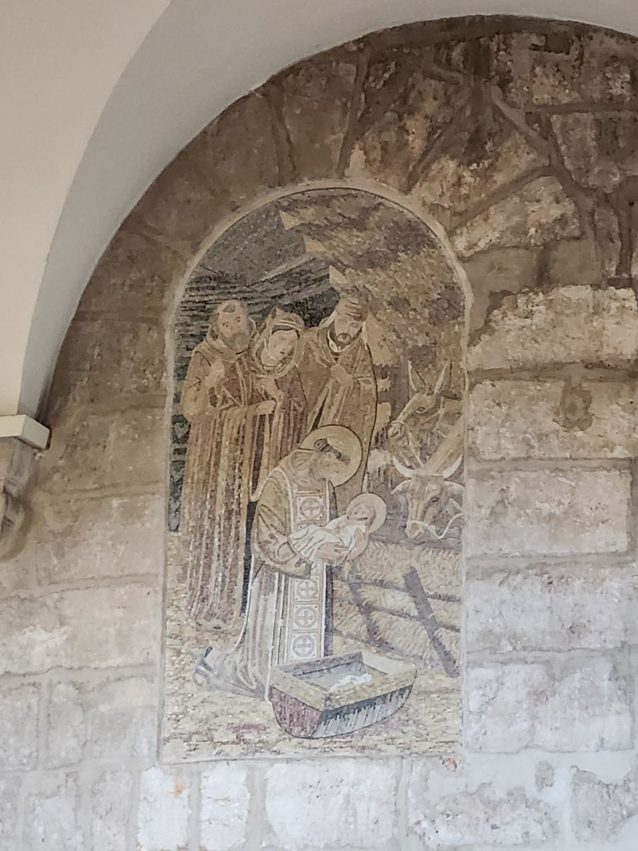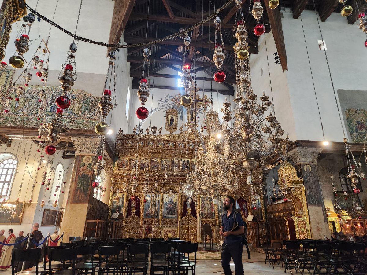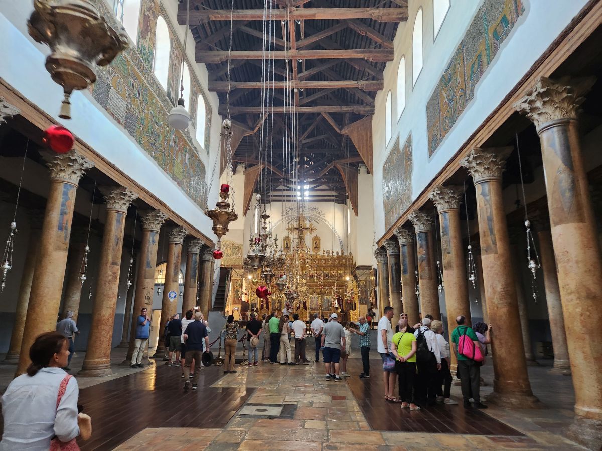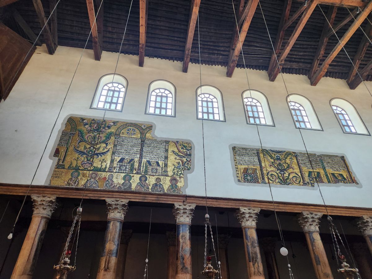 Once inside, we walk through the Greek orthodox chapel with huge marble columns and a lot of gold. The wood framed roof is original (amazing it has lasted this long!) and there are more mosaics -mostly gold hued – here along the upper walls. There is also a part of the original mosaic tile from the original floor of the cathedral that has been preserved. It is in this general area where Jesus was born – there is a grotto underneath the altar in front of us, called the Star of Bethlehem (I believe) that we may or may not see. Rafael says the lines can become very long with upwards of a 3 hour wait. If the wait is an hour or less, we will go. If longer, we will not.