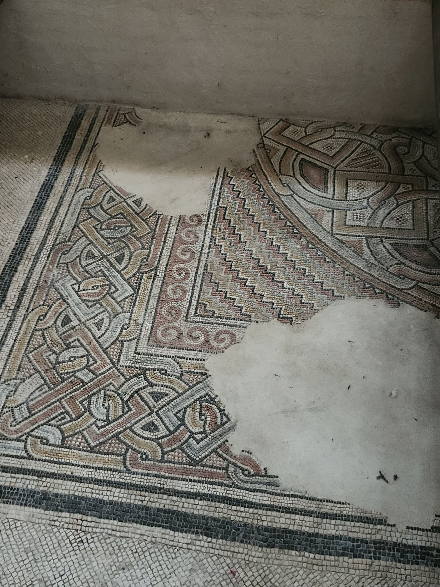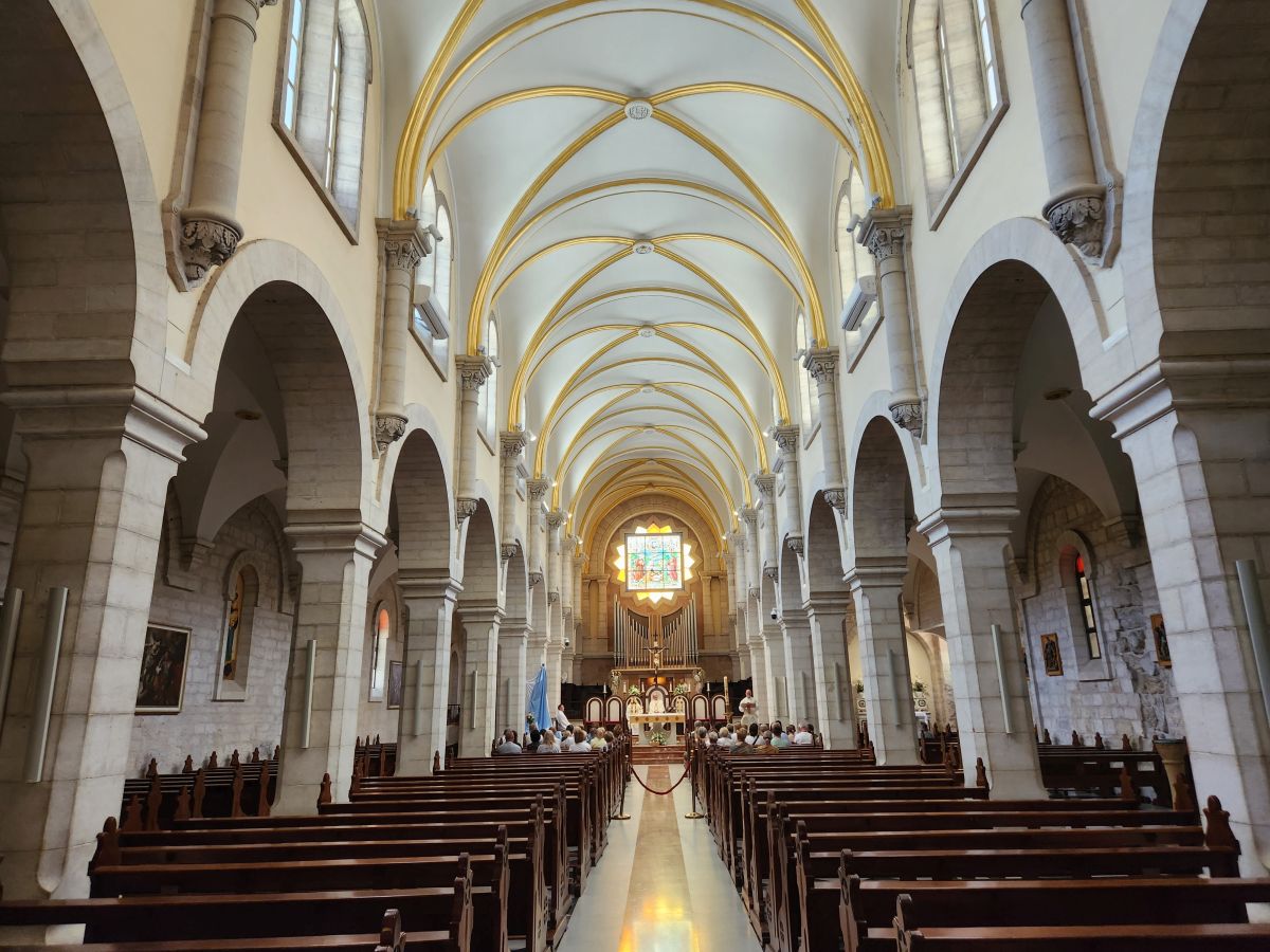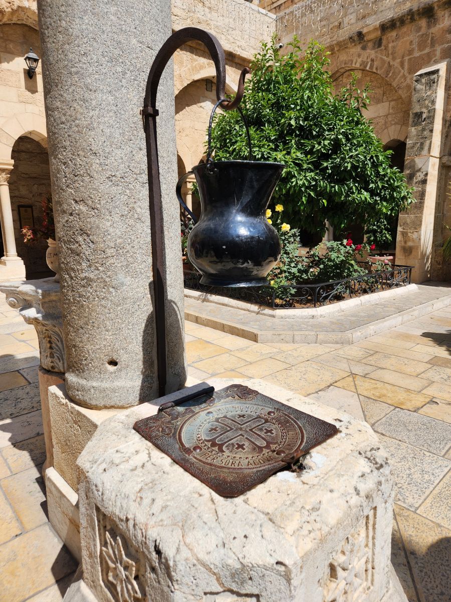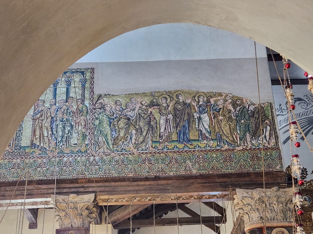 Once inside, we walk through the Greek orthodox chapel with huge marble columns and a lot of gold. The wood framed roof is original (amazing it has lasted this long!) and there are more mosaics -mostly gold hued – here along the upper walls. There is also a part of the original mosaic tile from the original floor of the cathedral that has been preserved. It is in this general area where Jesus was born – there is a grotto underneath the altar in front of us, called the Star of Bethlehem (I believe) that we may or may not see. Rafael says the lines can become very long with upwards of a 3 hour wait. If the wait is an hour or less, we will go. If longer, we will not.