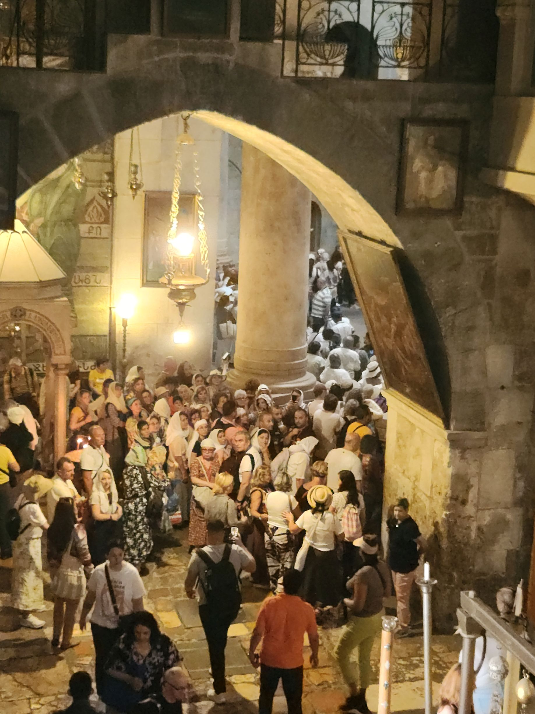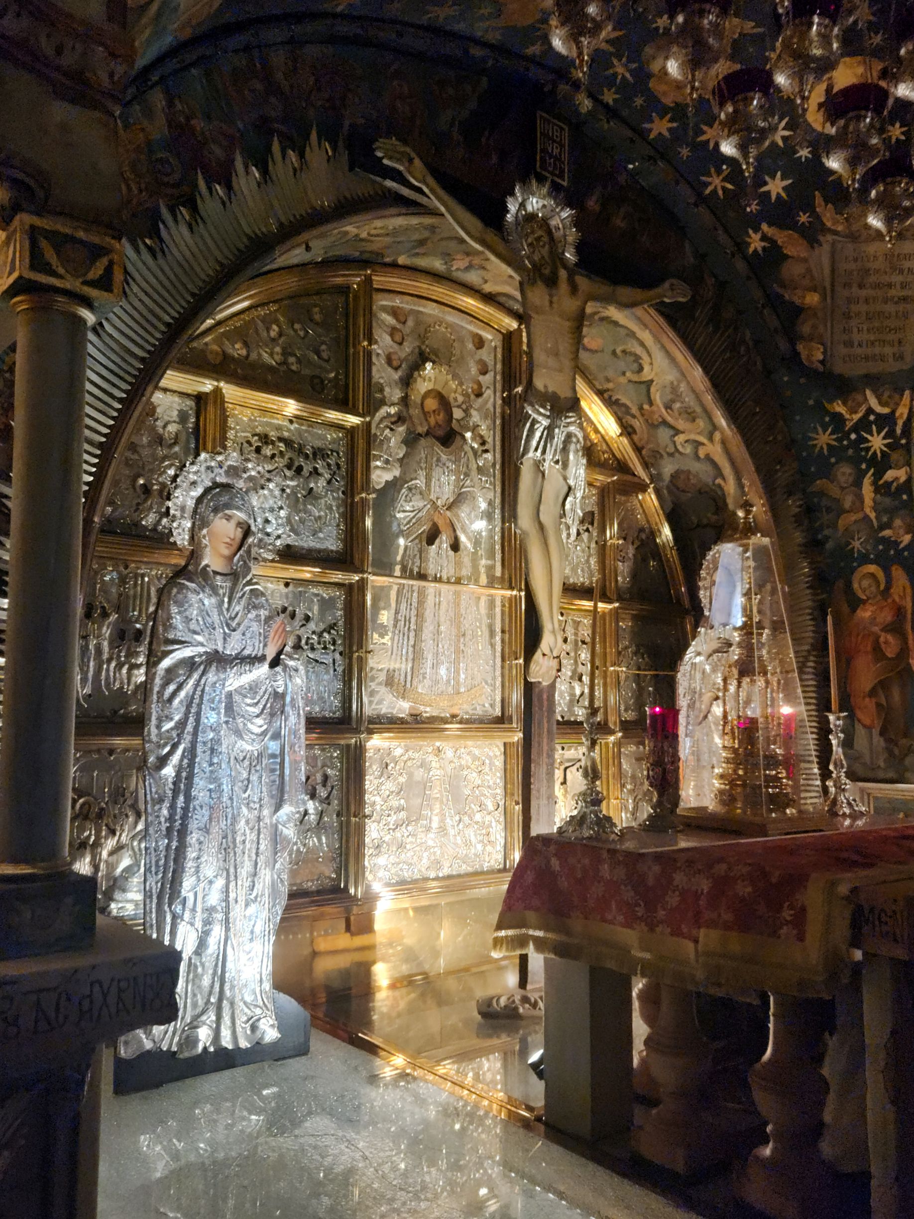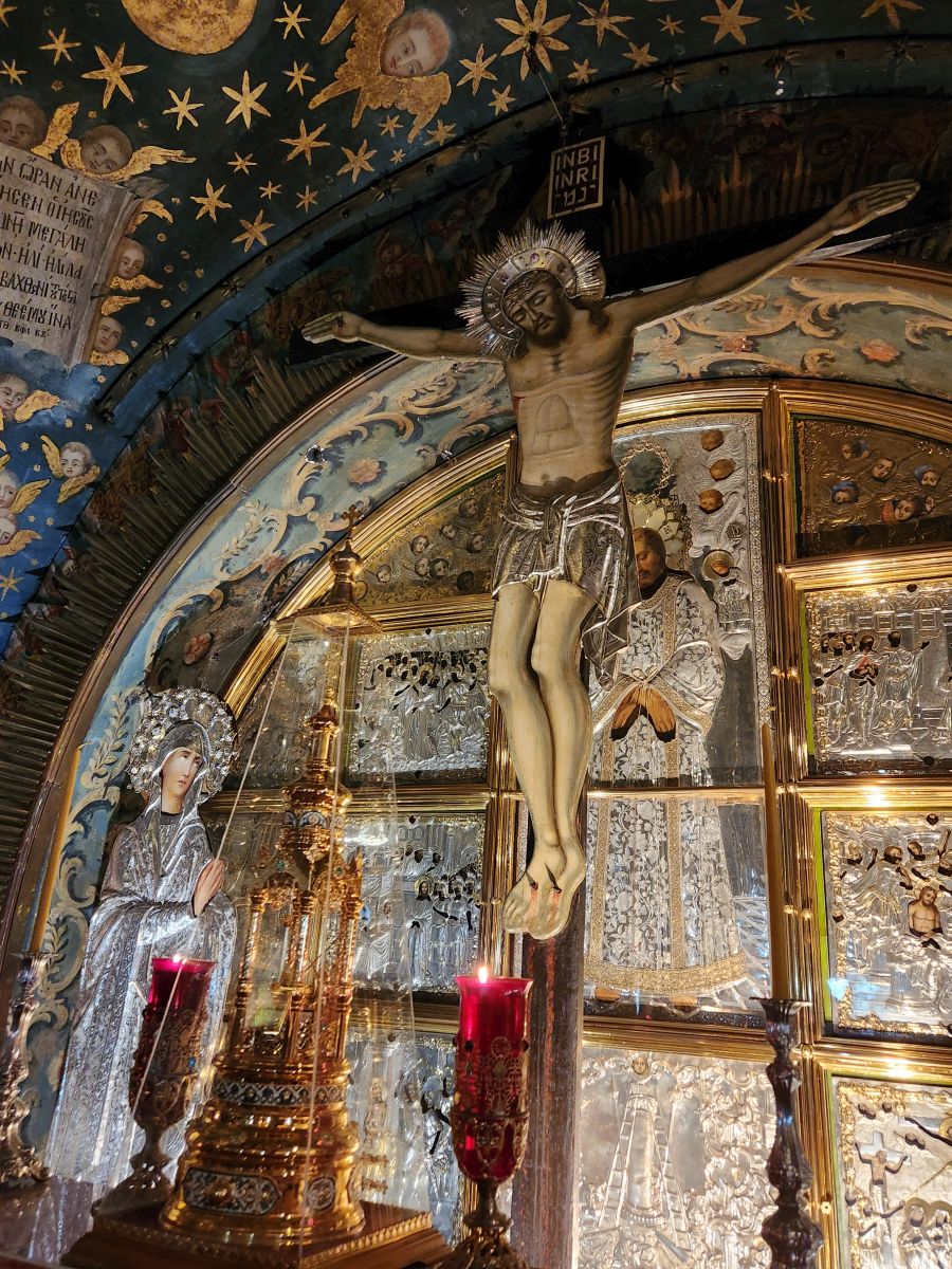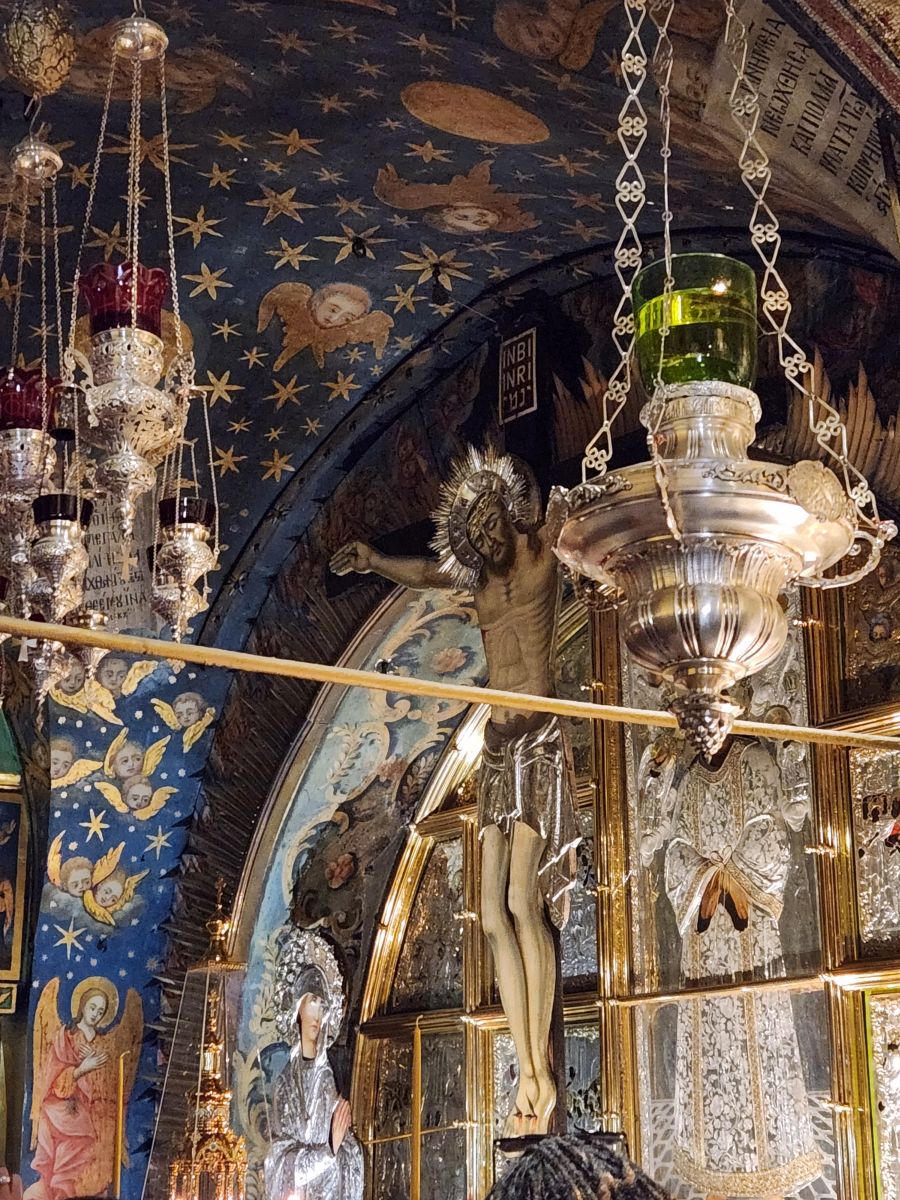 And then we are in the Church. Oh lord (yeah, pun intended) if we thought it was crowded out there? Oh no. In here – it is worth your life just to get onto the staircase to go upstairs to the Altar that has been erected over the place where Jesus on the cross was placed. The chapel up here is gorgeous, with immense amounts of gold and silver and mosaics depicting more Stations of the Cross. But trying to see it without being smothered or trampled was a feat! We managed – and I even managed to get all the way to the altar and get underneath it for a photo of the cross location (quite the triumph!) but then we just went to the back corner near the staircase to get out of the way. Crazy town in there!