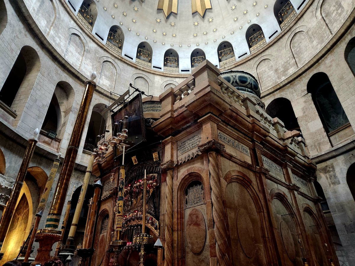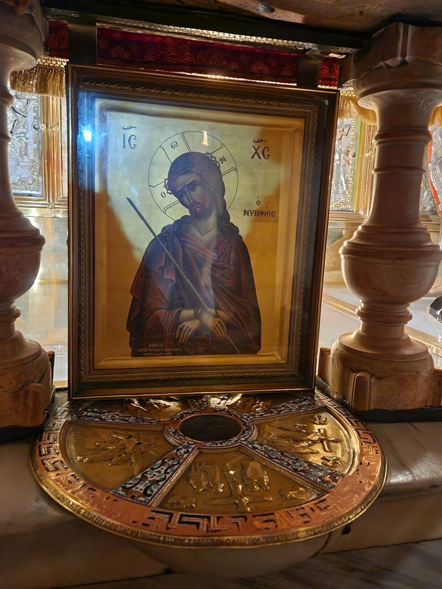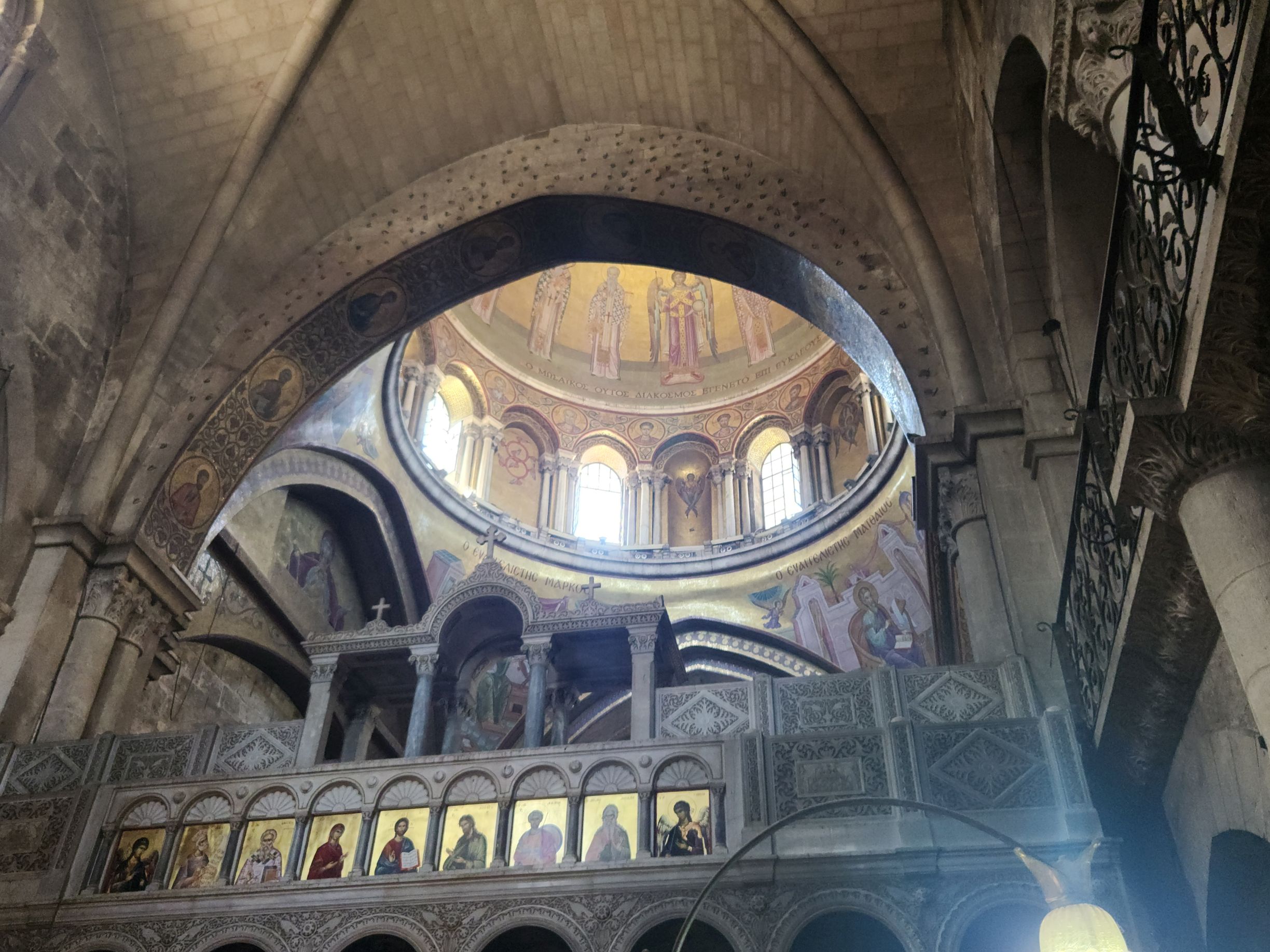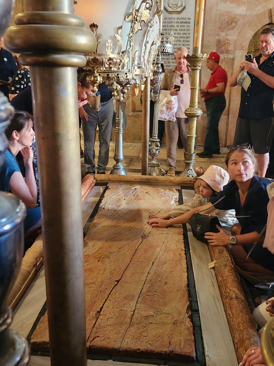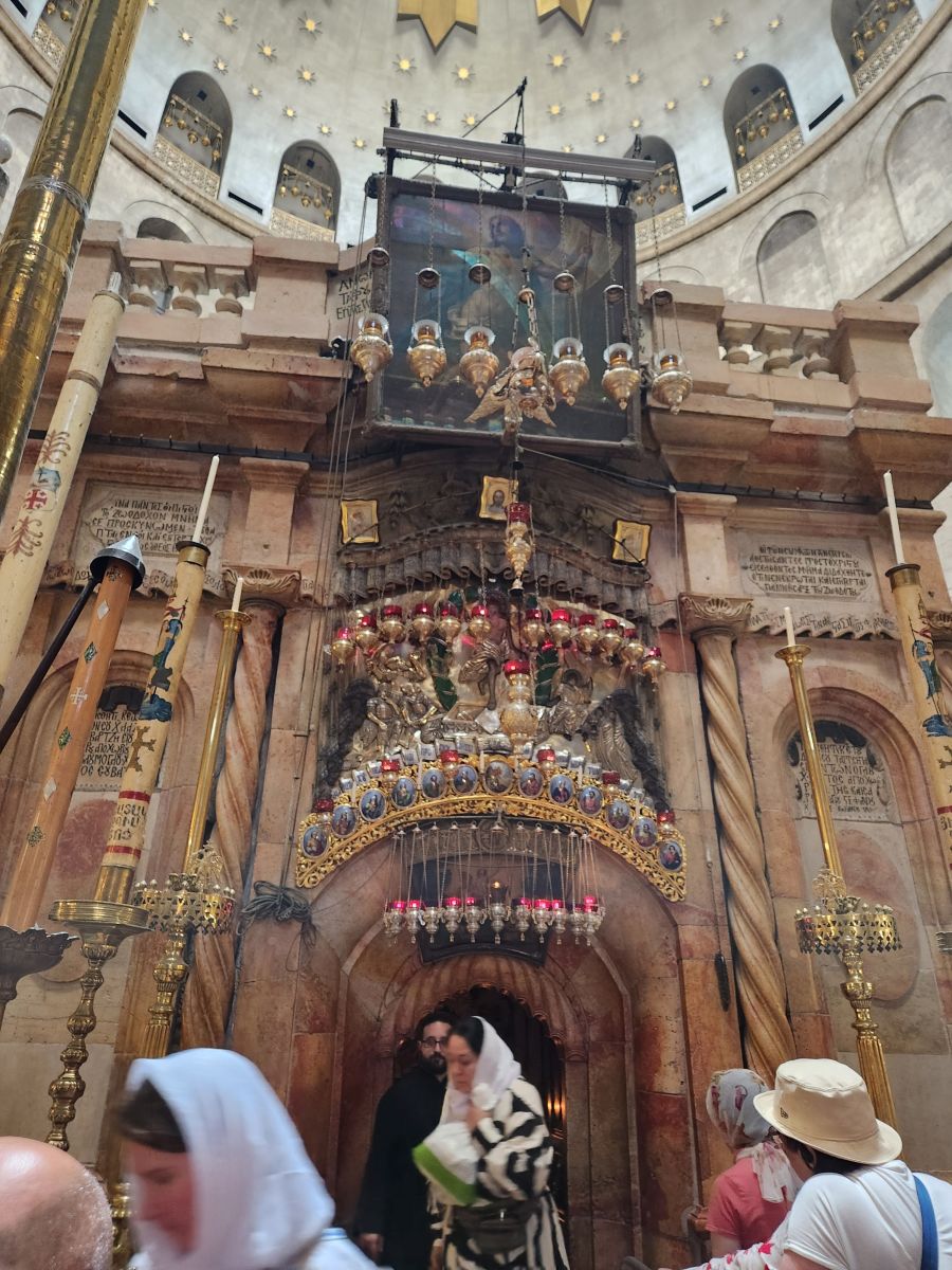 Making our way down the steps to the equally crazy crowded main floor, we stop to look at the stone where Jesus was washed and prepared for burial. The stone has rose oil rubbed into it, and when you rub your hand over it, you can smell it. There are beautiful cupolas and mosaics and hanging lanterns all over.