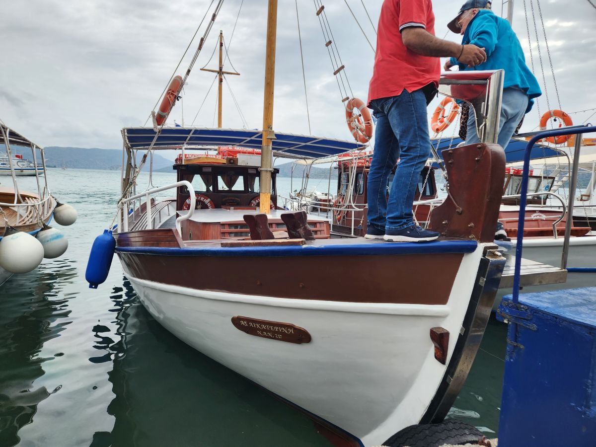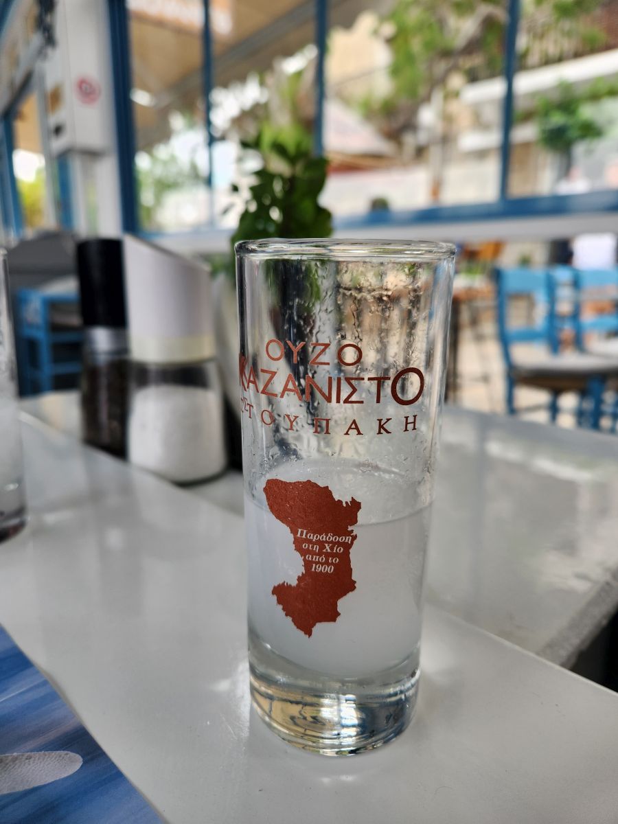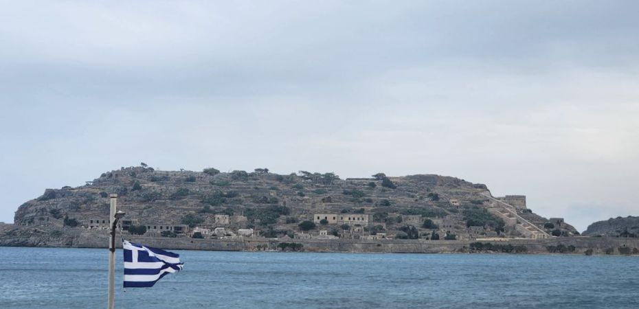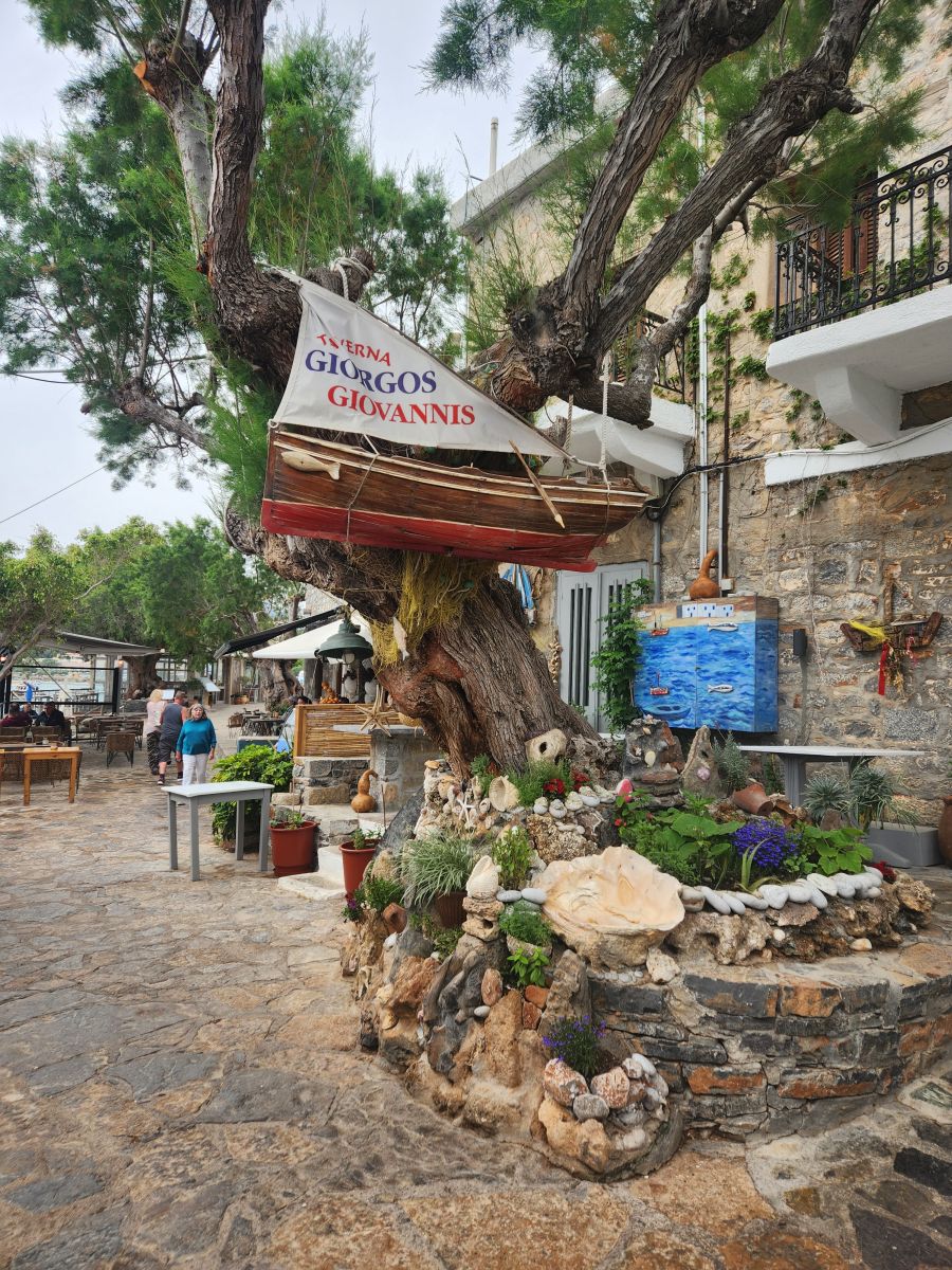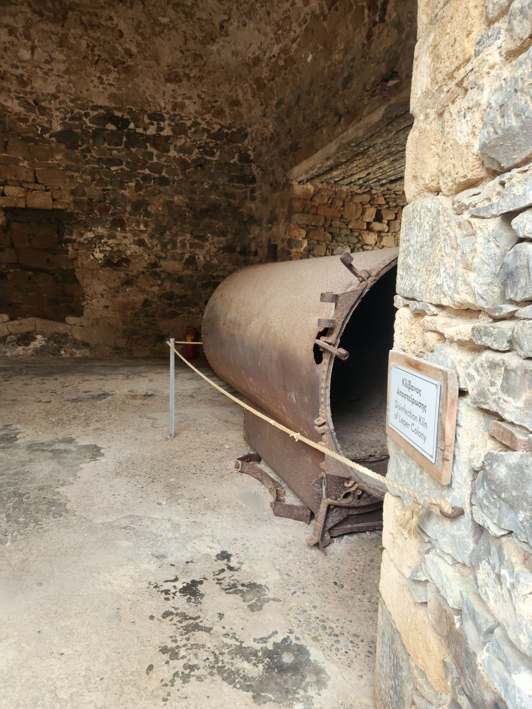 We make our way to the old port and dock which faces Plaka, where we will have our lunch, a mere 5 minute boat ride away. This is the pier where family members could come to visit their loved ones here. We pass along the way, the disinfectant room where all visitors must pass before leaving the island. Ugh.