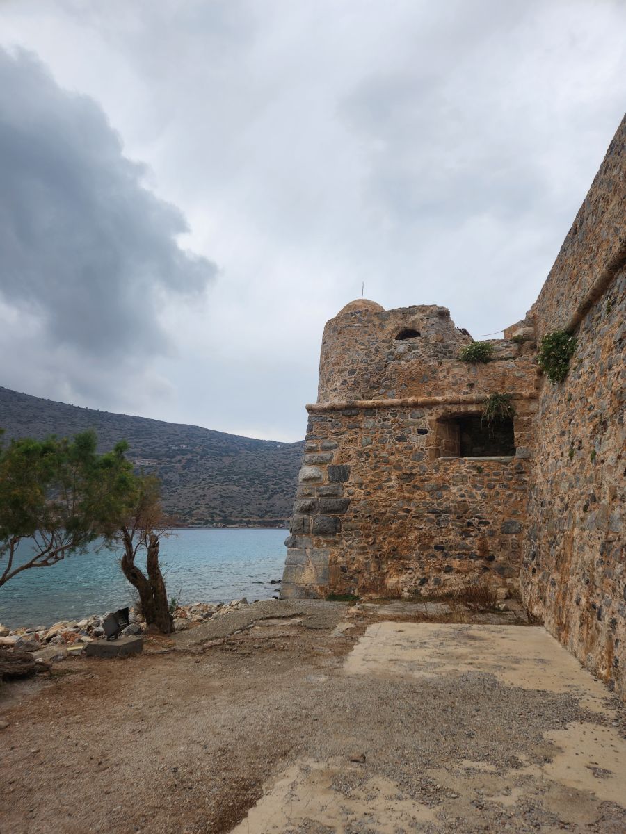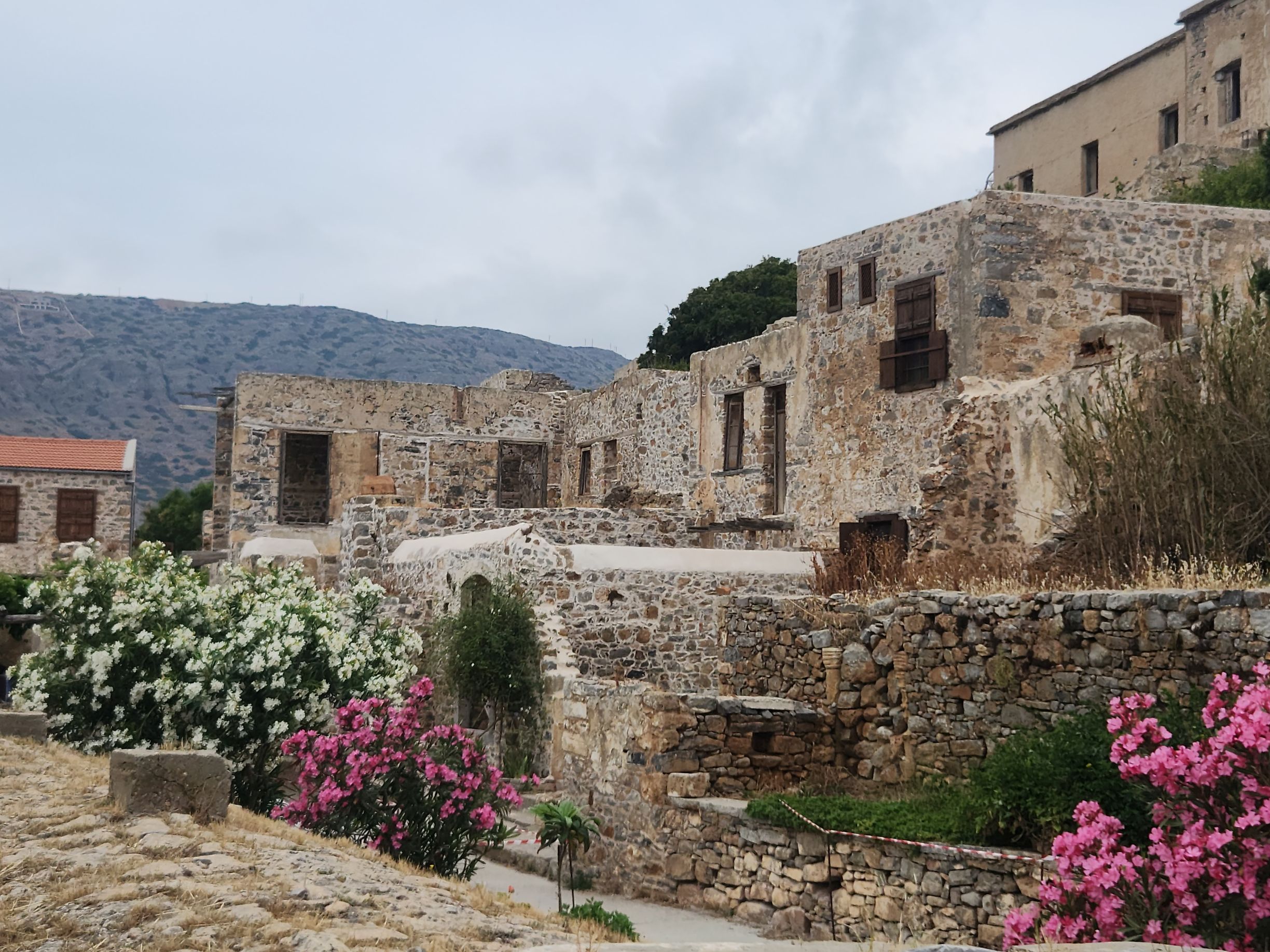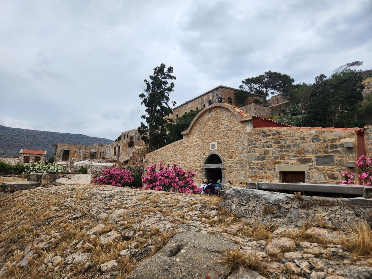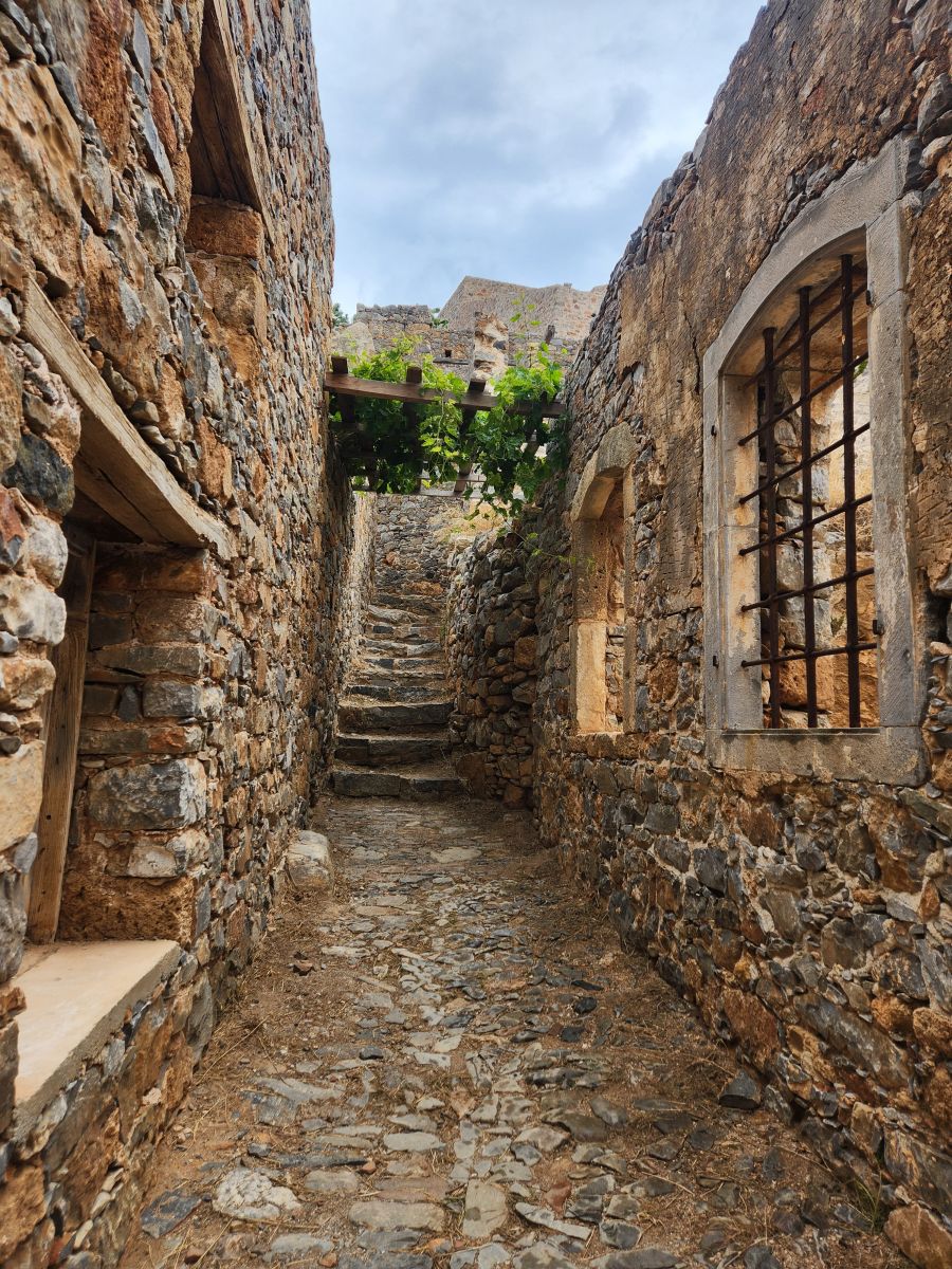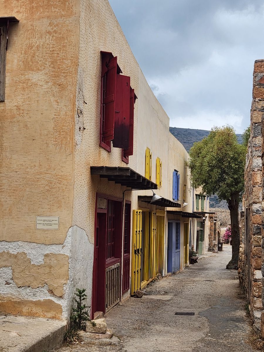 Arriving at Elounda harbor, we board the wooden sailing boat Katerina – my boat! – which ferries us 20 minutes over the protected bay to Spinalonga itself. The island is teeny – with the huge fortress on the upper levels guarding the island. We begin our tour walking through a tunnel cut from the mountain rock, then begin our circumnavigation of what is essential the ruins and recreation of the Leper colony that was here for years until being disbanded in 1957.