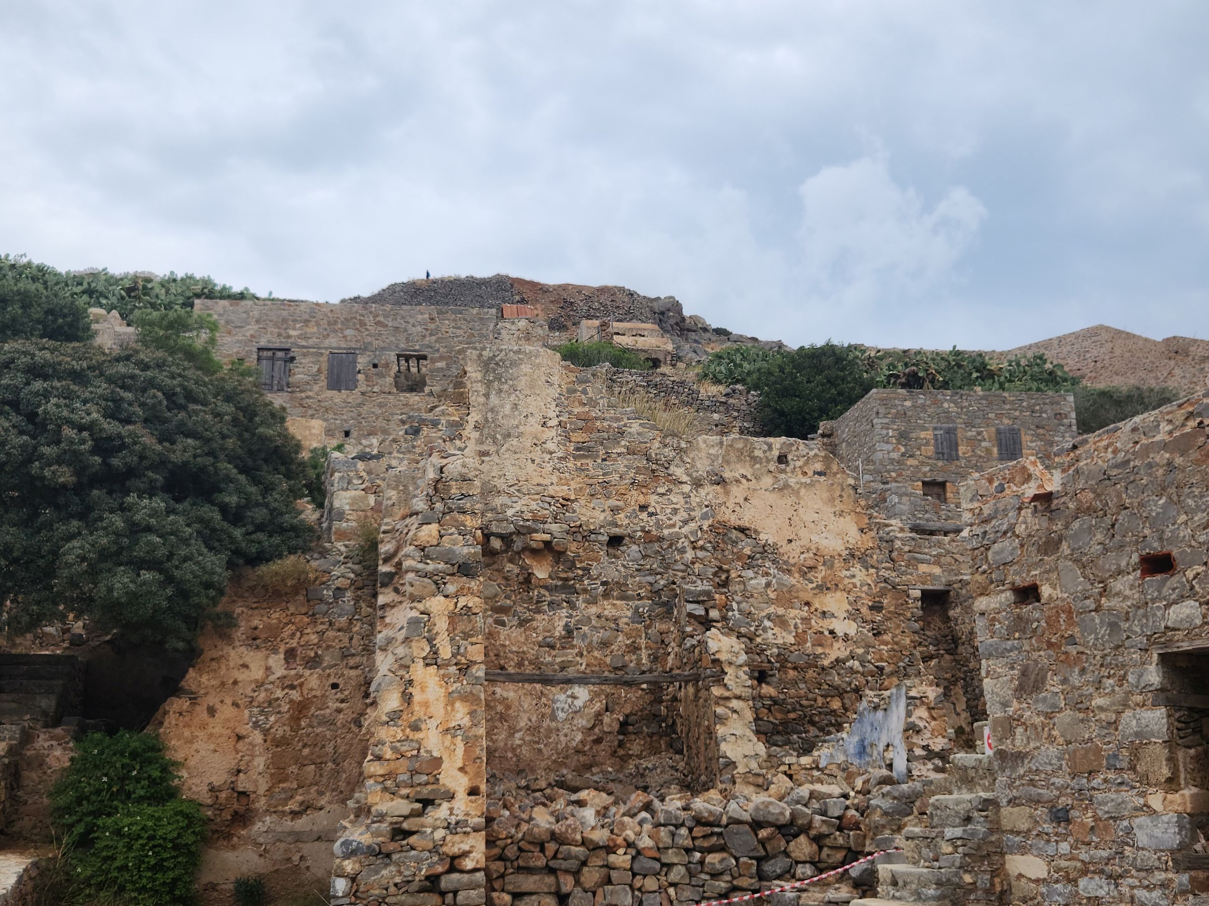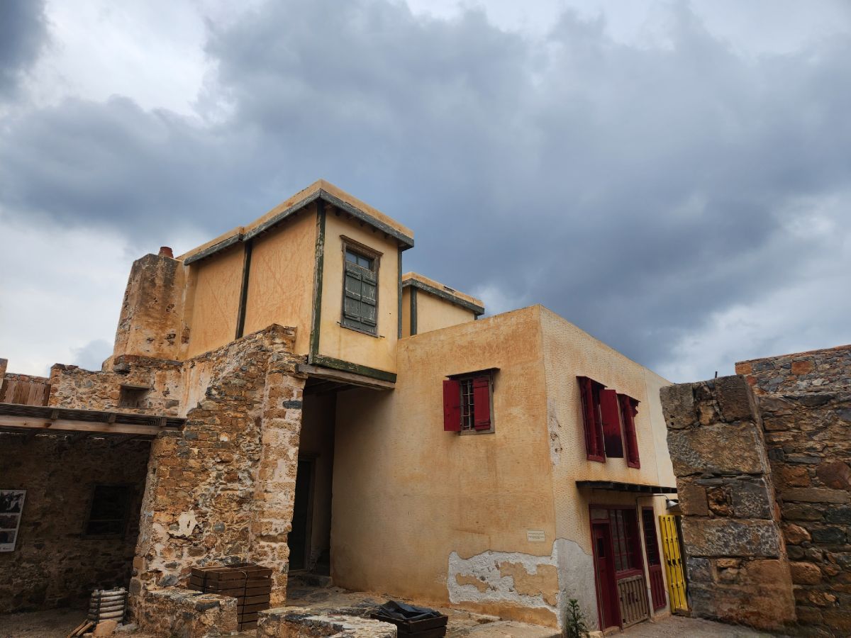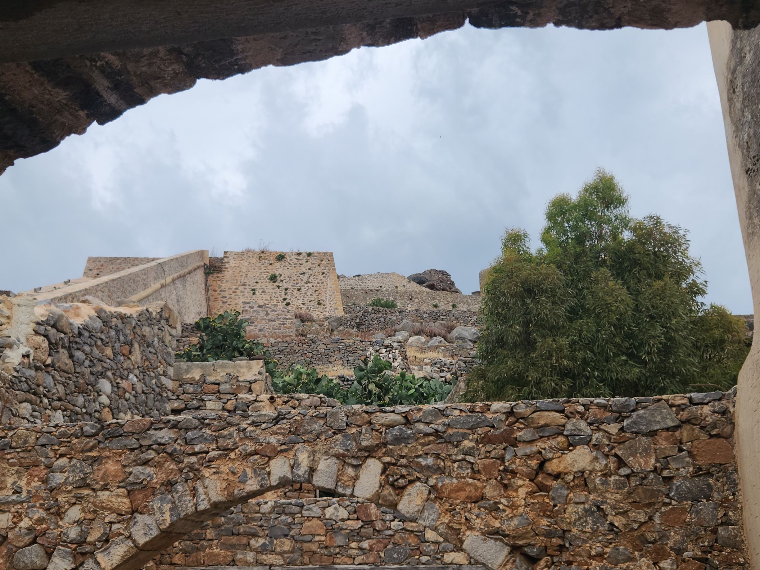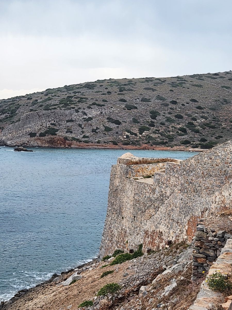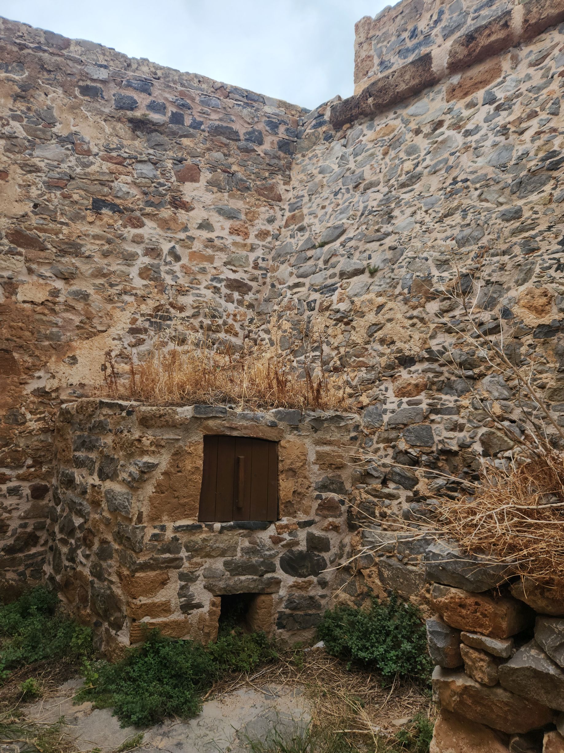Arriving at Elounda harbor, we board the wooden sailing boat Katerina – my boat! – which ferries us 20 minutes over the protected bay to Spinalonga itself. The island is teeny – with the huge fortress on the upper levels guarding the island. We begin our tour walking through a tunnel cut from the mountain rock, then begin our circumnavigation of what is essential the ruins and recreation of the Leper colony that was here for years until being disbanded in 1957.