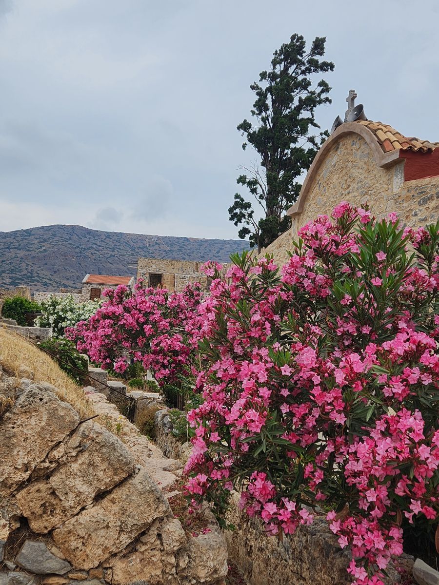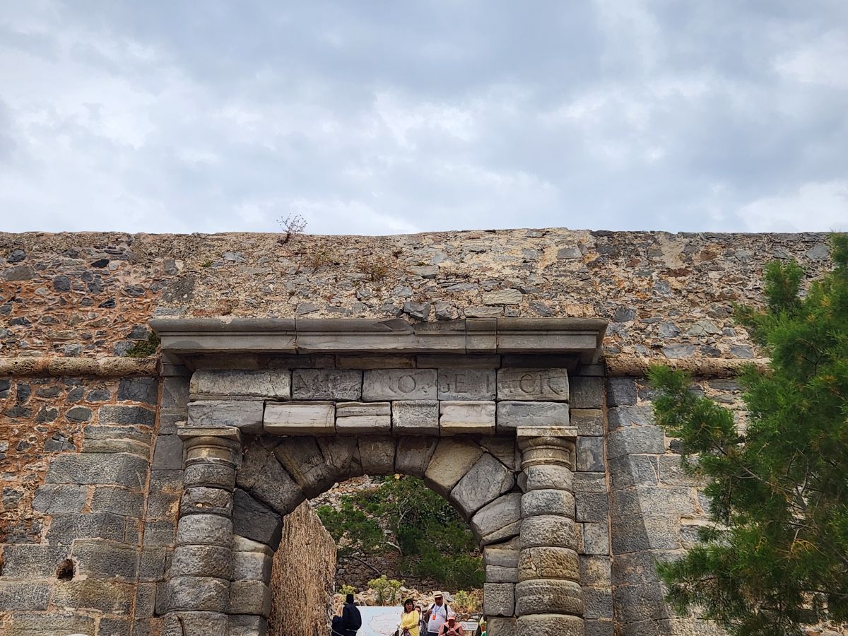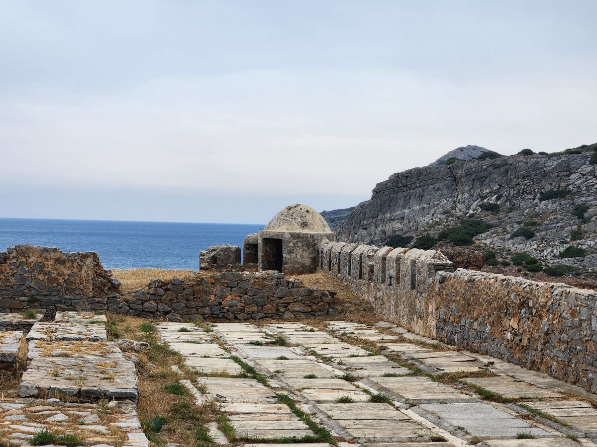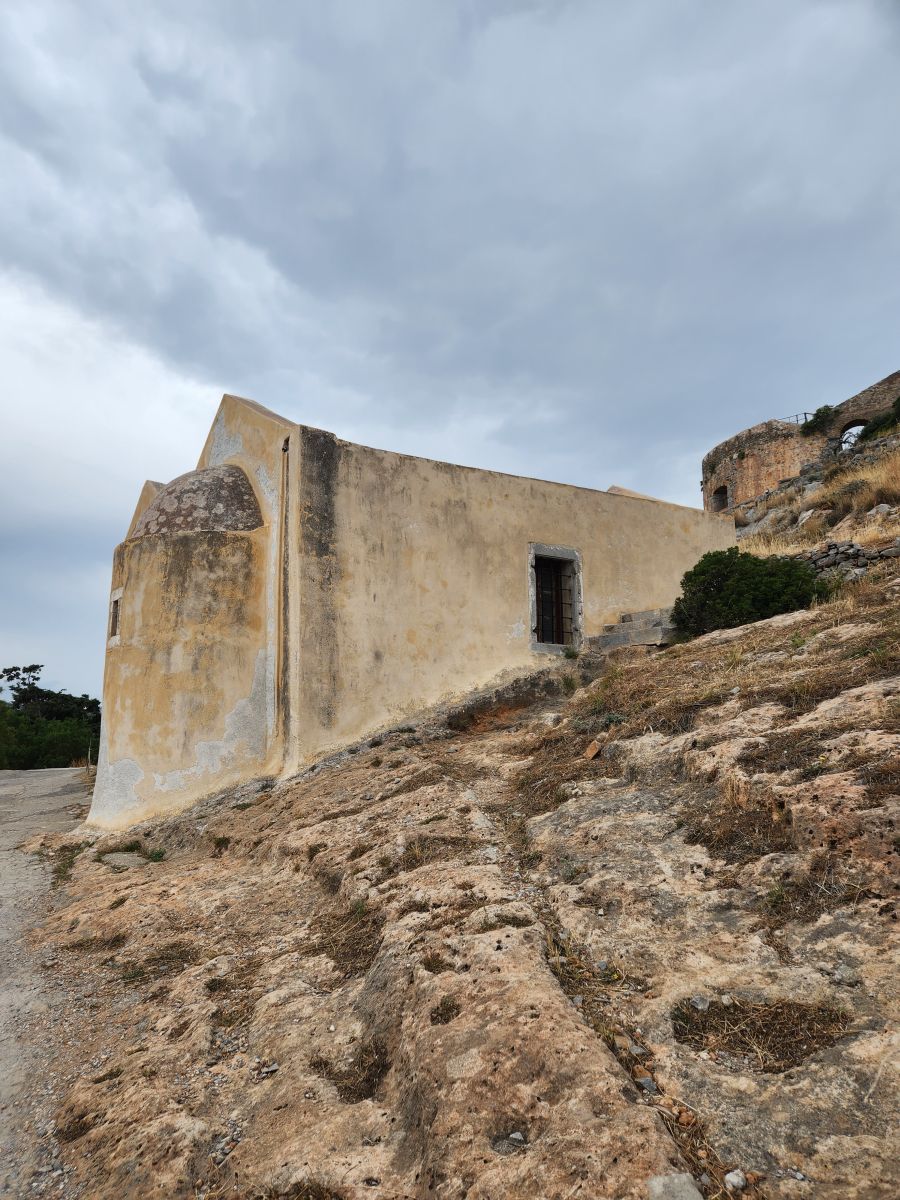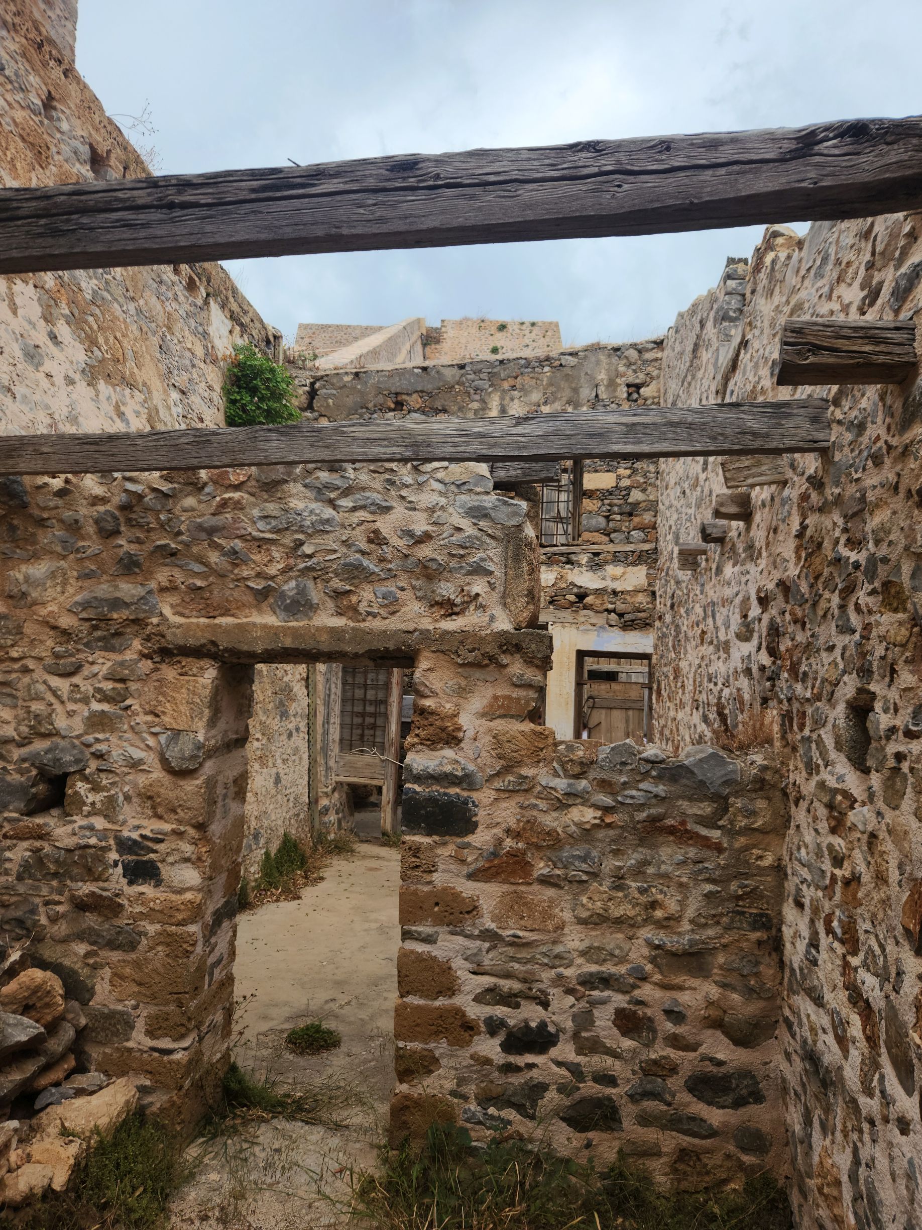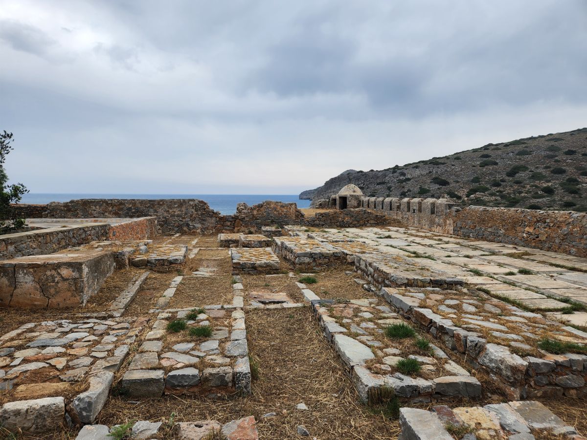 Arriving at Elounda harbor, we board the wooden sailing boat Katerina – my boat! – which ferries us 20 minutes over the protected bay to Spinalonga itself. The island is teeny – with the huge fortress on the upper levels guarding the island. We begin our tour walking through a tunnel cut from the mountain rock, then begin our circumnavigation of what is essential the ruins and recreation of the Leper colony that was here for years until being disbanded in 1957.