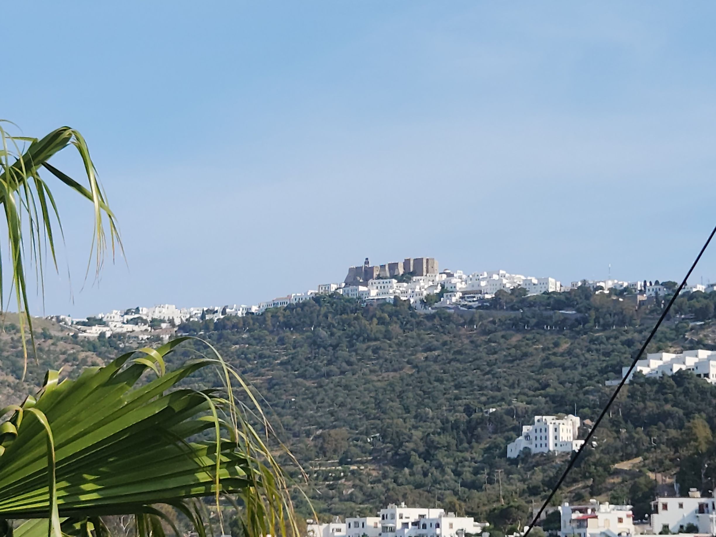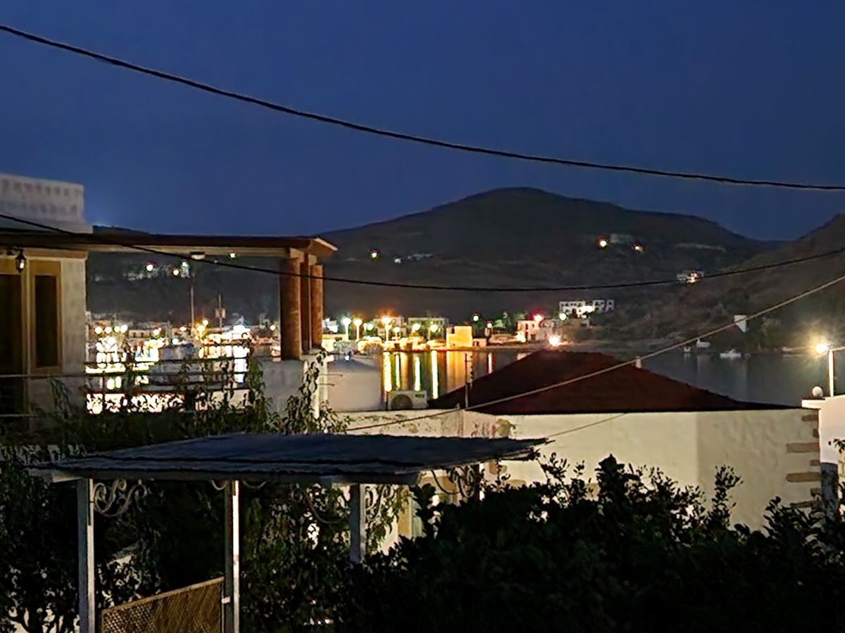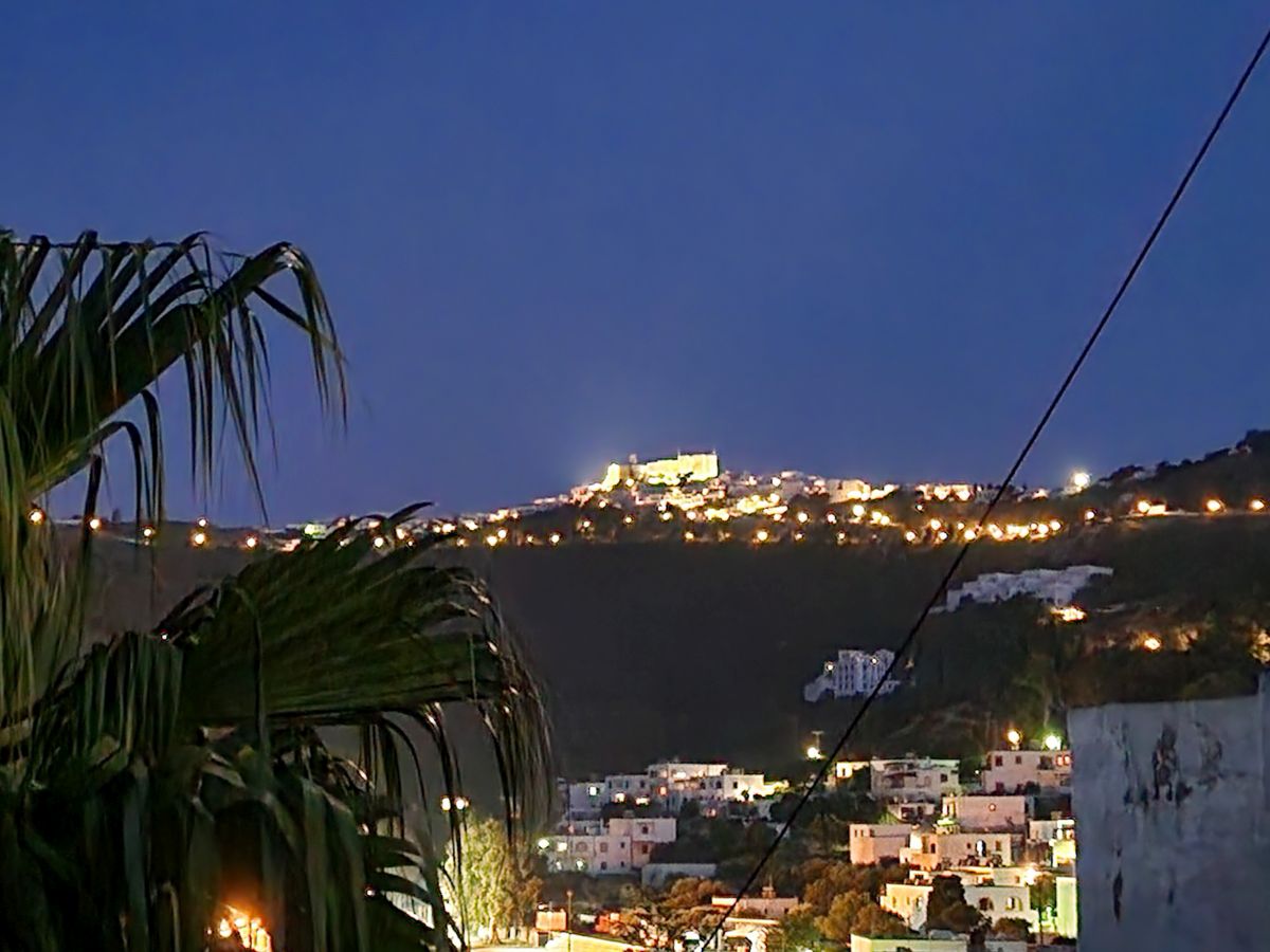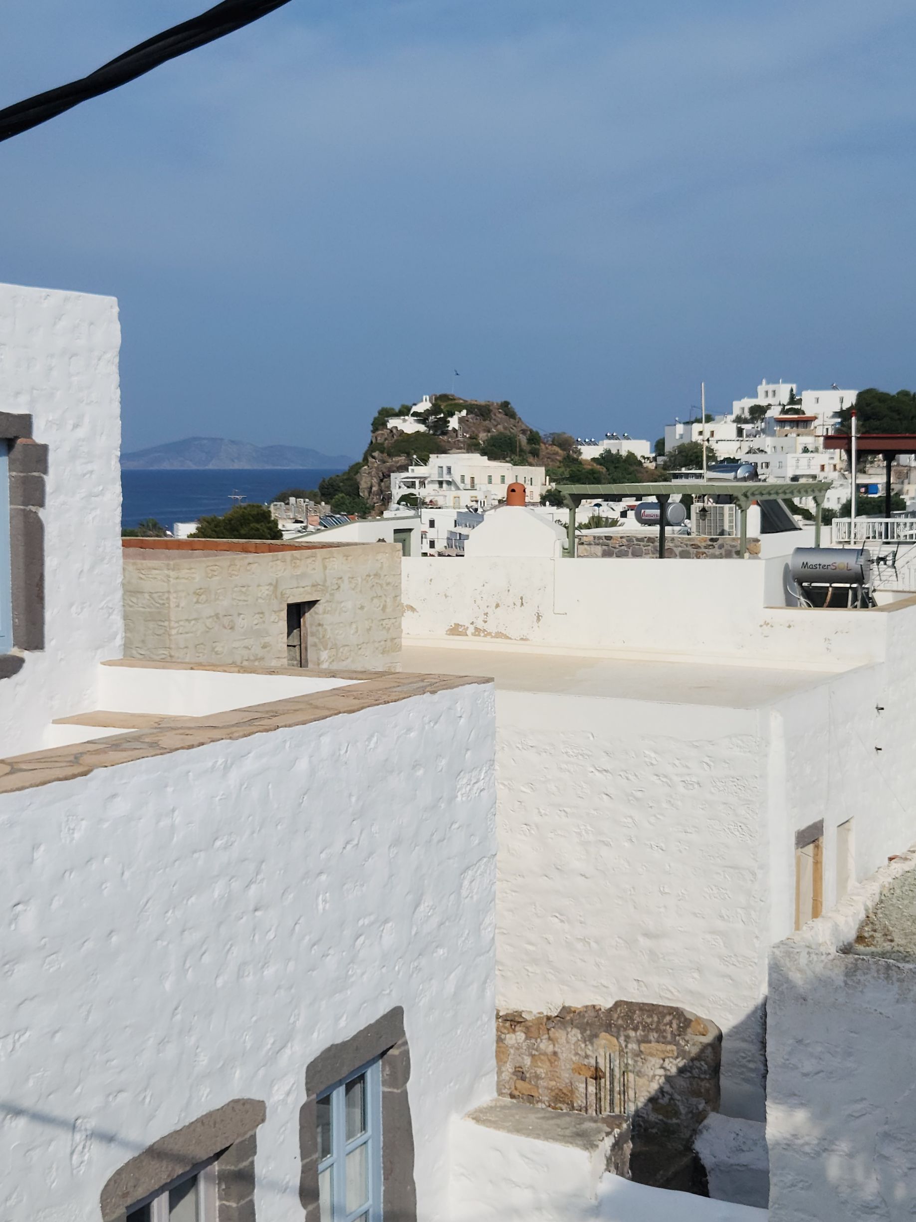 Then we hit the grocery store to stock up on supplies, and spend the rest of the afternoon peacefully in the beautiful garden and up on the rooftop staring out at the gorgeous view of the Skala, the harbor and the Monastery up on the hill in Hora. Nothing wrong with that!