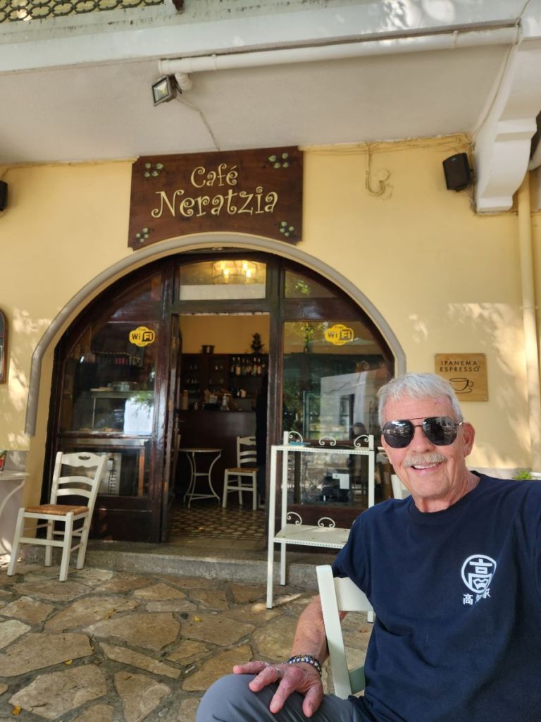We walk down to the rental place we used before when we were in Kos and book a car from the same 2 folks as before – must be husband and wife – and are so sweet. Now we are set! Walking back down the shore line, we find the port, scope out where we need to be, then reverse course back into town for a coffee. We end up at the same place where we had our evening drinks last year when we were on the cruise! Too funny!