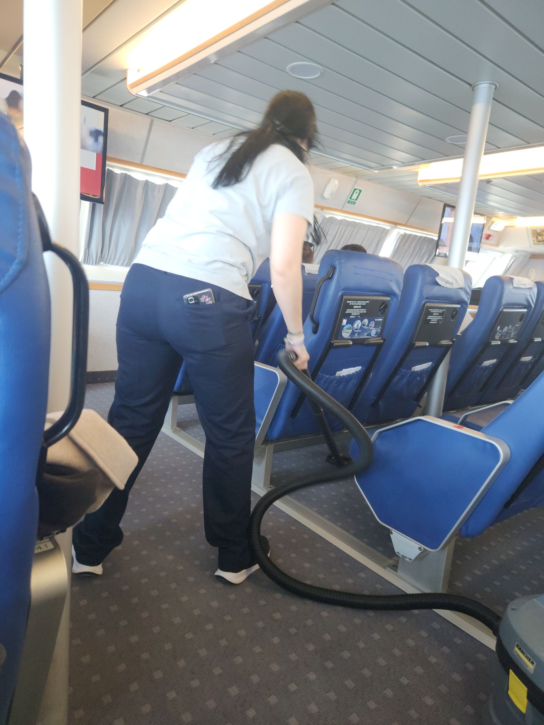 We spend the 2 ½ hours , reading, blogging, watching different islands slide by, stopping at a few, watching the cleaner come through the cabin after every port – she’s amazing! Vacuuming, changing out head rest slip covers and whatever is in the seat backs. Crazy efficient!