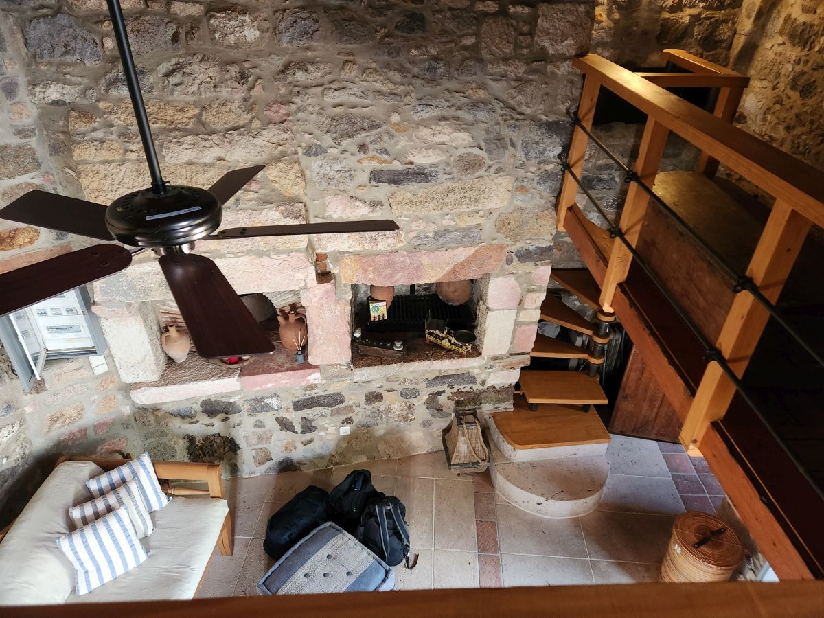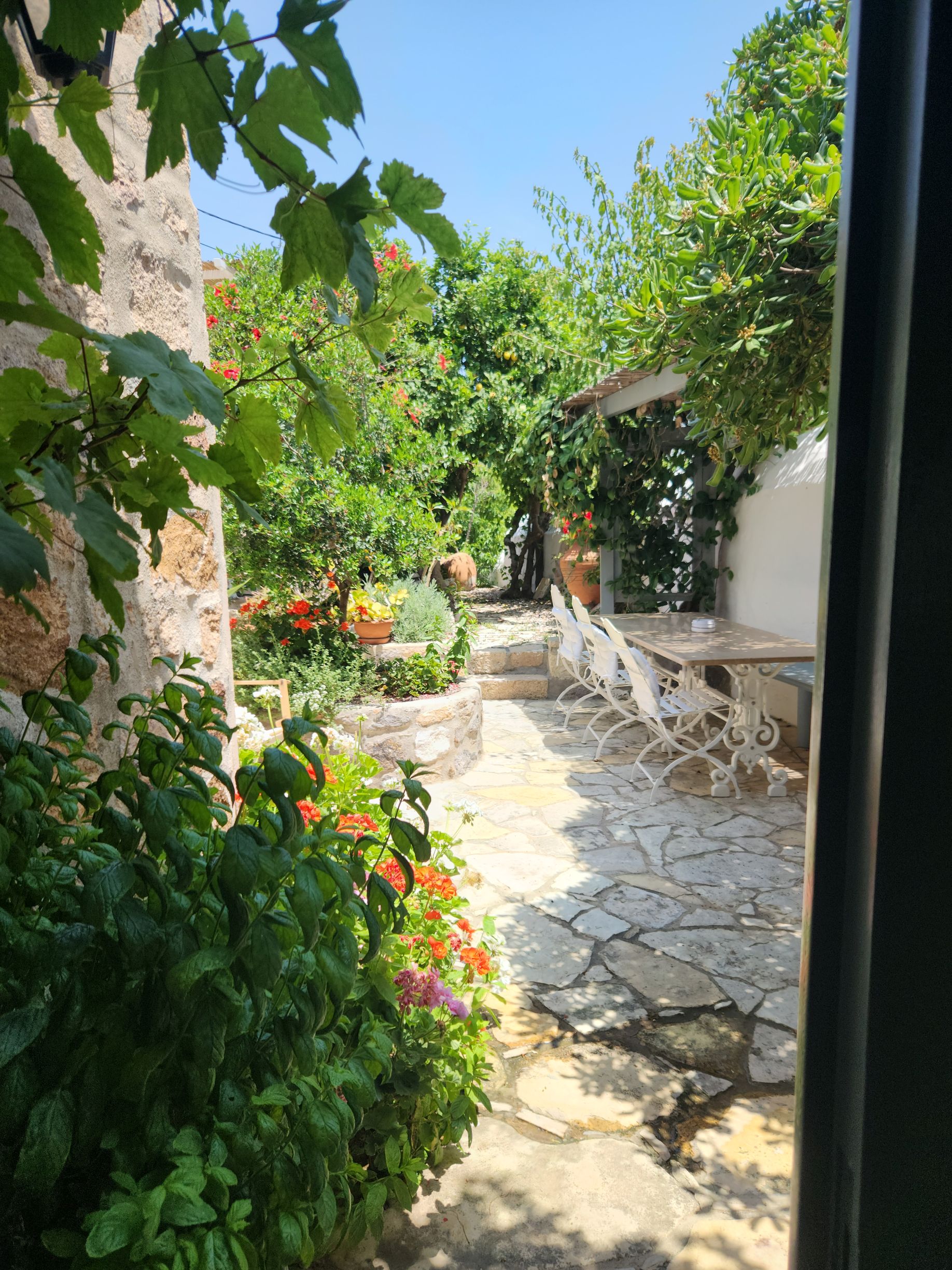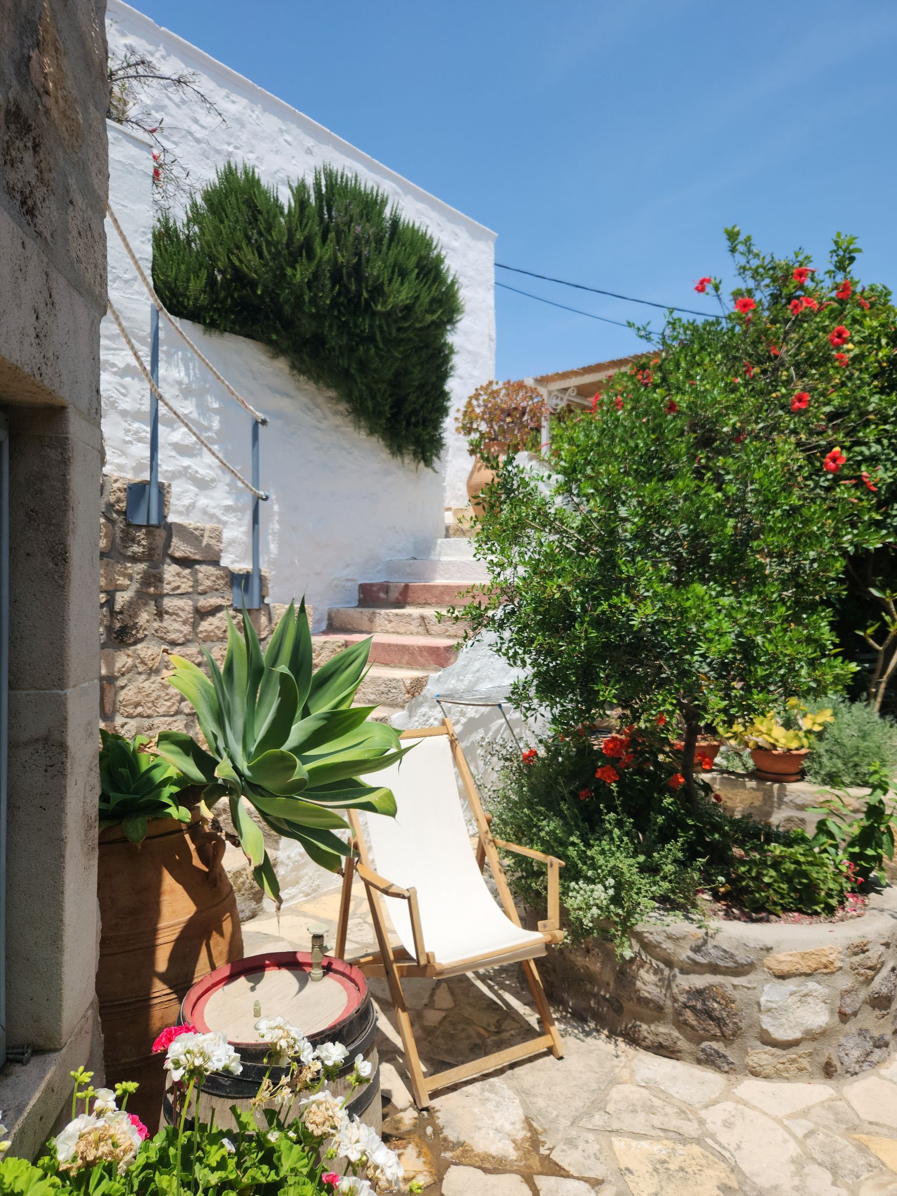 It is everything as advertised, looking just like the photos online. A gorgeous garden, sweet little open plan living, dining and kitchen area, then that incredibly cool loft with winding wooden staircase that holds the bed. Plus the rooftop patio with umbrella, 2 recliners, one of those hanging nest type chairs and a little café table with chairs. Perfect! And all right in the heart of the Skala. We’re so excited for the next 4 days!