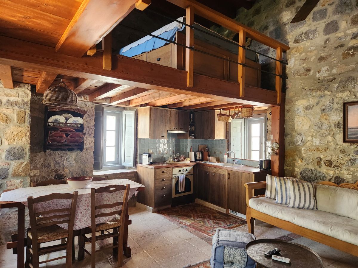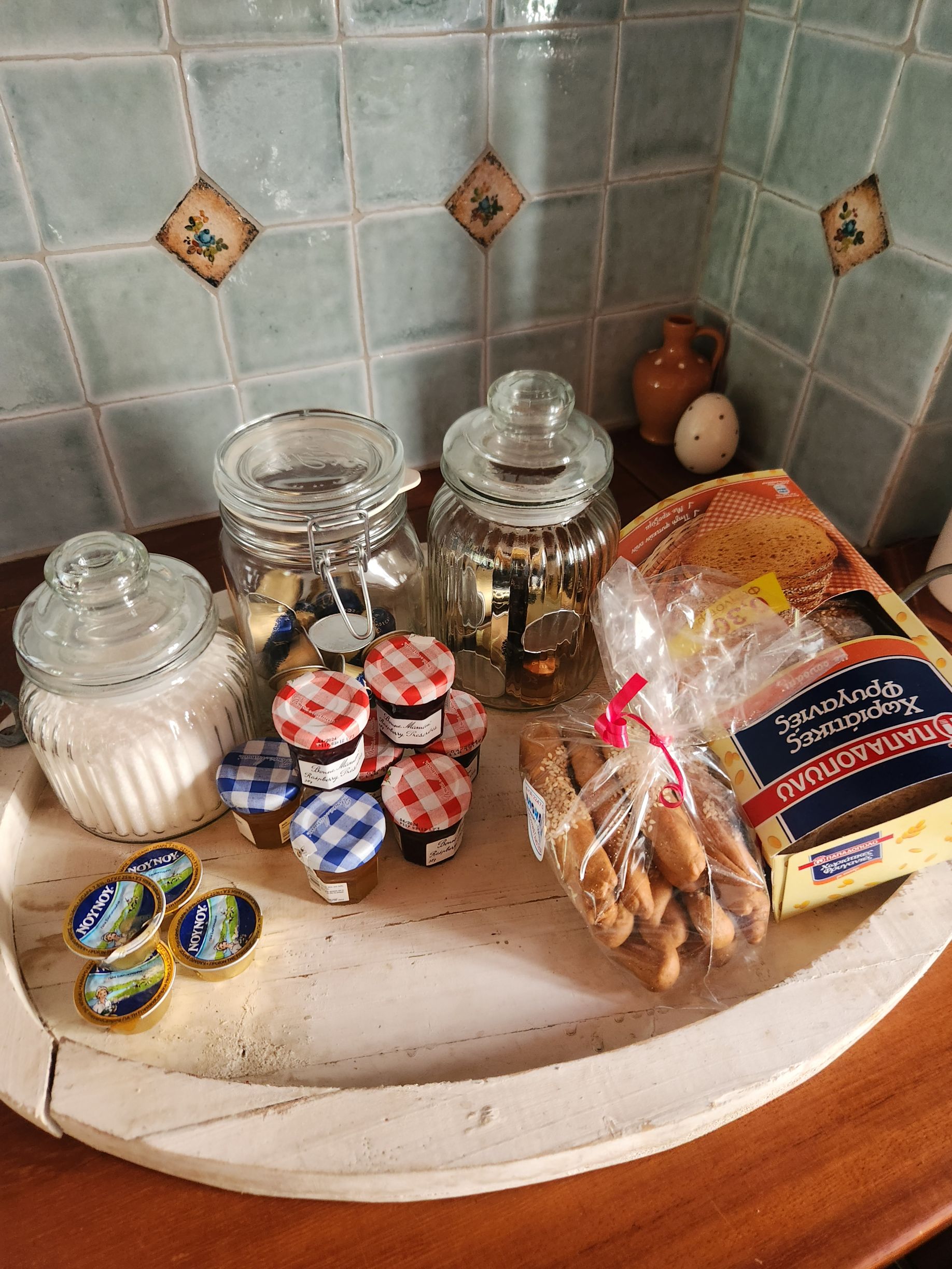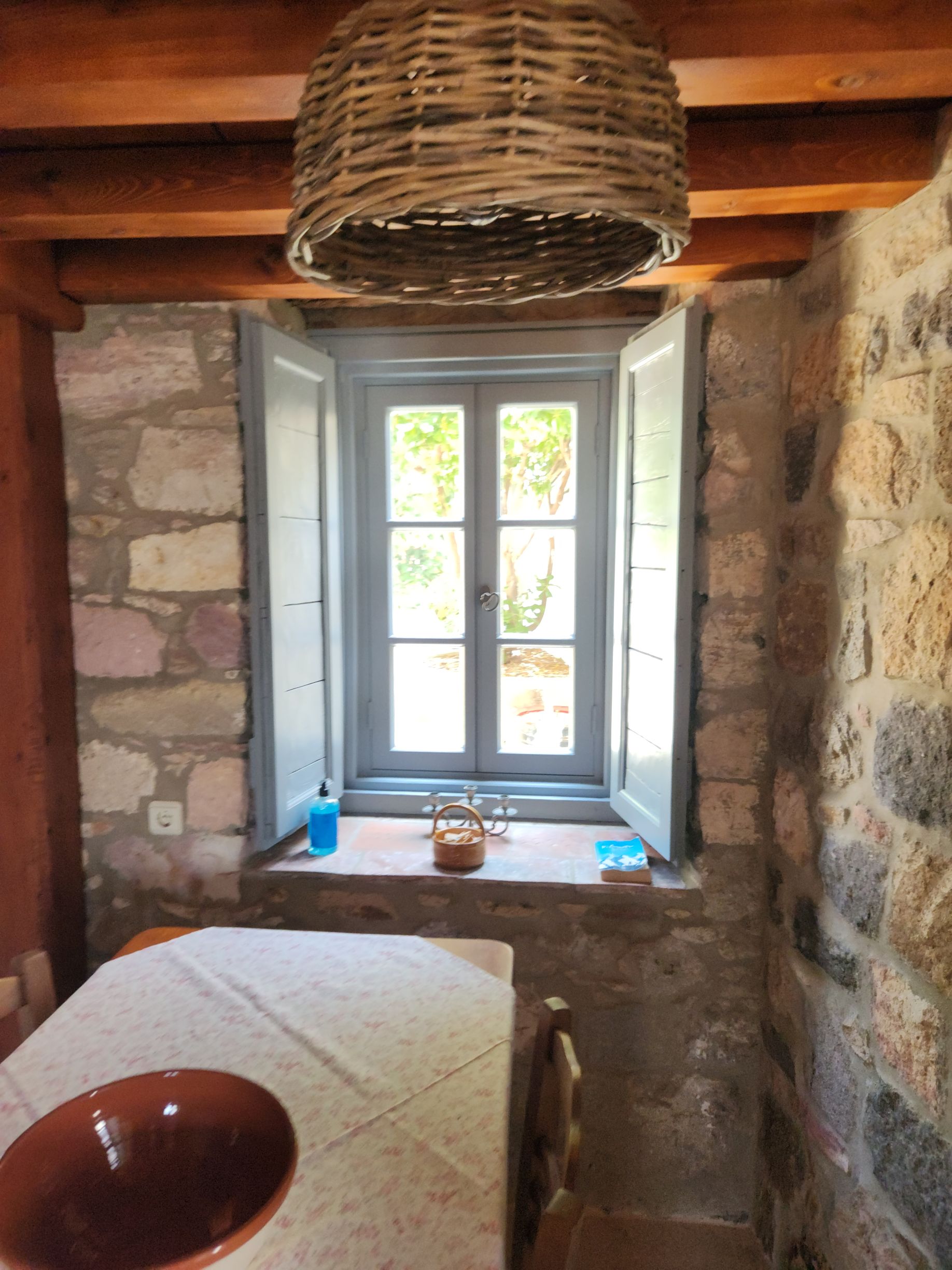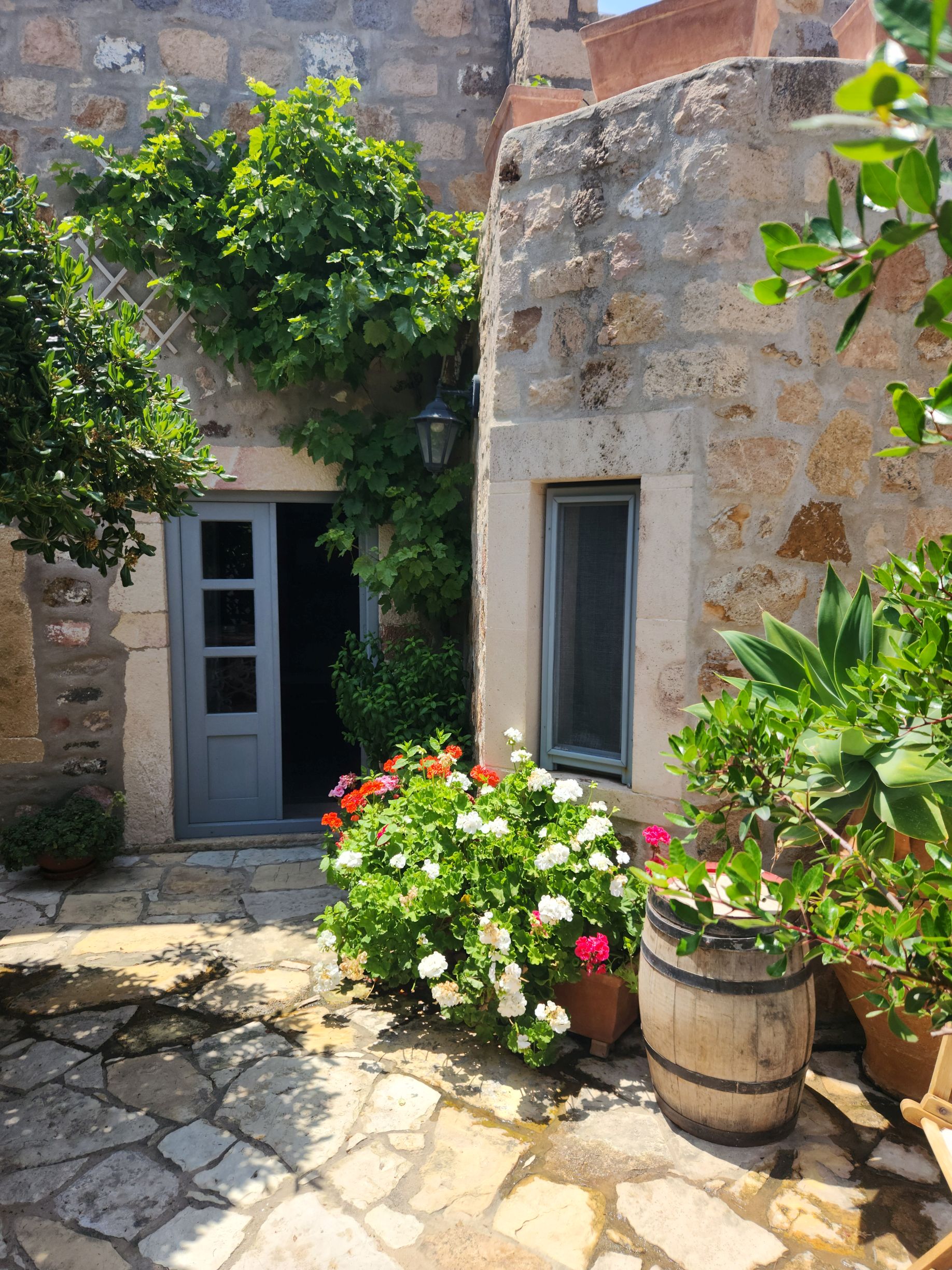 It is everything as advertised, looking just like the photos online. A gorgeous garden, sweet little open plan living, dining and kitchen area, then that incredibly cool loft with winding wooden staircase that holds the bed. Plus the rooftop patio with umbrella, 2 recliners, one of those hanging nest type chairs and a little café table with chairs. Perfect! And all right in the heart of the Skala. We’re so excited for the next 4 days!