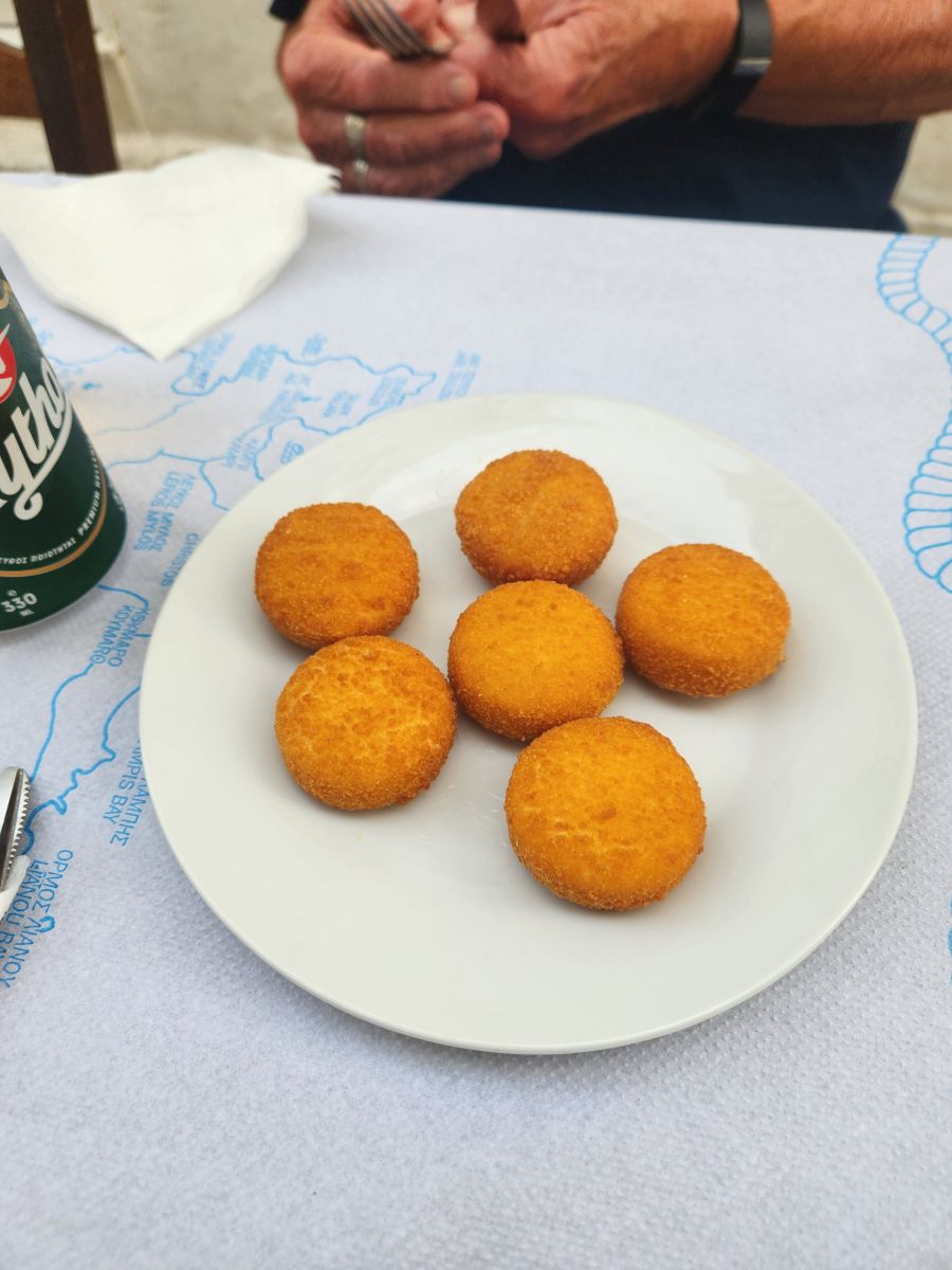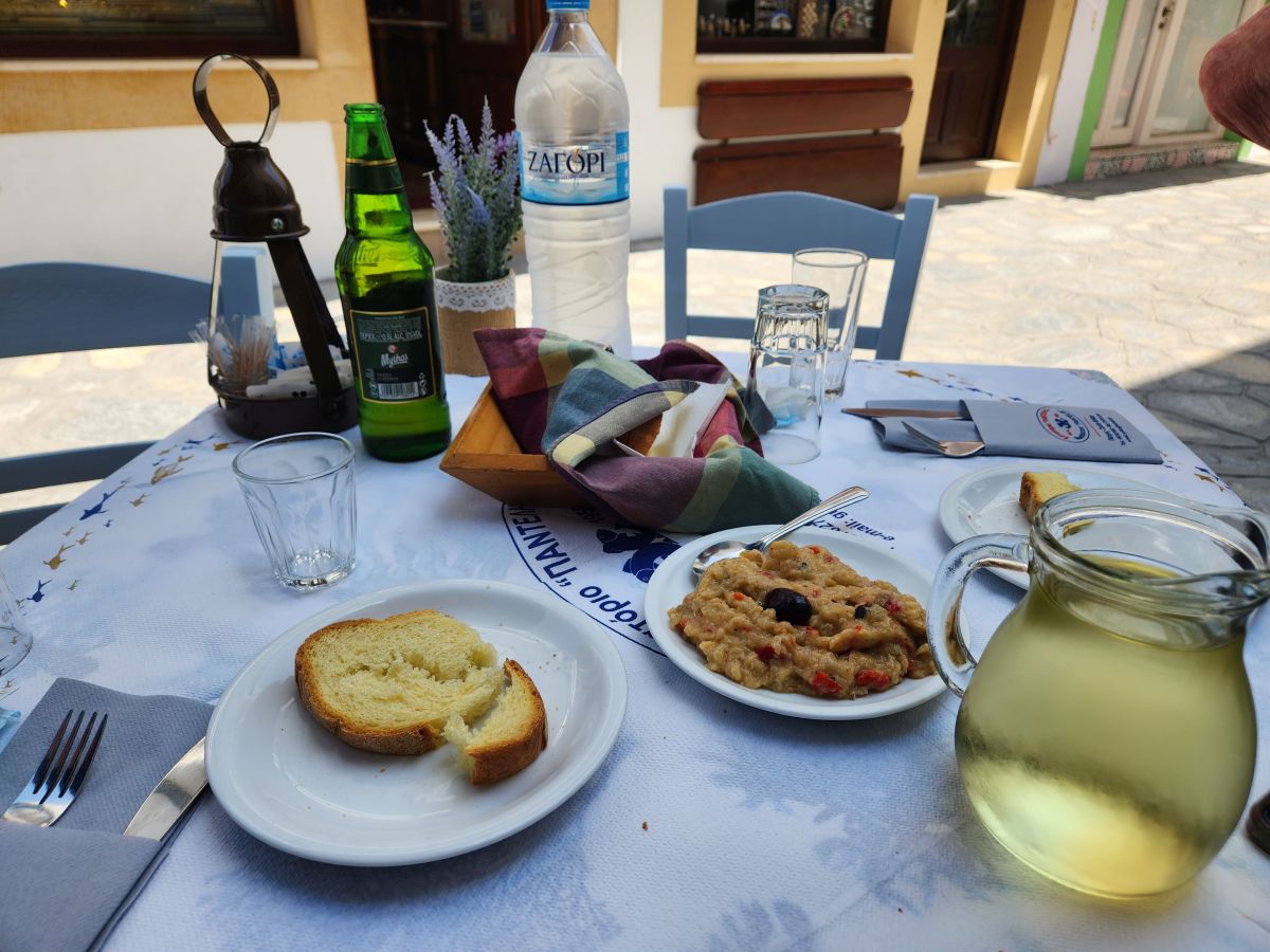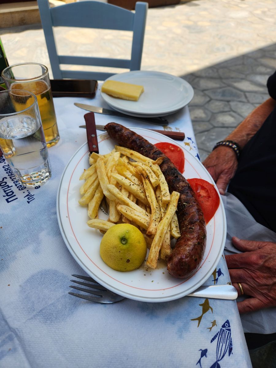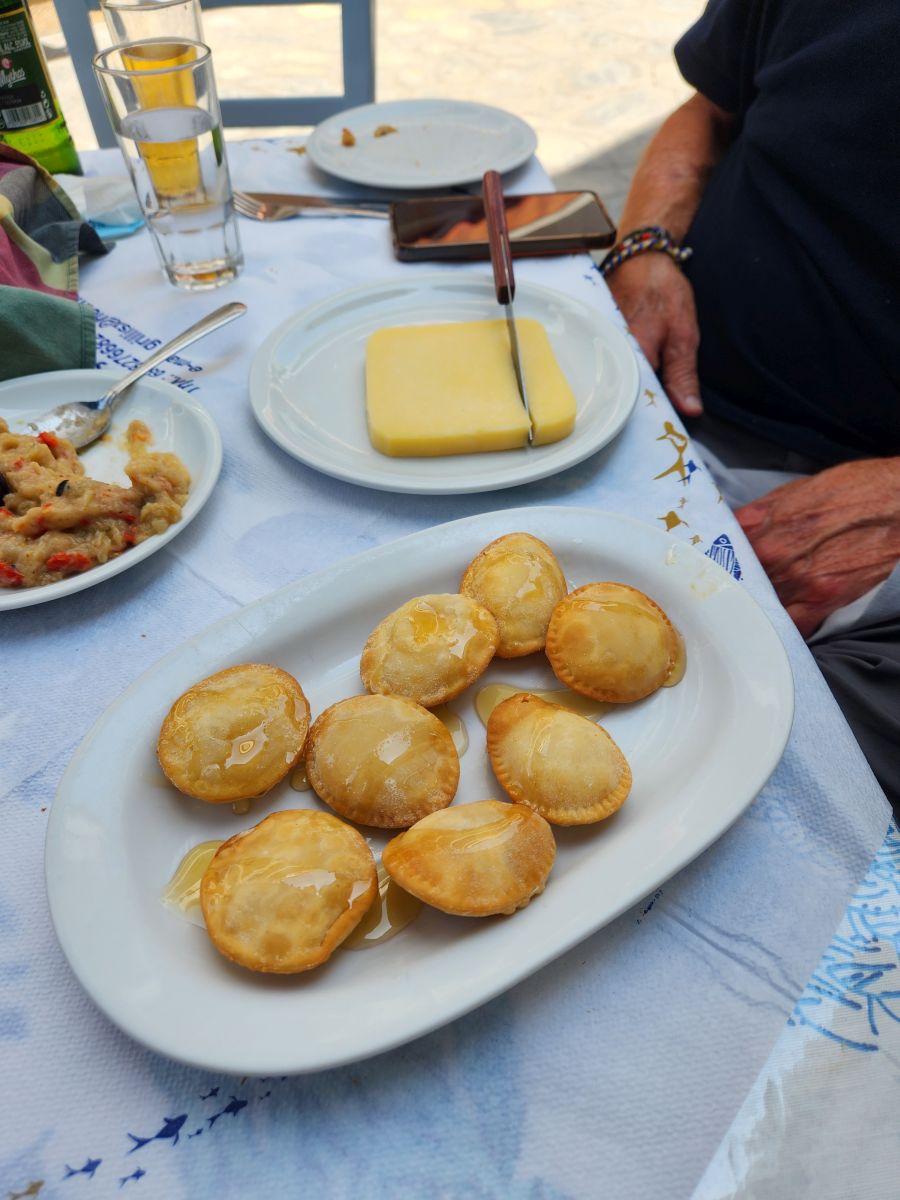 Back down on the main road through town, we grab a table at Pantelis, a seafood restaurant we wanted to try last year, but never managed to find the time. Well worth the wait! We had the best eggplant salad (think baba ghanoush, but different), these awesome little cheese pies with honey (OMG – out of this world!), the special local Kefalotiri cheese and a grilled sausage – all so yummy and so filling! Oh, and a big beer and a ½ liter jug of wine (6 euros, thank you very much!). Welcome to the island!