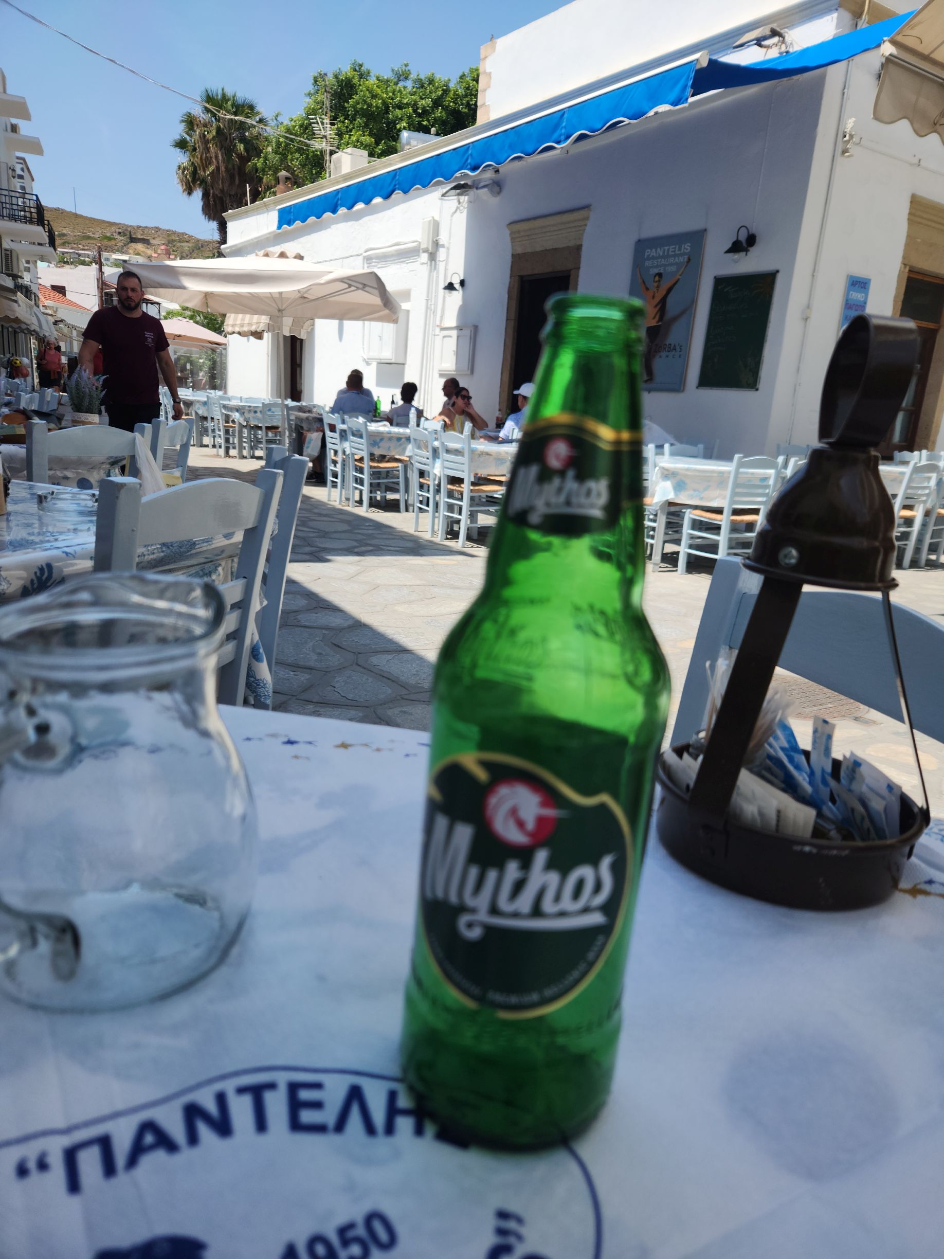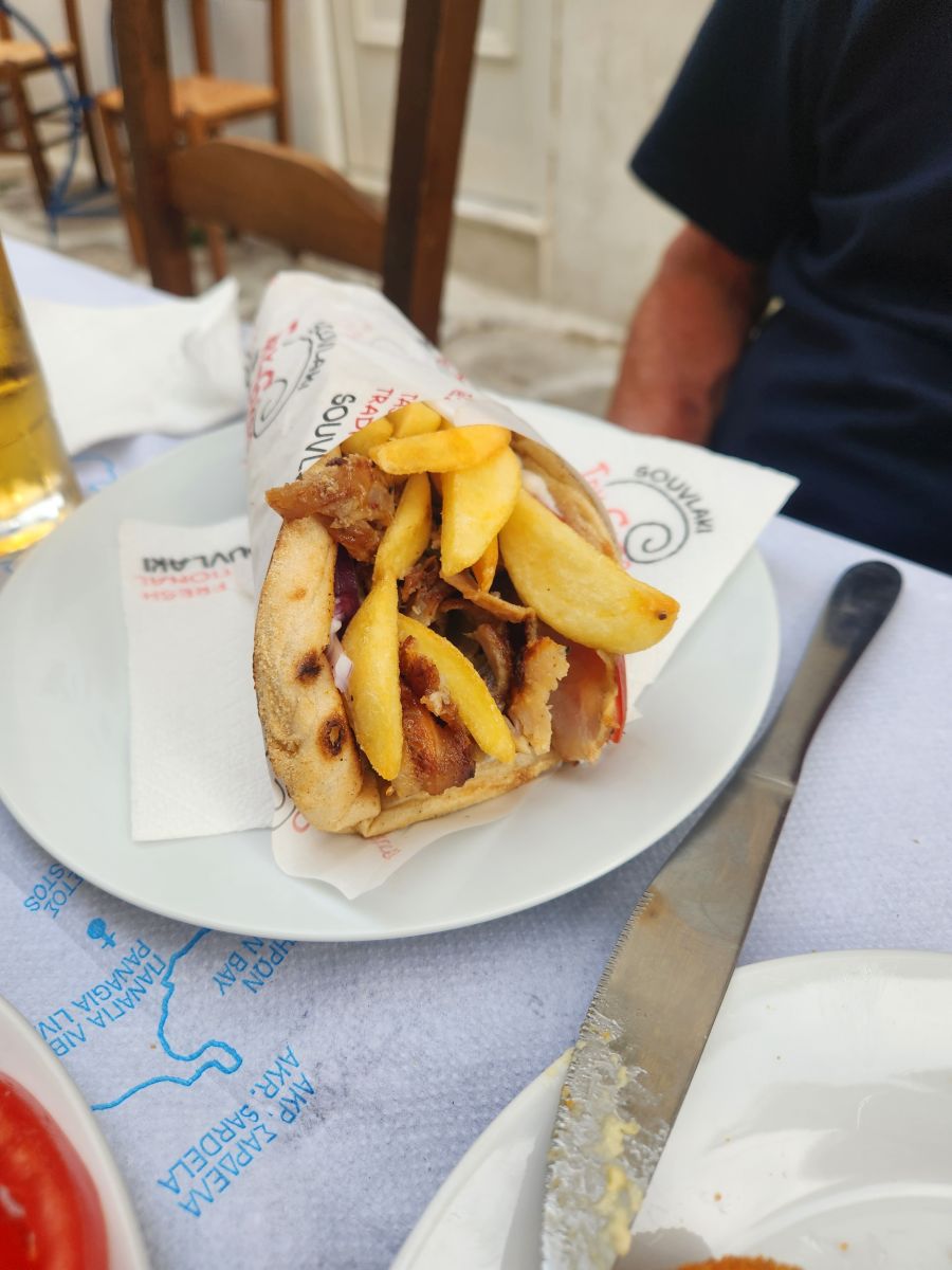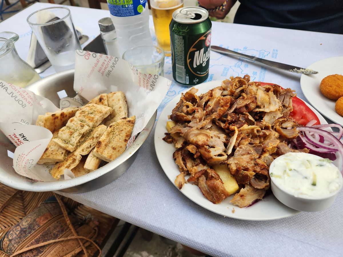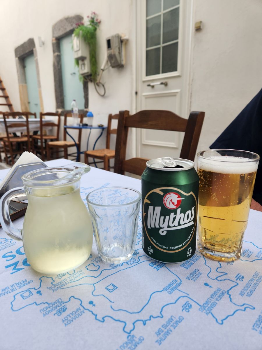 Back down on the main road through town, we grab a table at Pantelis, a seafood restaurant we wanted to try last year, but never managed to find the time. Well worth the wait! We had the best eggplant salad (think baba ghanoush, but different), these awesome little cheese pies with honey (OMG – out of this world!), the special local Kefalotiri cheese and a grilled sausage – all so yummy and so filling! Oh, and a big beer and a ½ liter jug of wine (6 euros, thank you very much!). Welcome to the island!