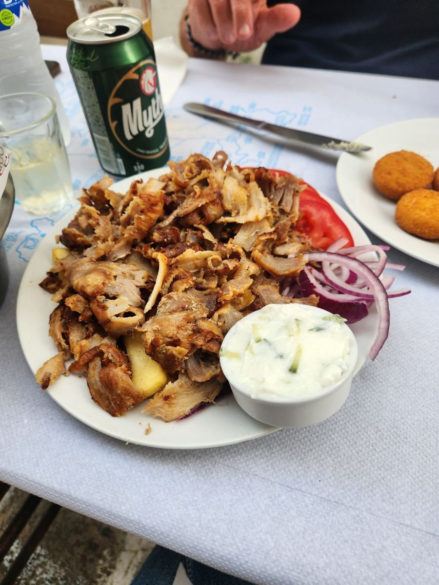 Later that evening, we venture out onto the town again to Try Gyro, a little place down a lane off the harbor, but with a sandwich board sign in the middle of the sidewalk advertising their location with menus you can take. We didn’t want anything too heavy after that huge lunch (hohoho) and figured souvlaki and a gyro would be just right. Ha. We made the tactical error of ordering cheese balls, which were excellent fried cheese balls, but so rich and heavy. Then we ordered the pork souvlaki. OMG! The portion was monstrous! And of course the gyro – or as our precious little waitress says, the pork souvlaki that is wrap-ped (emphasis on the “ped”). What have we done???? Over ordered is what we’ve done! Sigh. But – all is not lost! Everything is excellent, and we have a full kitchen! So, we finish the wrap-ped gyro and the cheese balls, but take the souvlaki and pita and Tzsatziki sauce home for our lunch tomorrow.