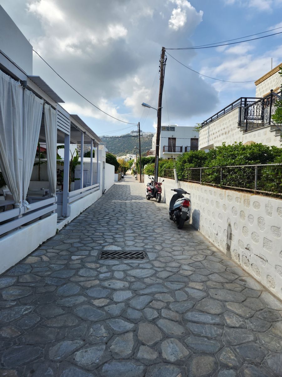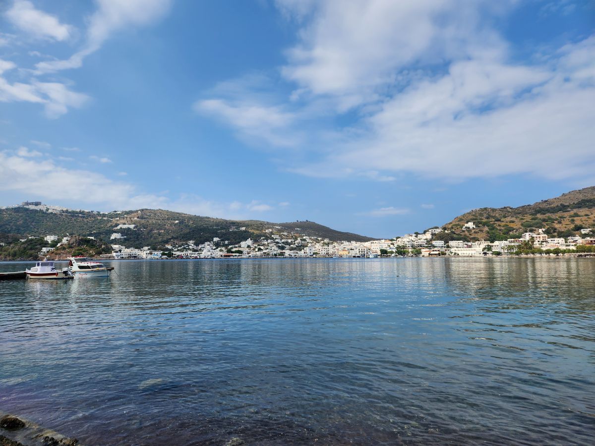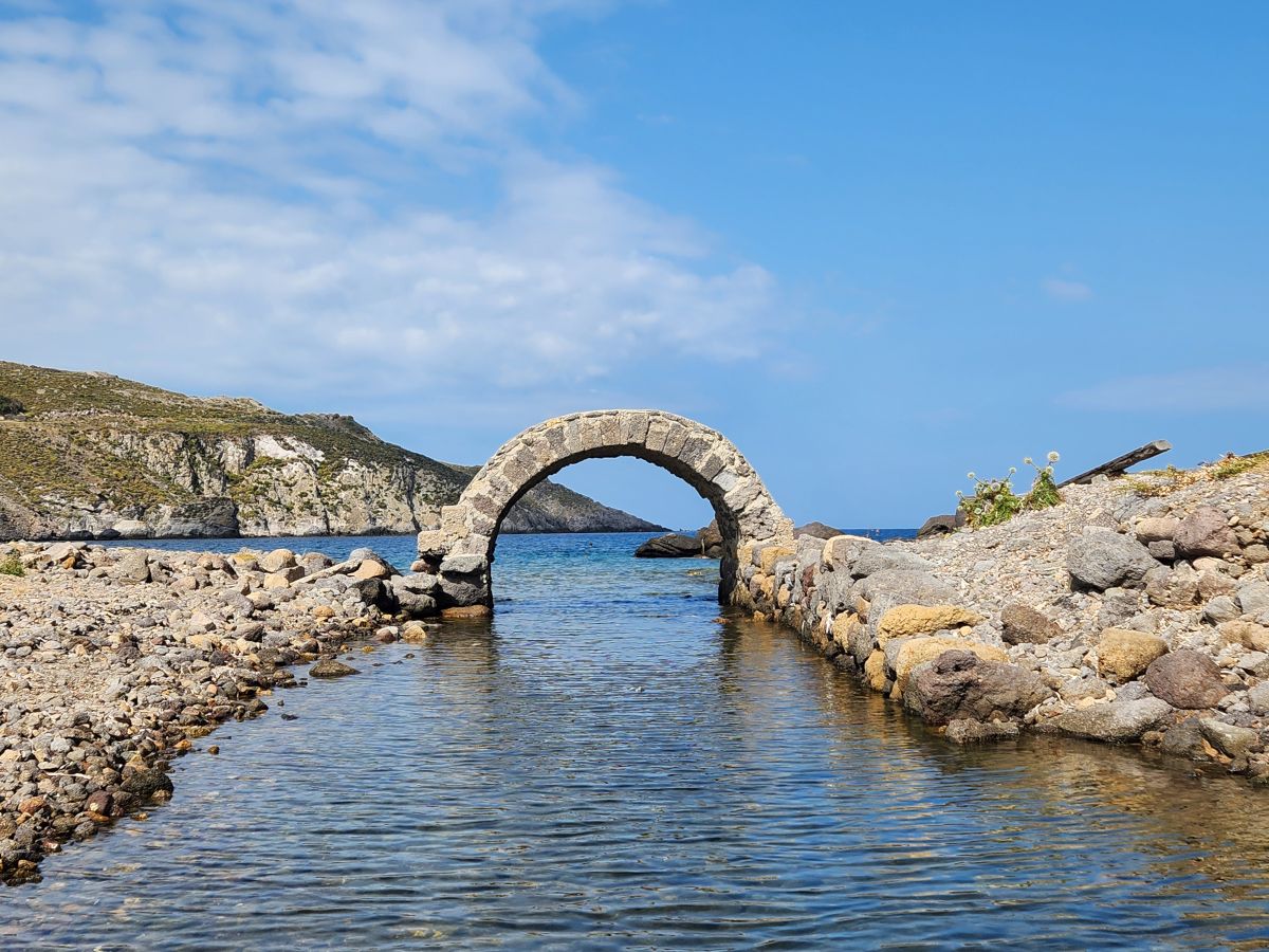 Today, we are just decompressing (yeah, like we need to decompress, but regardless….) and hanging around Skala for the day. We are up early – of course – and after our coffee in the house, we go explore the neighborhood around our little house, walking out to the little rocky beach on the opposite side from the Harbor. It is just a little cove, really, with some holiday villas and a couple of hotels around. But there is this great stone arch at the end of a little channel. It is beautiful – although we’ve no clue what it is used for. Except scenery, which is lovely.