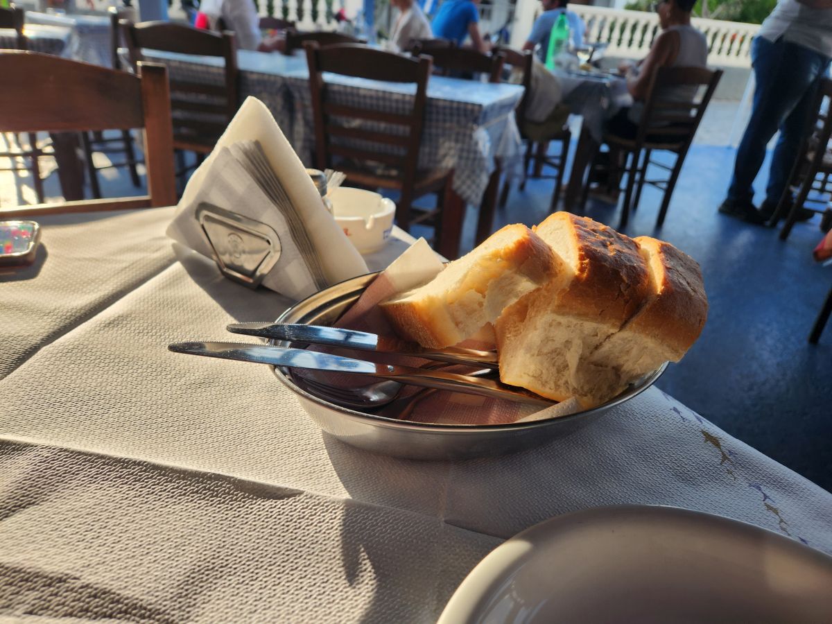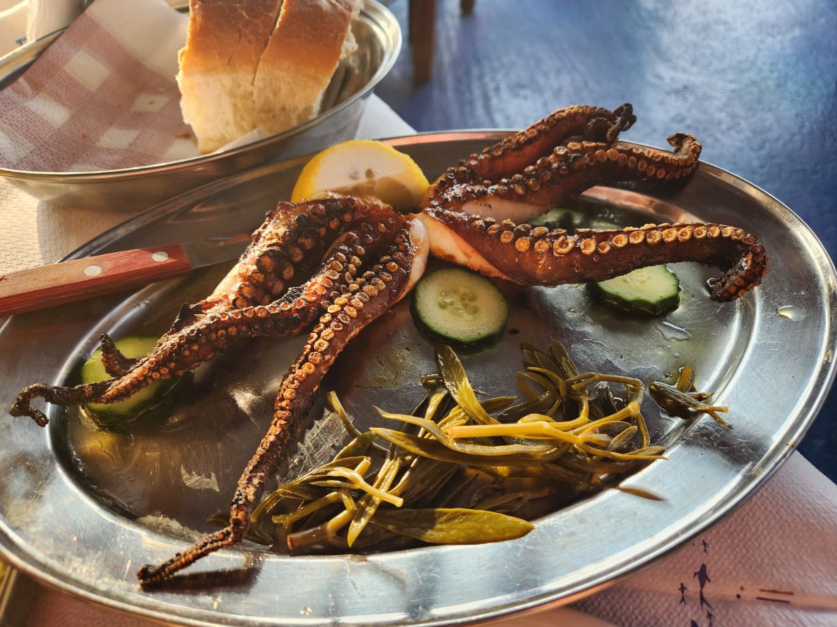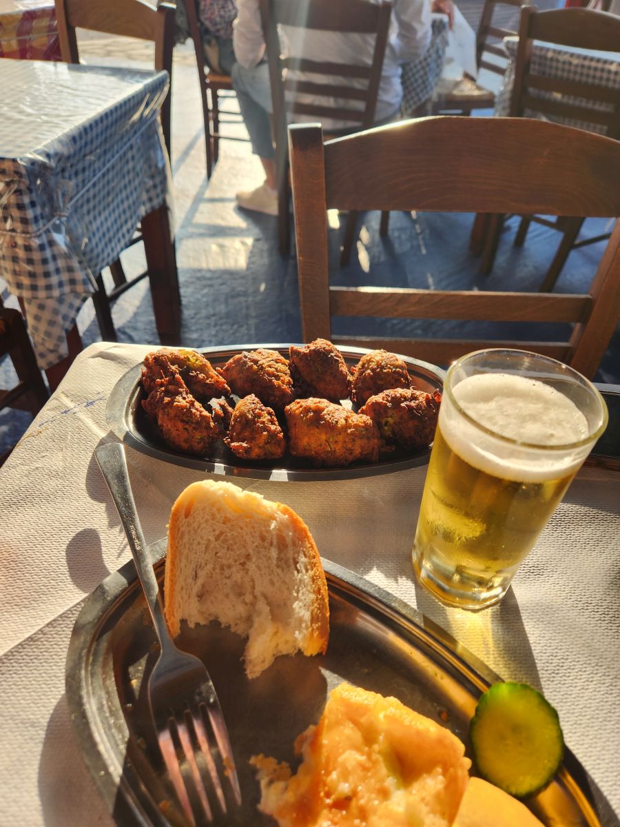Much later we manage to get ourselves motivated to go to dinner – choosing Trehantiri Taverna – a little place toward the stone beach we explored this morning. We figure it won’t be busy – and it wasn’t overly busy – but unfortunately all the tables in the shade were taken. Pooh! We managed to snag one that wasn’t too full on sunny (sunset here is late!) and ordered what turns out to be way too much food – all good – but way too much! We of course have to try the Saganaki – this is our go to dish everywhere to determine the best preparation. I decided to go with beetroot salad with garlic sauce – I’ve not had a good beet in forever. The plate that comes out is massive (I should know better!) – it’s fabulous, but just huge! Our biggest tactical error is ordering the zucchini balls. We actually wanted the octopus balls but they are out of them, so we went with zucchini – and while they are excellent, they are oh so filling! And we still had grilled octopus (which ended up coming out fried) to deal with! Ay yi yi! More leftovers for snacks or lunch! But a lovely, lovely dinner.