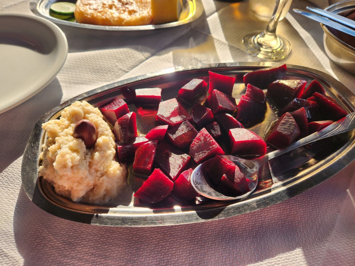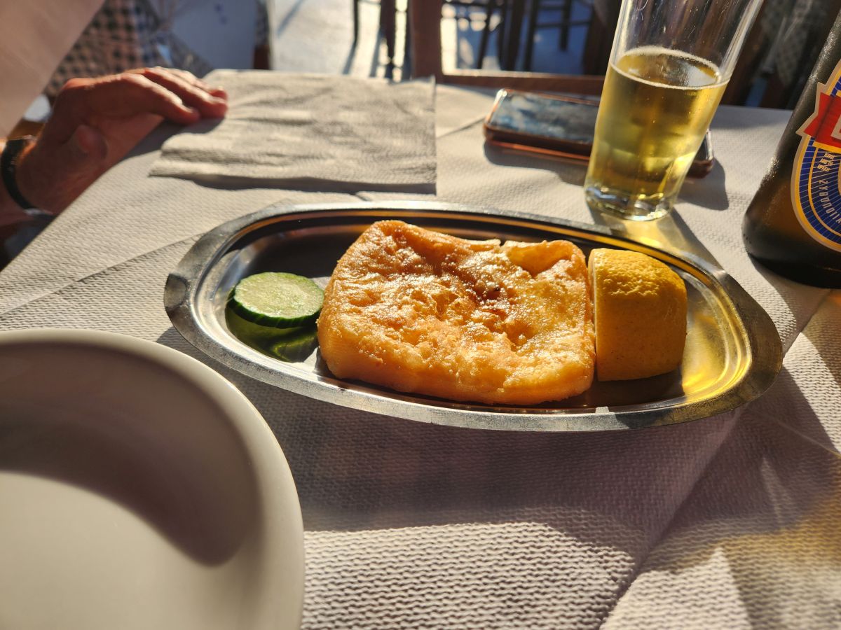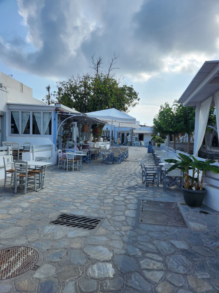 Much later we manage to get ourselves motivated to go to dinner – choosing Trehantiri Taverna – a little place toward the stone beach we explored this morning. We figure it won’t be busy – and it wasn’t overly busy – but unfortunately all the tables in the shade were taken. Pooh! We managed to snag one that wasn’t too full on sunny (sunset here is late!) and ordered what turns out to be way too much food – all good – but way too much! We of course have to try the Saganaki – this is our go to dish everywhere to determine the best preparation. I decided to go with beetroot salad with garlic sauce – I’ve not had a good beet in forever. The plate that comes out is massive (I should know better!) – it’s fabulous, but just huge! Our biggest tactical error is ordering the zucchini balls. We actually wanted the octopus balls but they are out of them, so we went with zucchini – and while they are excellent, they are oh so filling! And we still had grilled octopus (which ended up coming out fried) to deal with! Ay yi yi! More leftovers for snacks or lunch! But a lovely, lovely dinner.
