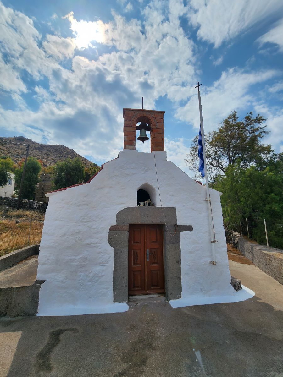From here we reverse course, walking back through the mostly deserted town (oh, we love it here before season!) and then following the waterline for a long walk around the harbor. We decide against walking to Meloi at the far end of the peninsula that faces Skala – mostly because the road is uphill and we figure, why? So we walk down the harbor and over to the little church that is right on the waterfront. We figure it is a sailor’s chapel, being so close to the water and the harbor. It is sweet and little and so very Greek Island-ish!
