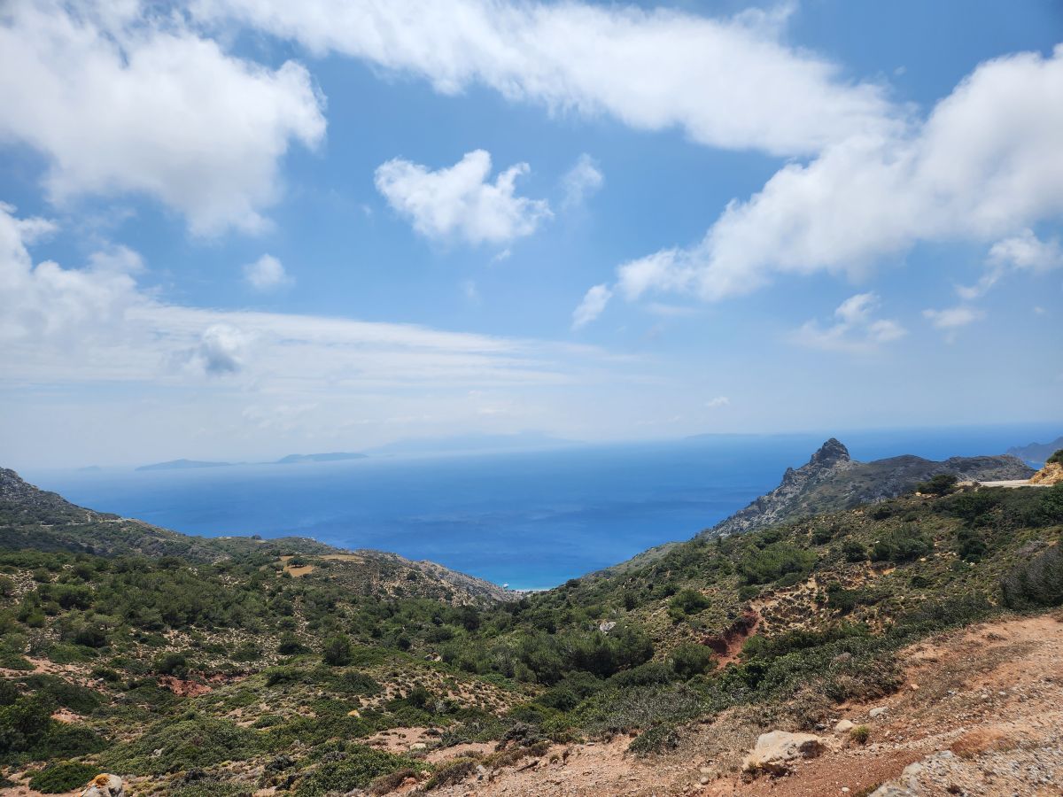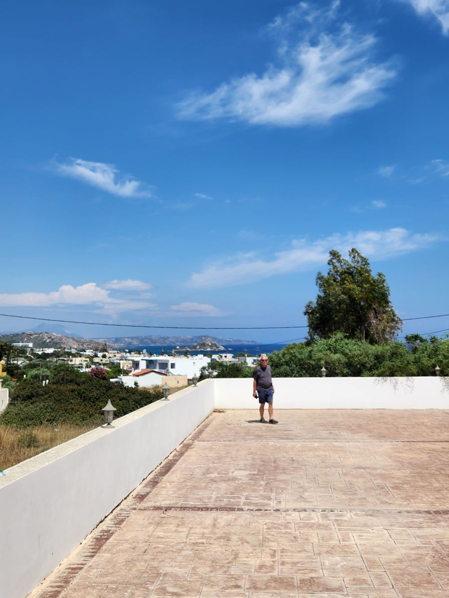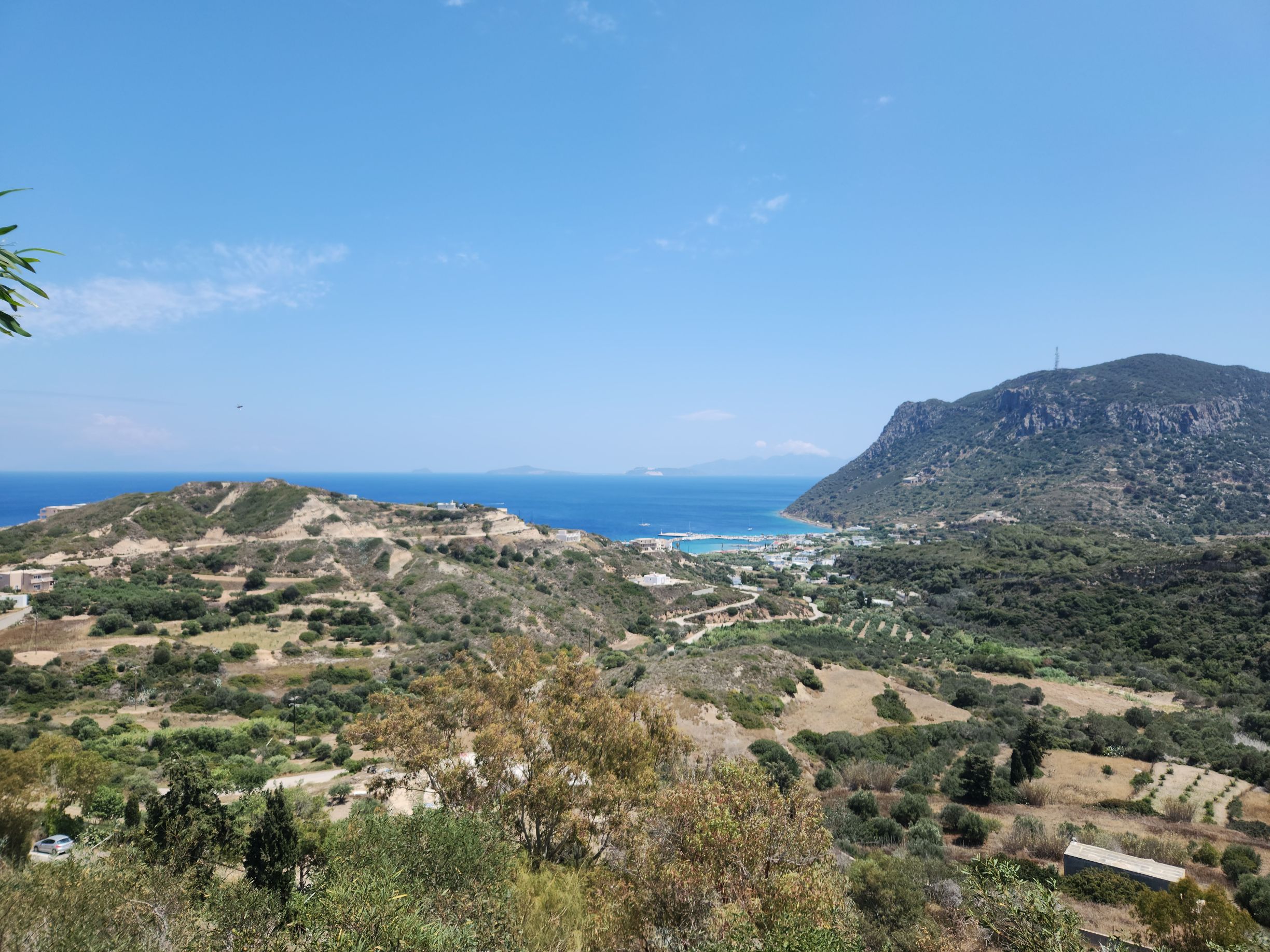 This place is fantastic! First of all, Ed is loving the drive, steep uphills, switch back curves, incredible views out over Kefalos Bay on one side and the Aegean Sea on the other. It is stunning up here. We stop at the viewpoint and walk down this dirt road with signposts that point to a church or monastery – but we’re not walking that far! We’re happy here with the stunning views across the mountains and the water. Beautiful – and a perfectly gorgeous way to waste time!