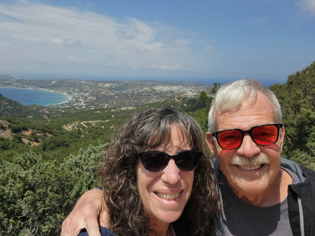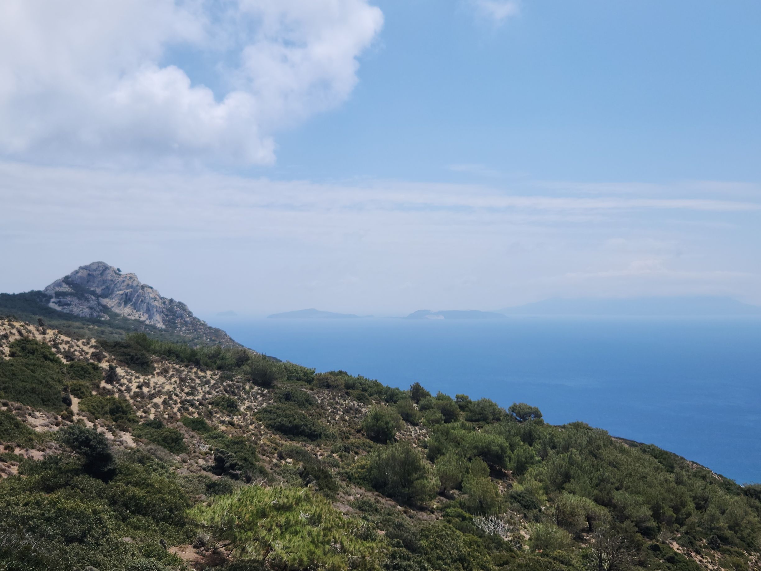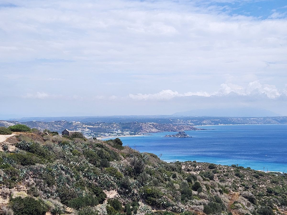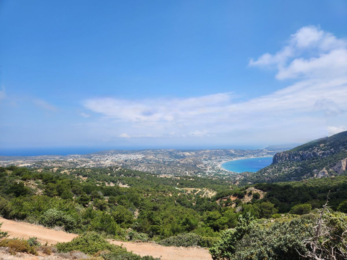 This place is fantastic! First of all, Ed is loving the drive, steep uphills, switch back curves, incredible views out over Kefalos Bay on one side and the Aegean Sea on the other. It is stunning up here. We stop at the viewpoint and walk down this dirt road with signposts that point to a church or monastery – but we’re not walking that far! We’re happy here with the stunning views across the mountains and the water. Beautiful – and a perfectly gorgeous way to waste time!