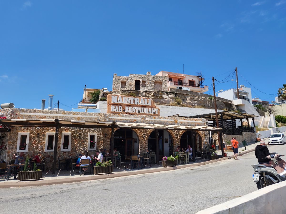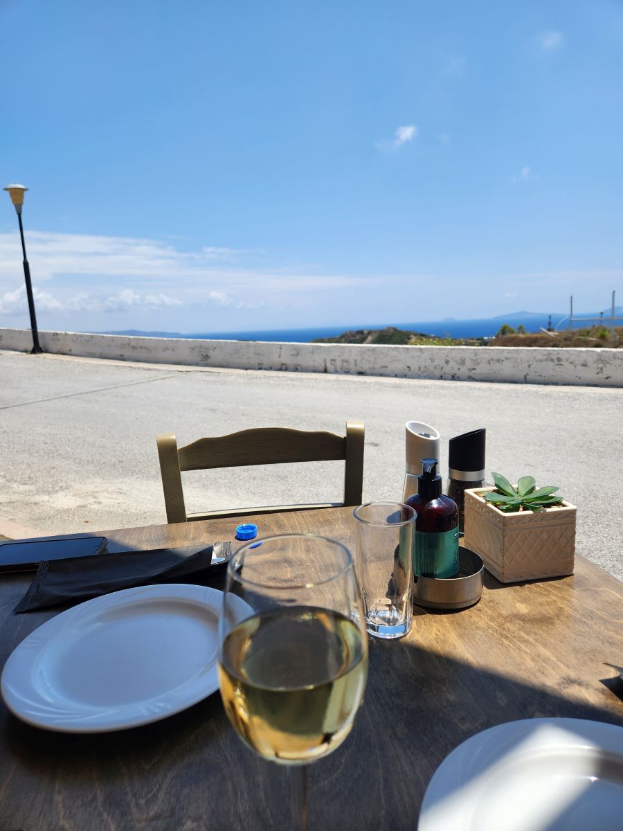 We have a restaurant all picked out, and I know it is by the “castle” of Kefalos, so we plug it into Google and off we go. F’ing Google Maps. That should be the official name of that app! Instead of taking us directly to the restaurant, which is on the main road, I might add, it takes us through the town of Kefalos with narrow little twisty turny lanes reminiscent of Crete! God I hate that app sometimes! Ed actually stops the car and I get out and walk down the road to ensure we can get out back to the main road – and not the way the stupid app is sending us either! Sigh. PS – we could get out that way, and it actually works out because we are right at a little pullout in the road where we can park the car and walk down the road to Maistrali, our chosen lunch abode. Phew.