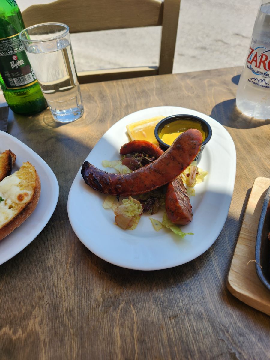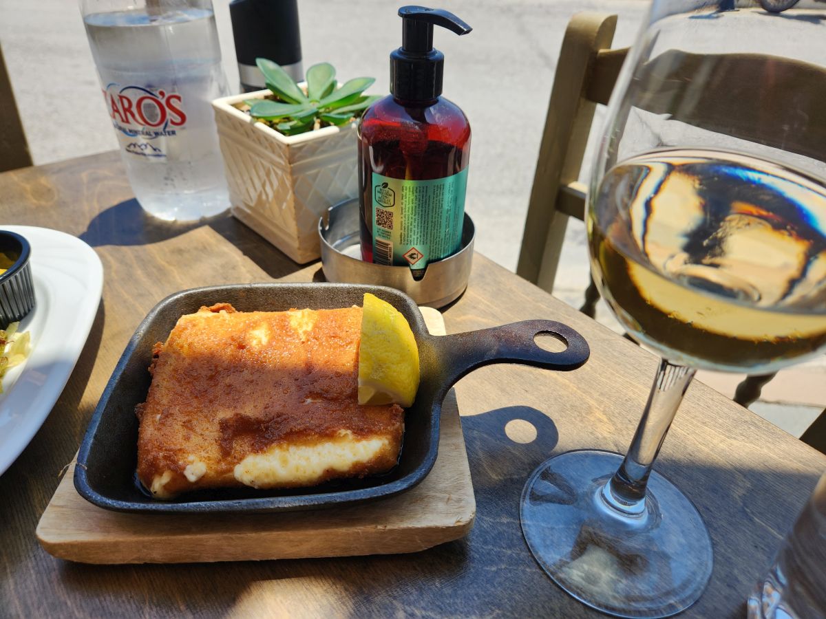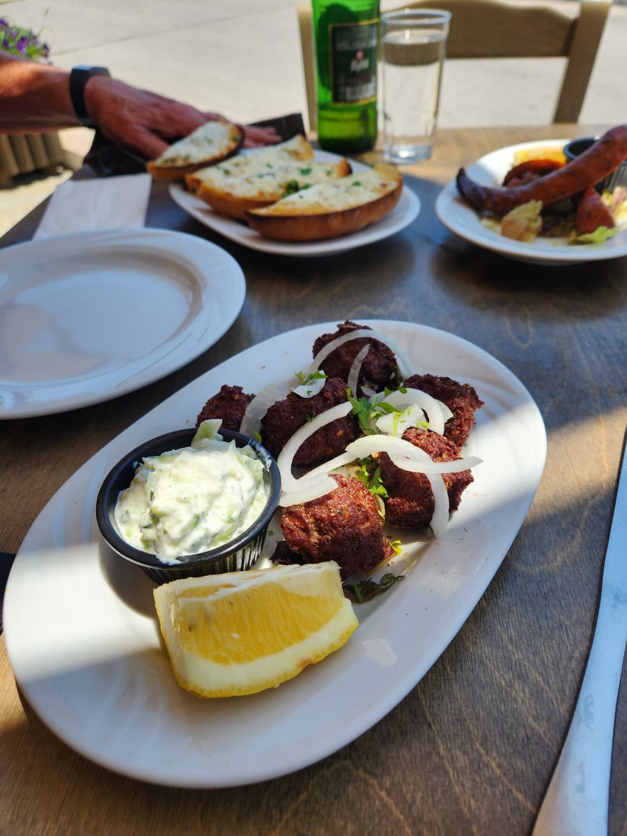 Here, on the patio, in the shade, overlooking the water, and up the hill, the castle, we have a wonderful lunch of fried meatballs (really, really good!), more garlic bread – this time with cheese! – some excellent sausage and of course, Saganaki. Totally filling and lovely.