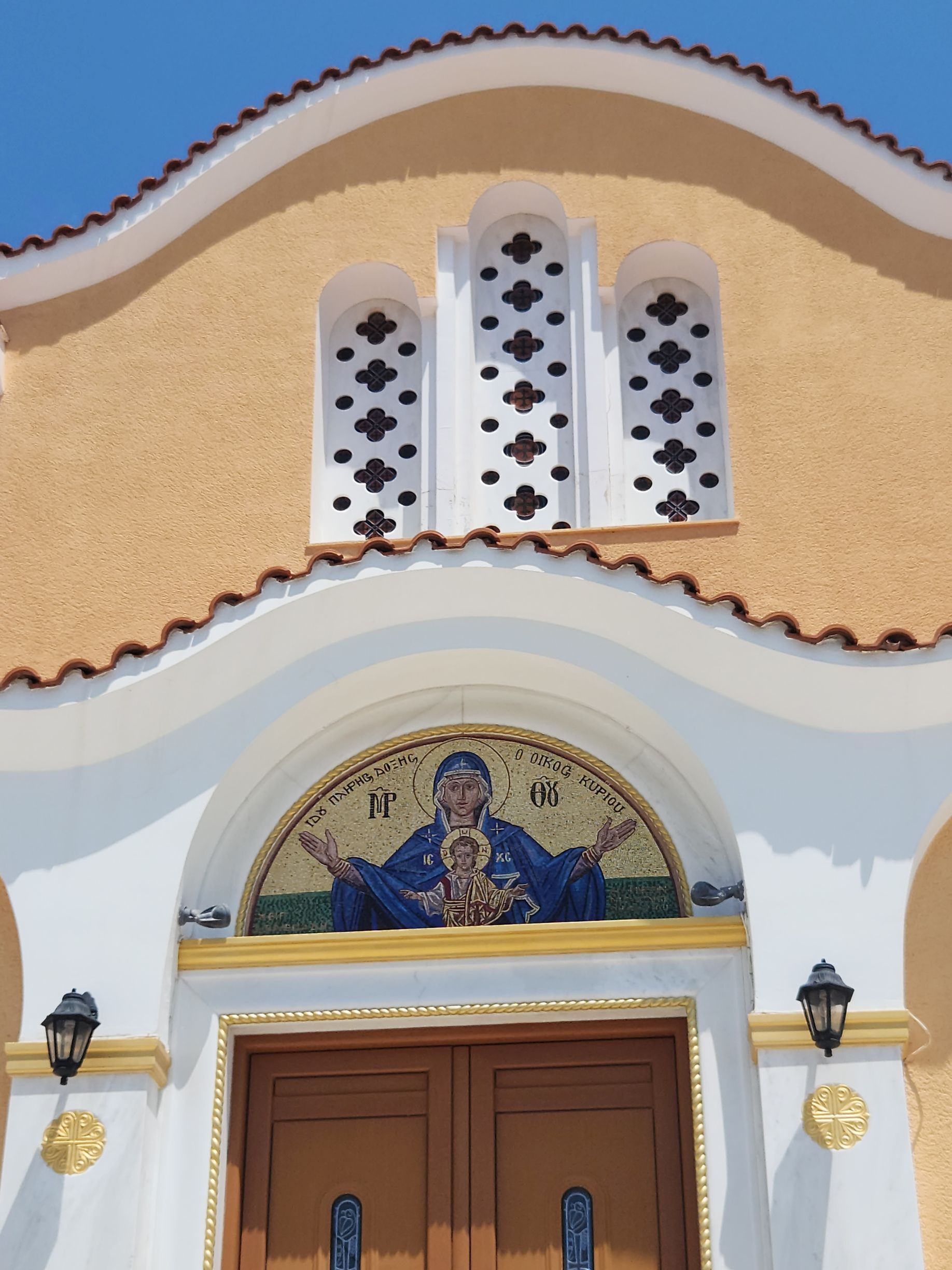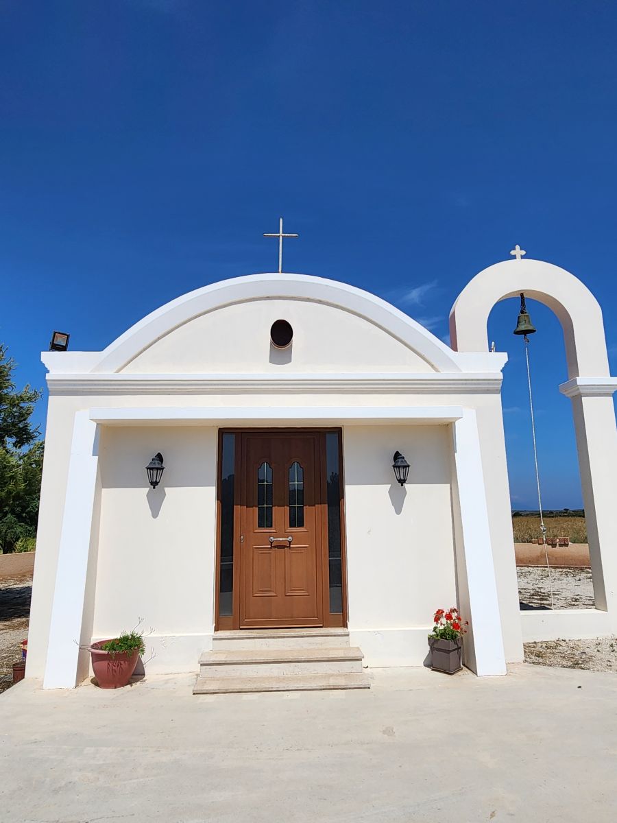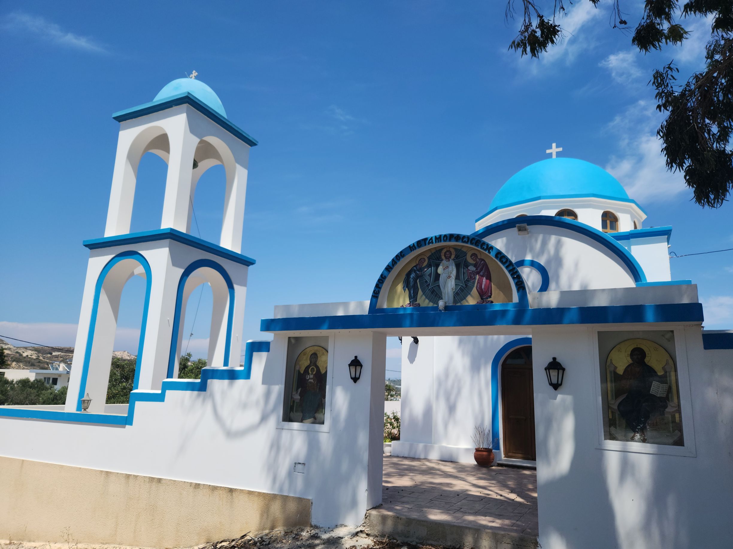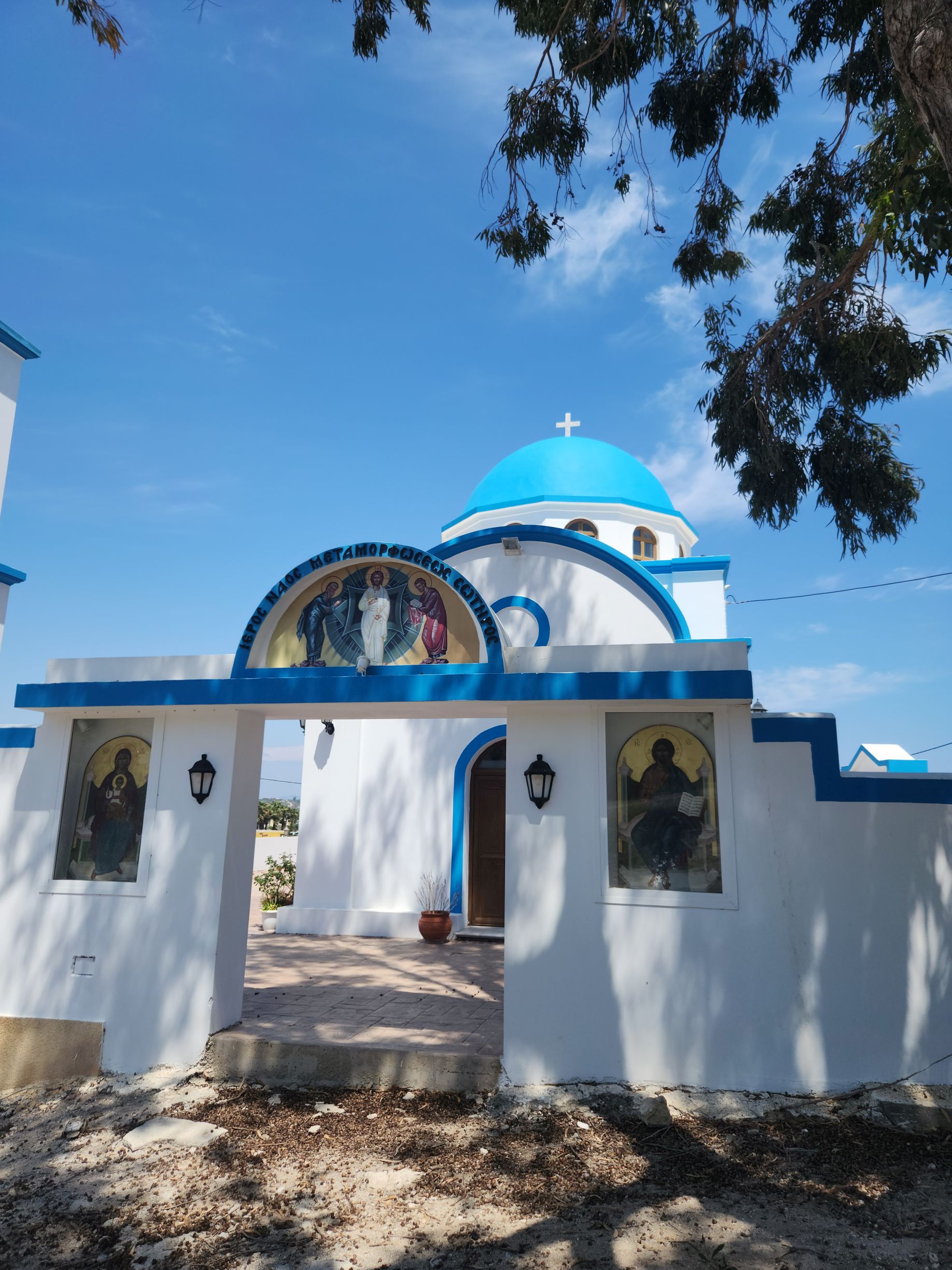 Then we head back toward the airport, trying to visit Saint Ioannis O Rosos, a pretty little chapel that supposedly has a museum. The signage is not good – and we miss the turn off pretty easily, and unfortunately are on the only stretch of road that is divided with no u-turn lanes. Oh well, we’ve got time! So we go all the way to the end of the divided road, find a place to turn around and drive all the way back down the road to do our own U-turn and finally get to the chapel. Once there though, there isn’t any museum, just a brand new chapel, one they are still working on. Hmmmm….not what we were expecting, but pretty in its own way sitting solitary out in the fields of the plateau. Hey, it’s an adventure!