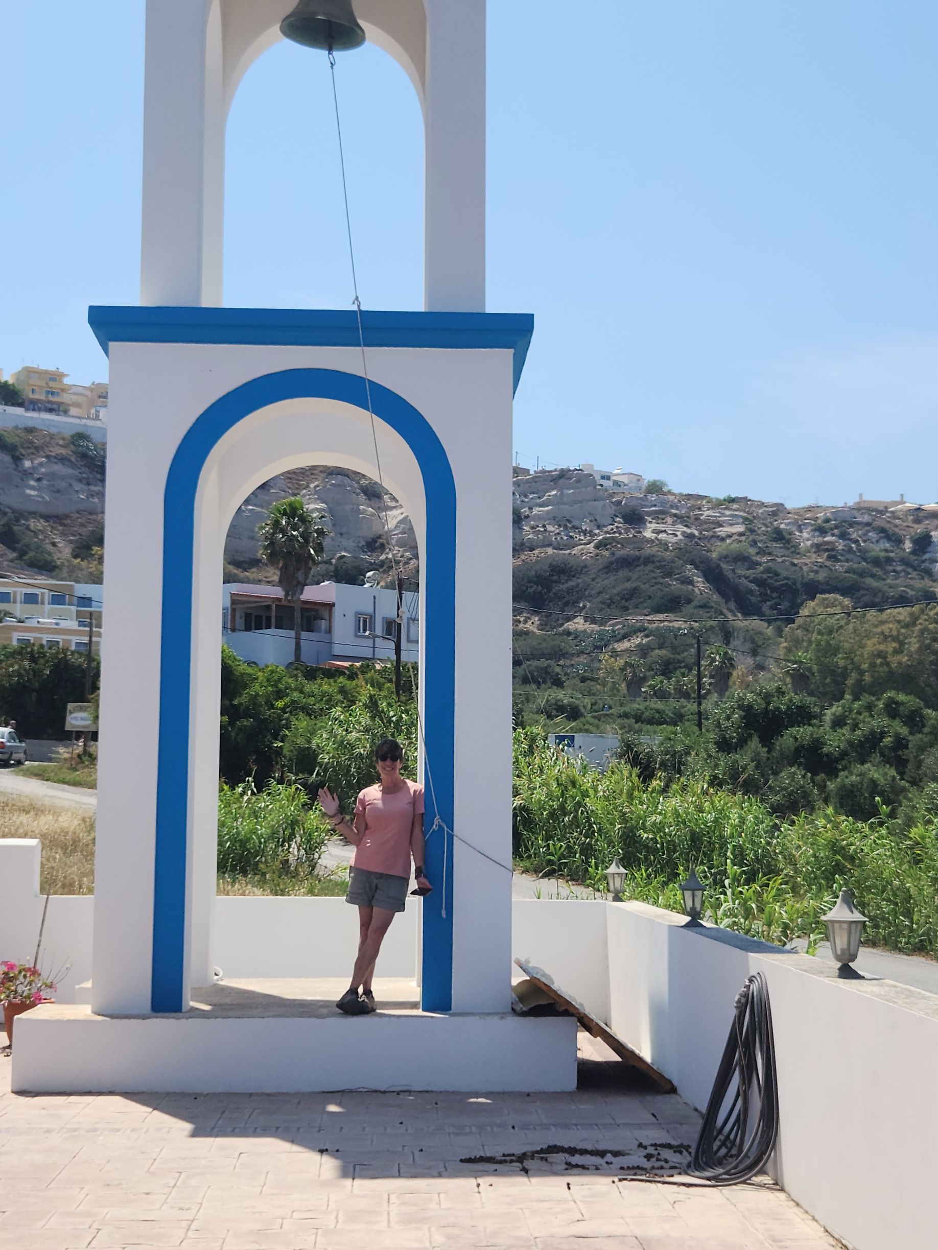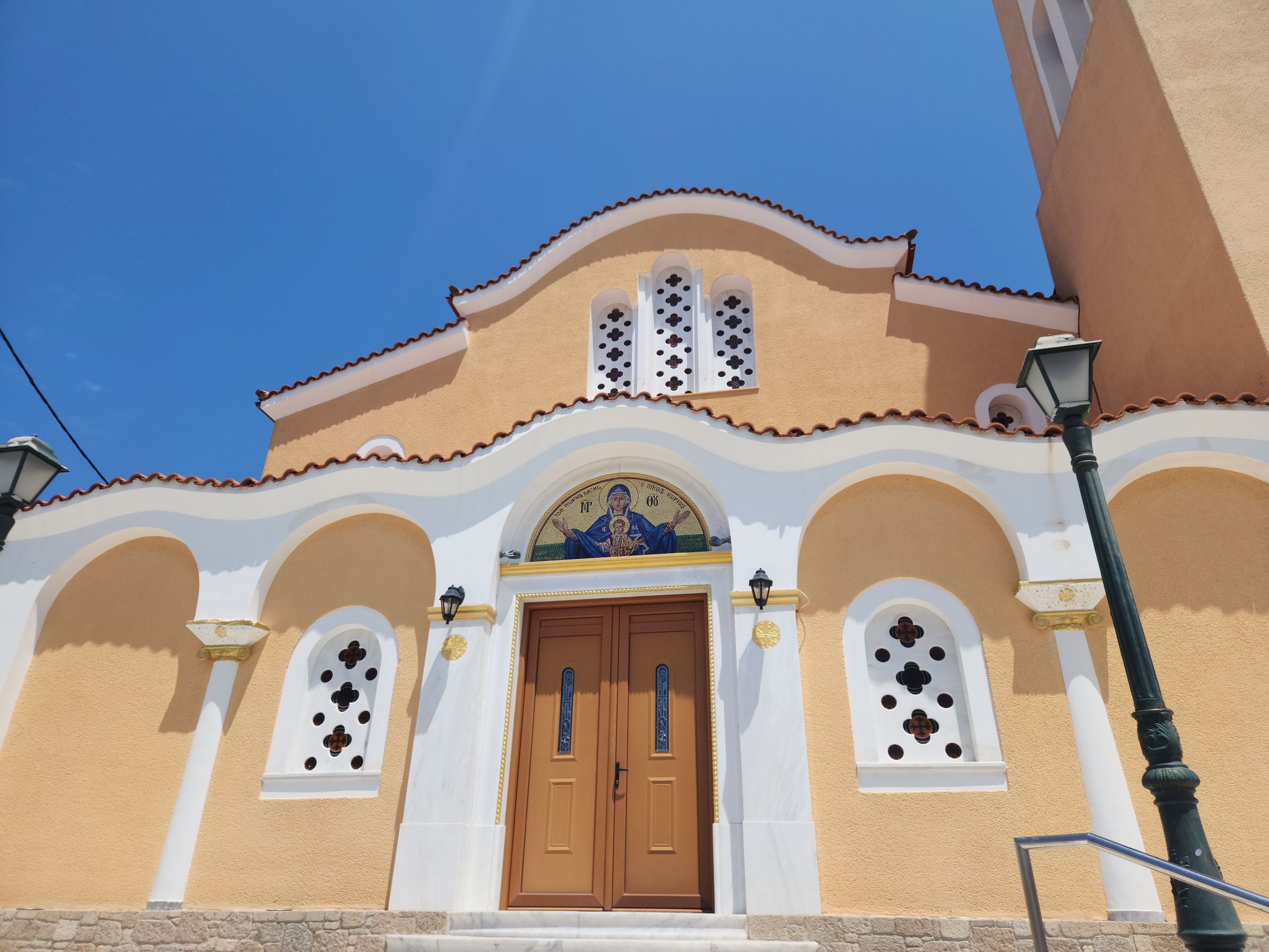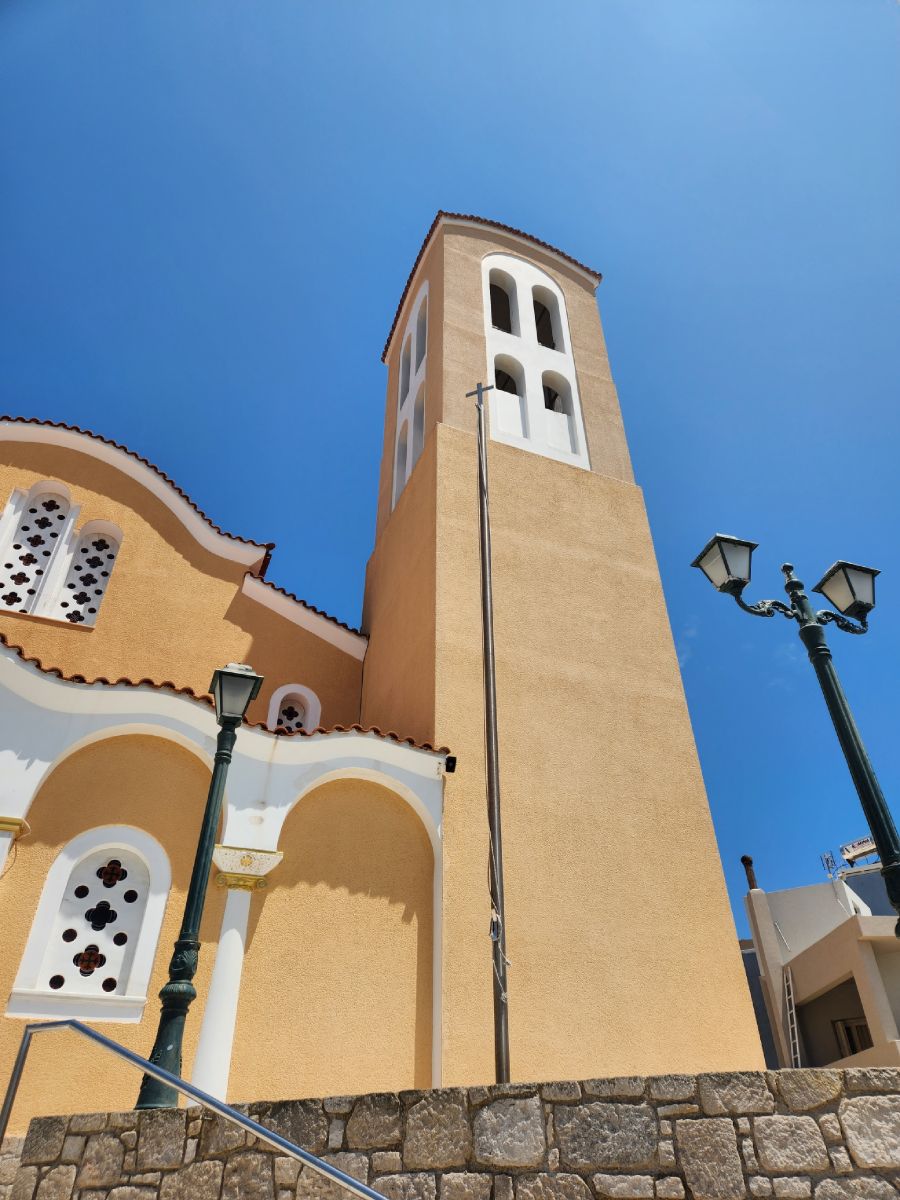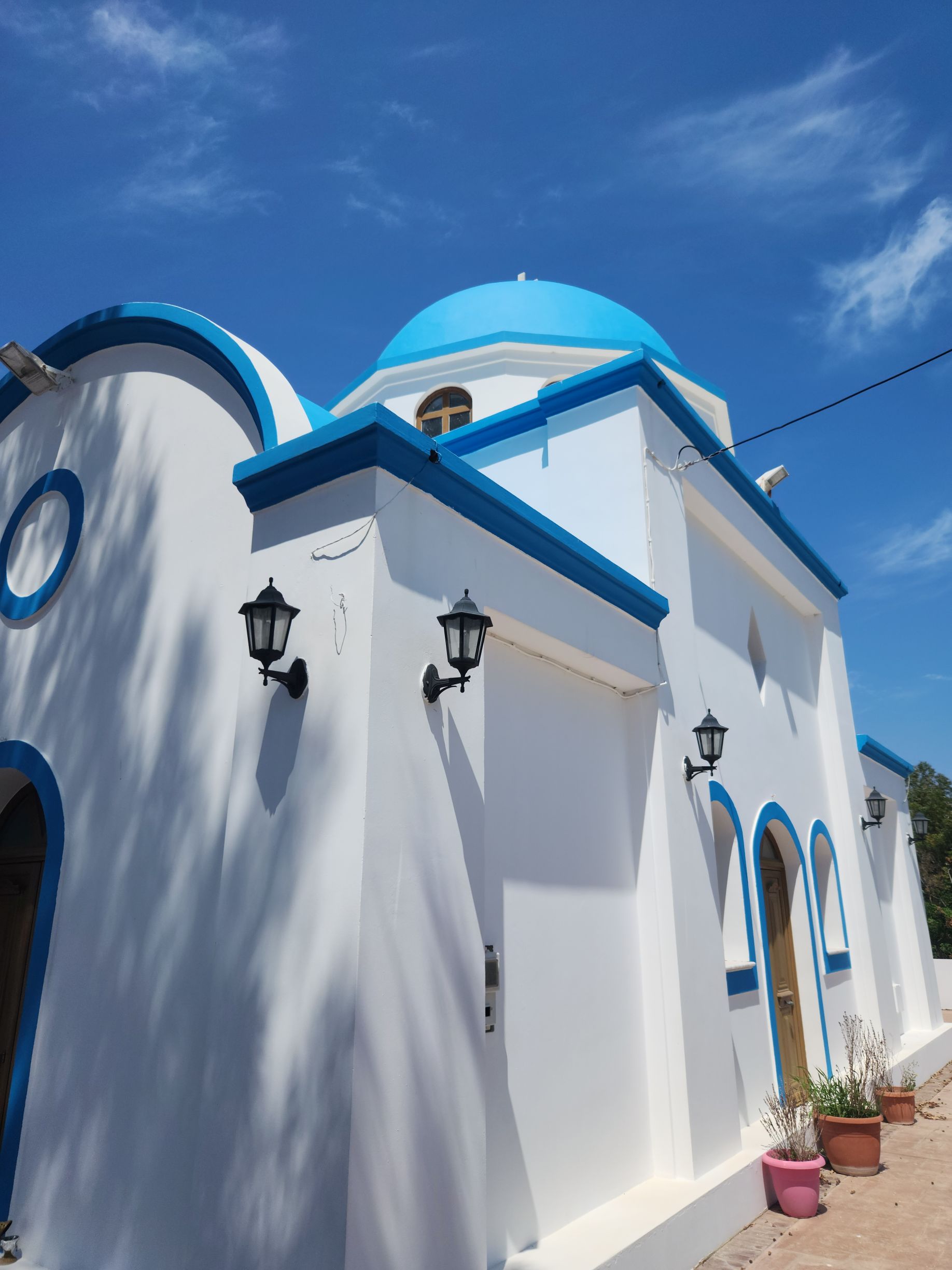 Then we head back toward the airport, trying to visit Saint Ioannis O Rosos, a pretty little chapel that supposedly has a museum. The signage is not good – and we miss the turn off pretty easily, and unfortunately are on the only stretch of road that is divided with no u-turn lanes. Oh well, we’ve got time! So we go all the way to the end of the divided road, find a place to turn around and drive all the way back down the road to do our own U-turn and finally get to the chapel. Once there though, there isn’t any museum, just a brand new chapel, one they are still working on. Hmmmm….not what we were expecting, but pretty in its own way sitting solitary out in the fields of the plateau. Hey, it’s an adventure!