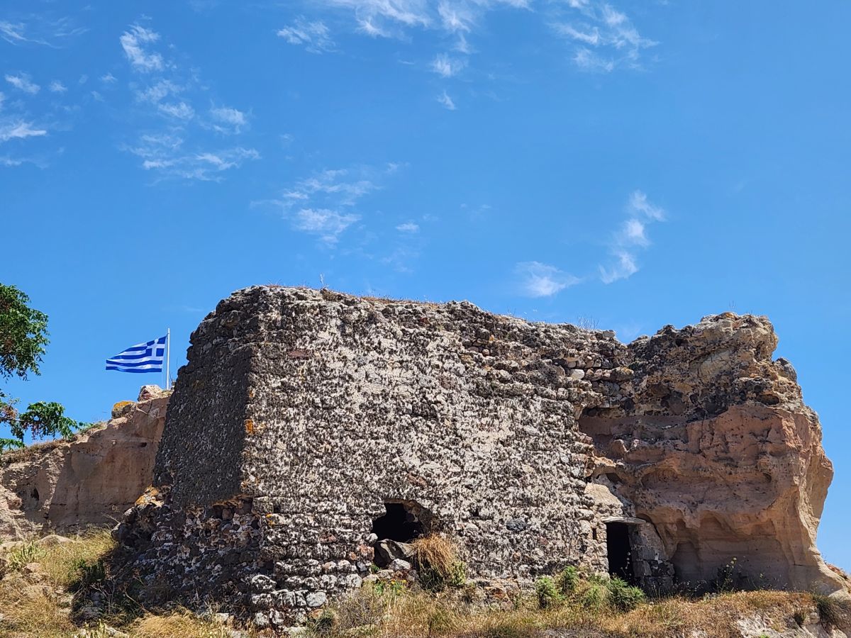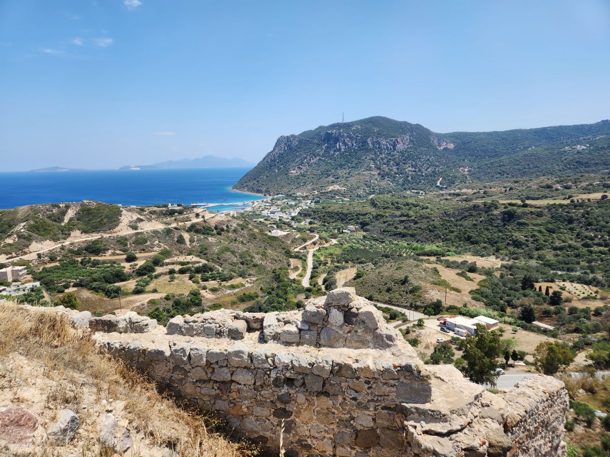 There isn’t too much to see in the town, so we walk back to the road that leads to the castle (and our car), stopping at the overlook across from Maistrali for some beautiful coastal vistas.