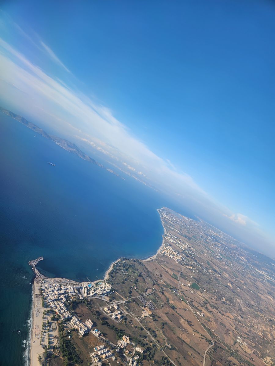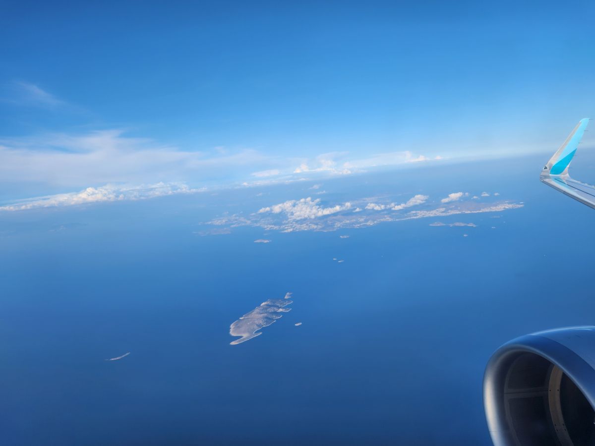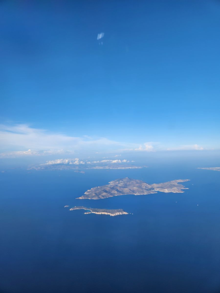 At any rate – this is far better than Aegean! We have a welcome drink – and honest to goodness drink! Haven’t a clue what it is, some sort of juice concoction which I think had alcohol and I think oregano. That might have been the little specs that were in there. Who knows? It was good though. And the views were gorgeous as we flew over the islands – unfortunately we were on the wrong side of the plane to see Patmos, we flew right over. Bummer.