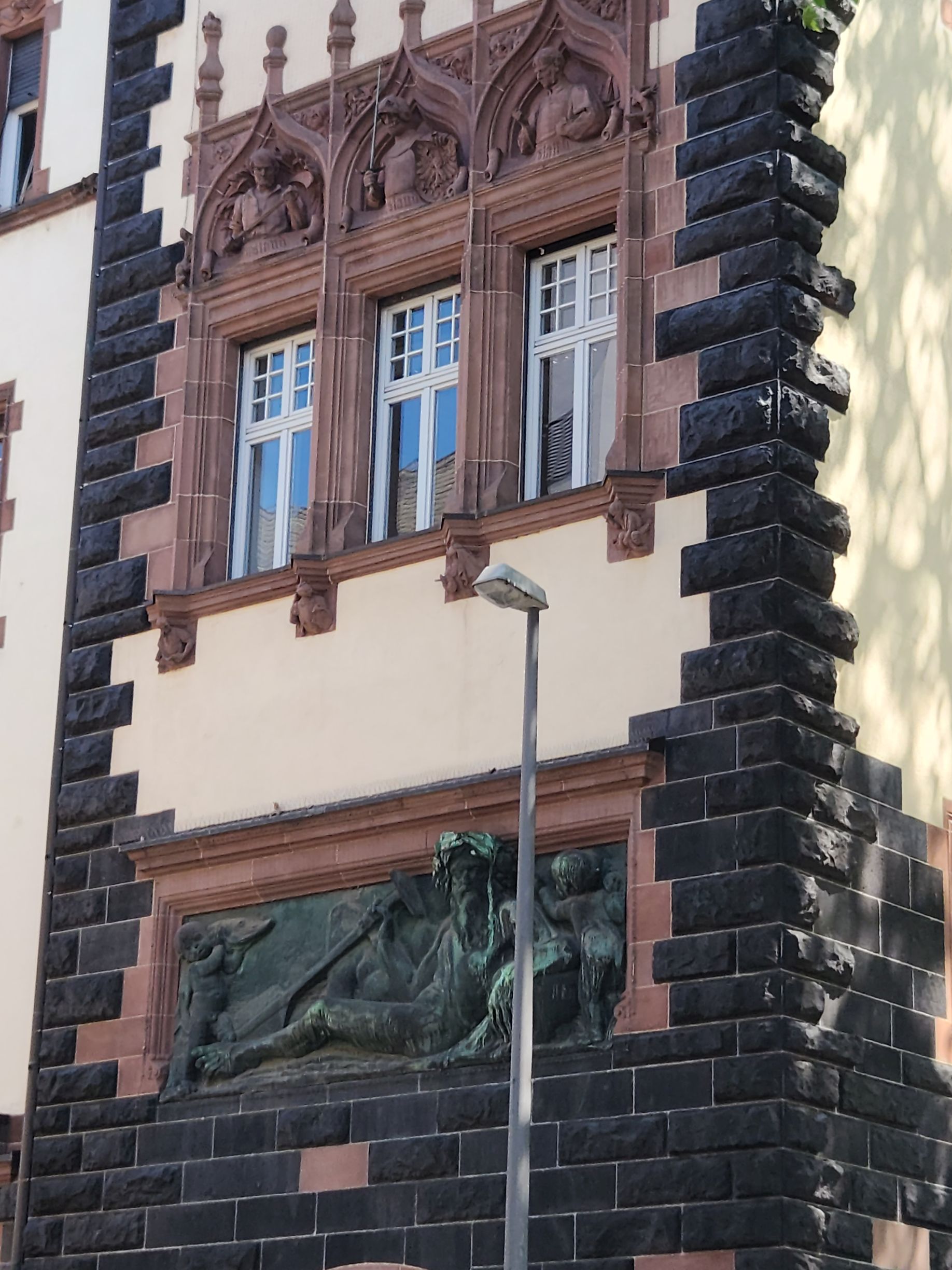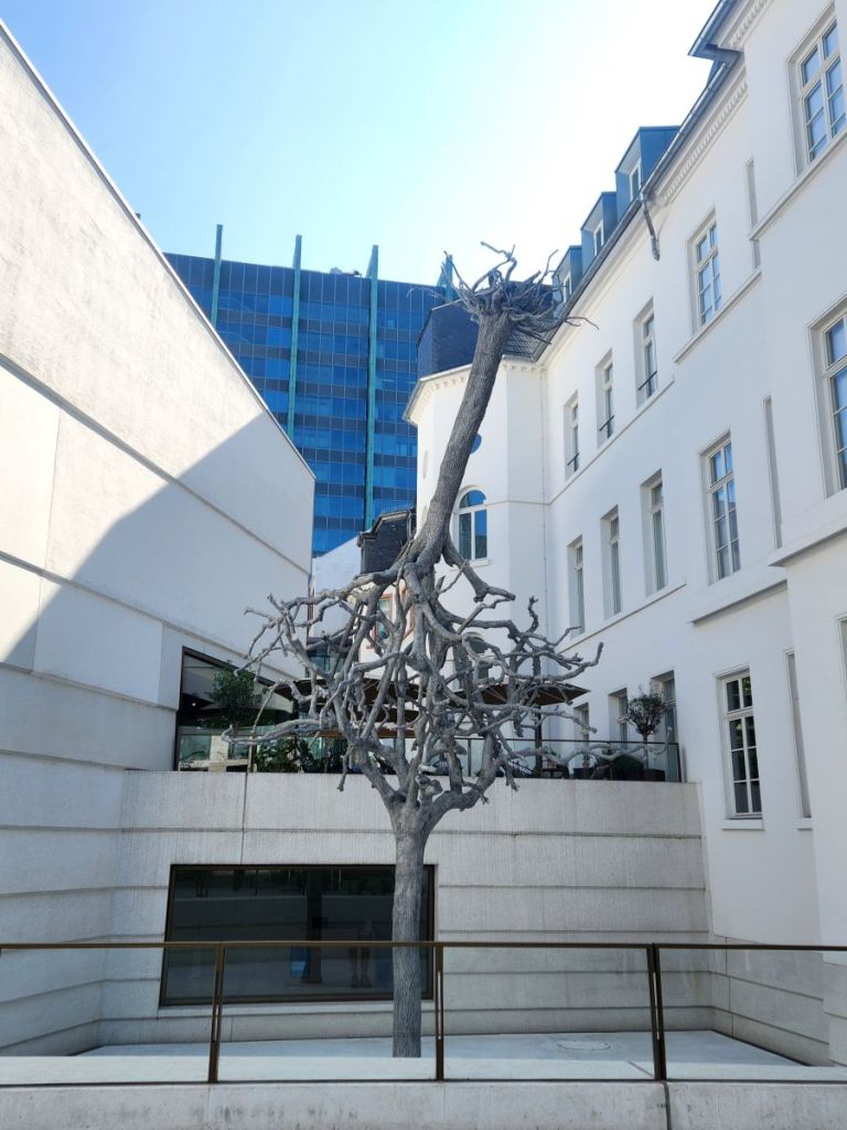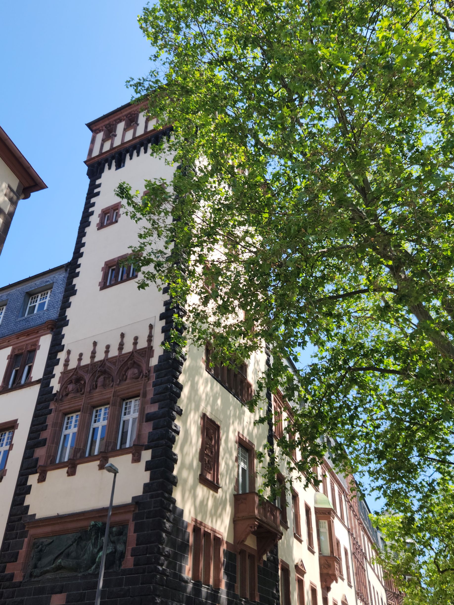 Veering off these main roads, we head toward the river walk, easily finding the Jewish Museum, our first stop of the day. Here in the courtyard is a magnificent aluminum sculpture of the mirror image of a tree – the crowns entangled – symbolizing the history of Frankfurt’s Jews: simultaneously connected and uprooted. As we are still 10 minutes early, we are able to sit on a sunny bench in the courtyard and ponder this lovely sculpture and its meaning.