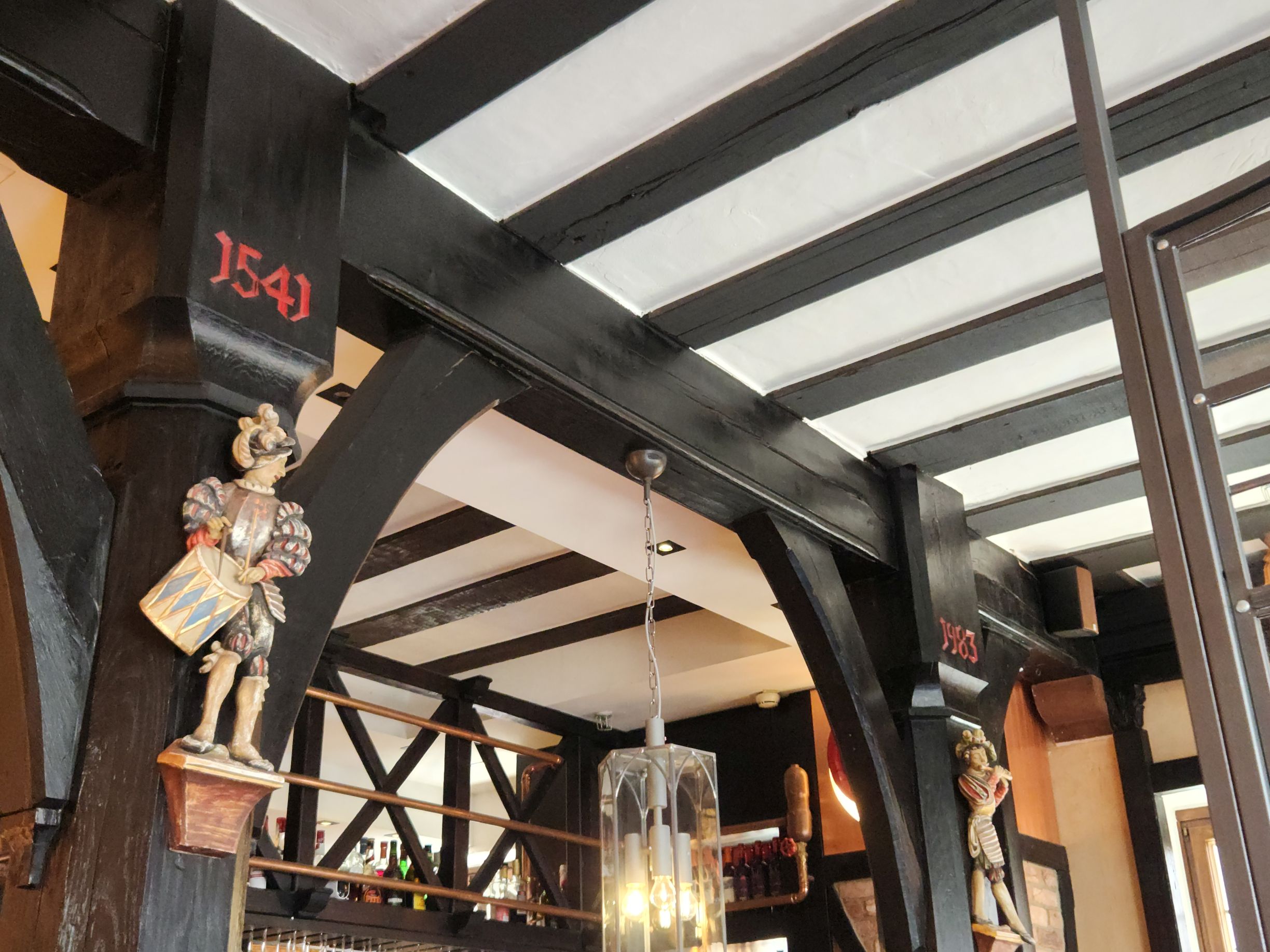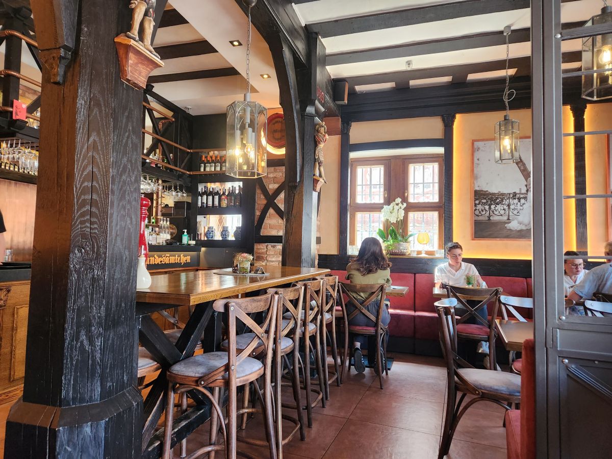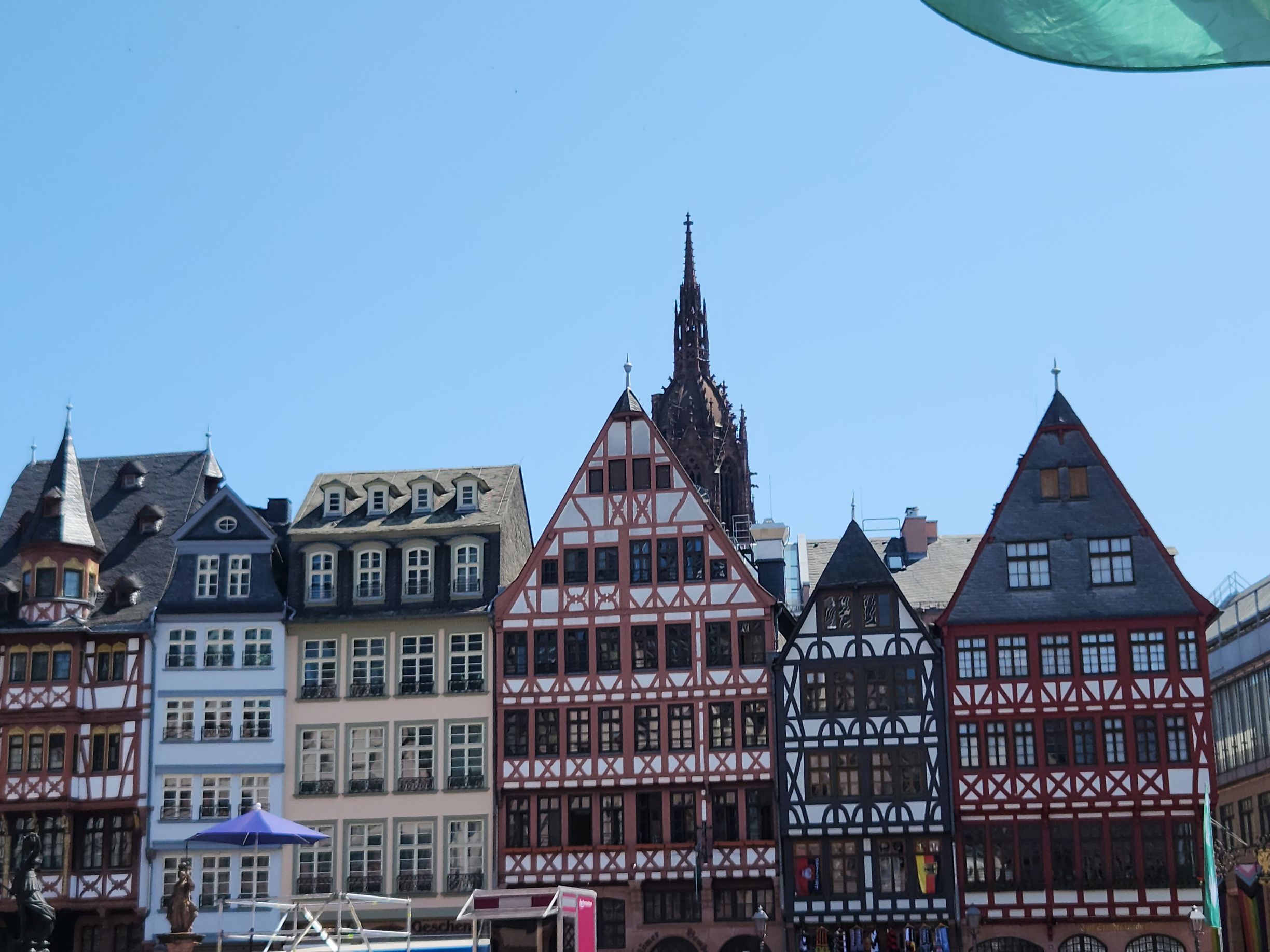 Great way to spend a couple hours! Back outside in the gorgeous sunshine, we wander over to the Romer, the name of the town hall and the center of the old town of Frankfurt. Here there are tons of half-timber houses and gorgeous architecture as well as the main cathedral. There is or was also some huge festival here on the square, which we it appears they are breaking down, making for less than ideal pictures and less than spacious walking areas. Meandering around the old town area, we search out a sit down restaurant where we can have our first authentic German meal. There are lots of little cafes, many with brunch, and it takes us a while before we stumble upon Zum Standesamtchen, a lovely little traditional German pub, where we manage to grab the last indoor seat (the outdoor tables are just being set up and they are having to drag over chairs and go somewhere else to get the umbrellas – whatever this festival was, it definitely disrupted the businesses here!).