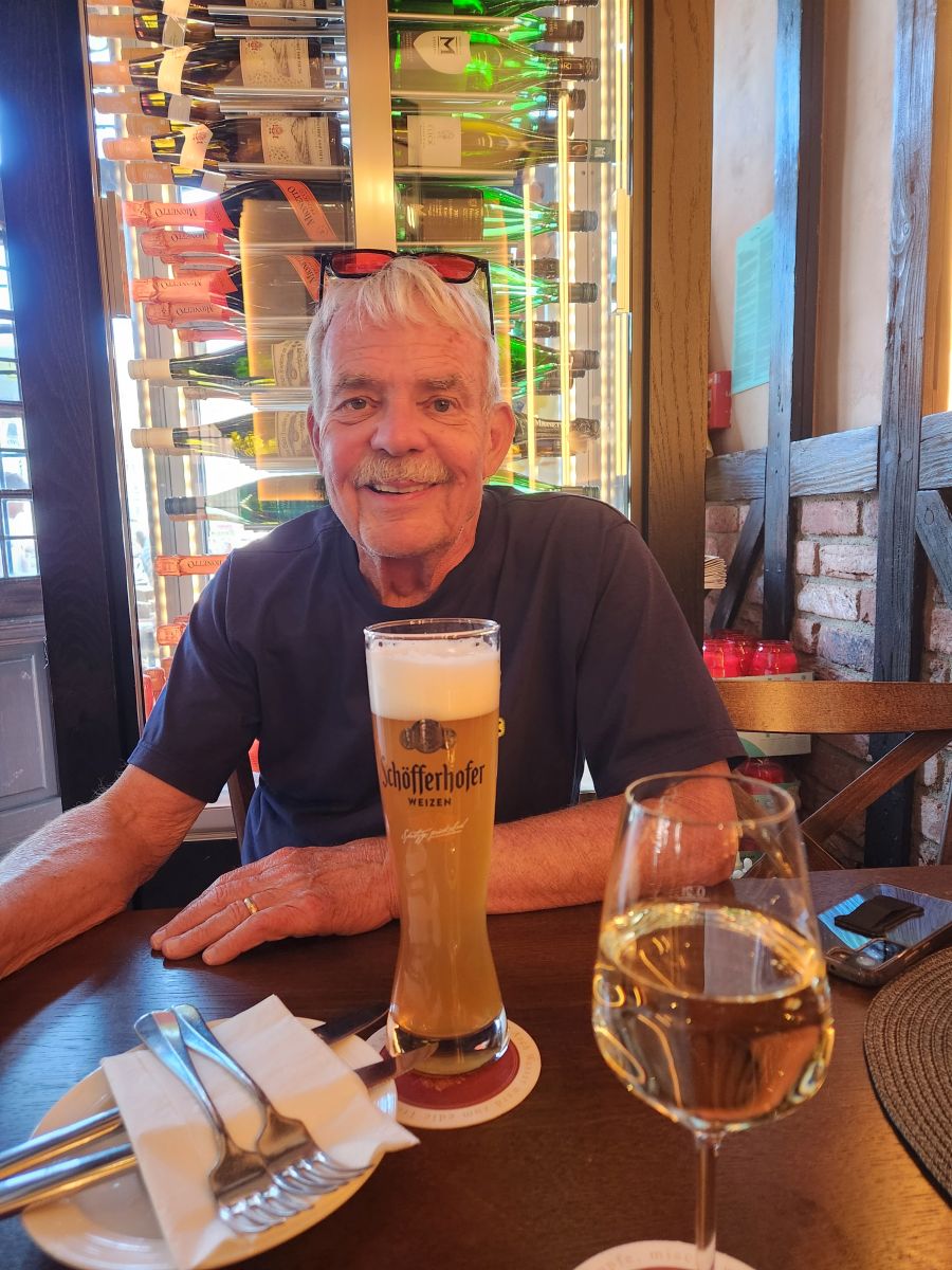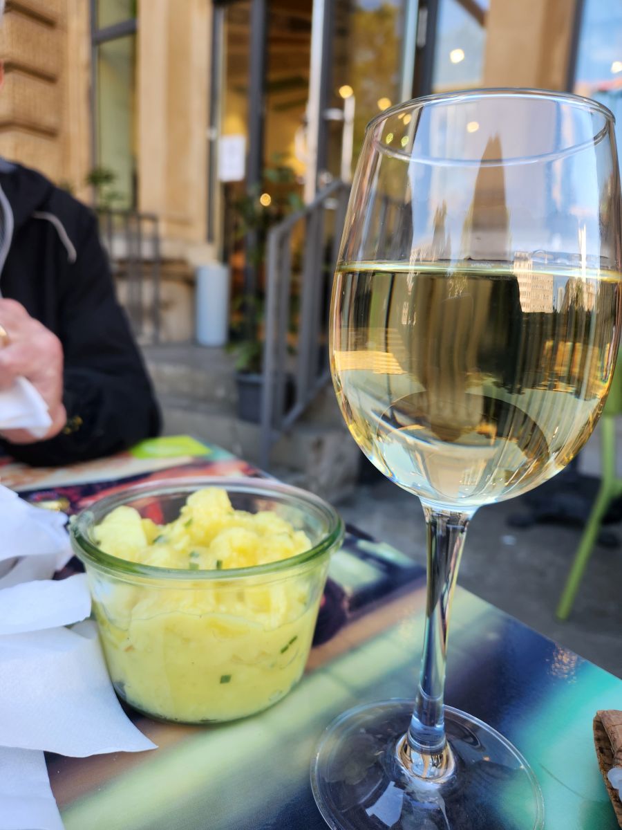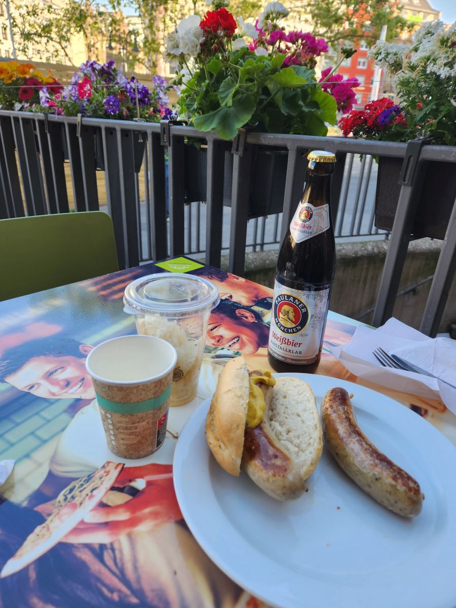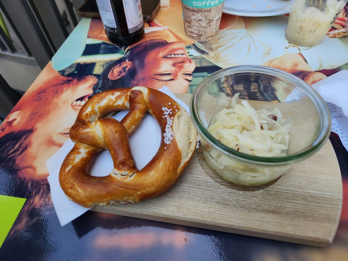 Then it is back to the train station for dinner – hey – it ain’t Japan, but it’s a food court with lots of options so we can get what we want. And what Ed wants is a knockwurst and a bratwurst – one with bread – accompanied by sauerkraut. I just wanted a pretzel and sauerkraut, which the sweetest girl at the Paulaner Beer house gets for me – after she figures out that sauerkraut is the English (I say American really!) way to say krautsalat, but then realizes there isn’t enough sauerkraut, they’ve run out. She gives me what is left and asks if I want anything else – I really don’t, but she is so worried and insistent that I have something else, I agree to potato salad. She rings me up and then decides I can’t carry everything with the wine, so she grabs the wine and the potato salad and walks me outside to where Ed is happily munching away on his wursts. How sweet! And while I really didn’t want the potato salad, OMG, it was one of the best things I’ve eaten! Not the typical German potato salad we think of, it was cold and had a more sweet and creamy sauce. It was ever so good!!! And what little krautsalat was there was equally awesome – as was the pretzel. Perfect! And outside on the patio to boot.