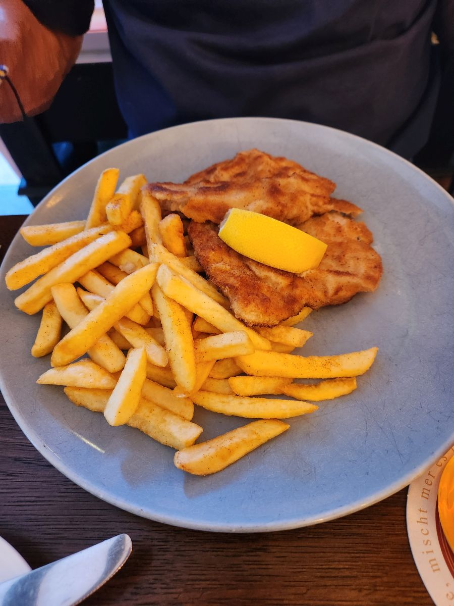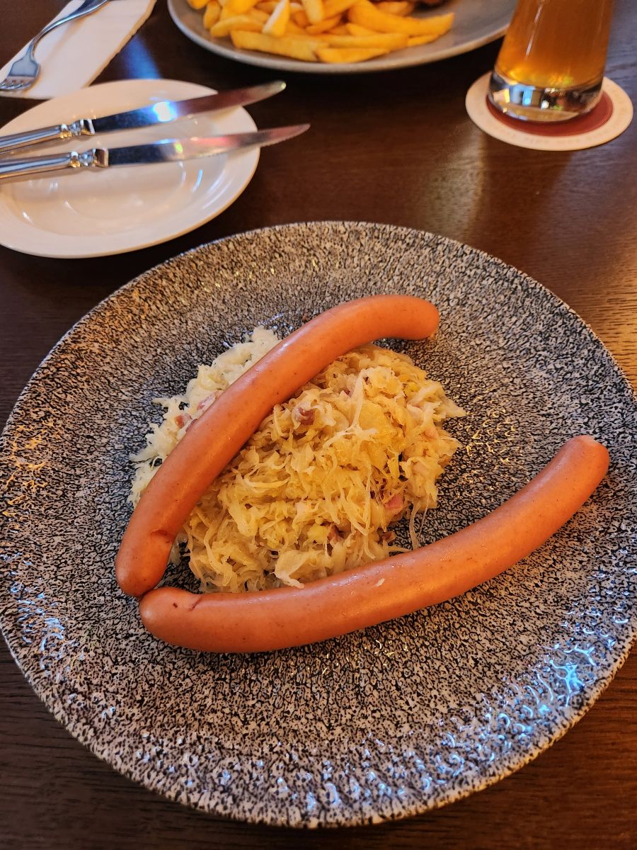 Nonetheless, we are seated, inside and happy with a huge beer, a good pour of wine, traditional local frankfurters (yes, think hot dogs! Skin on delicious hot dogs), excellent sauerkraut and a huge portion of pork schnitzel and fries. Can’t get much more traditional than that! Yum!