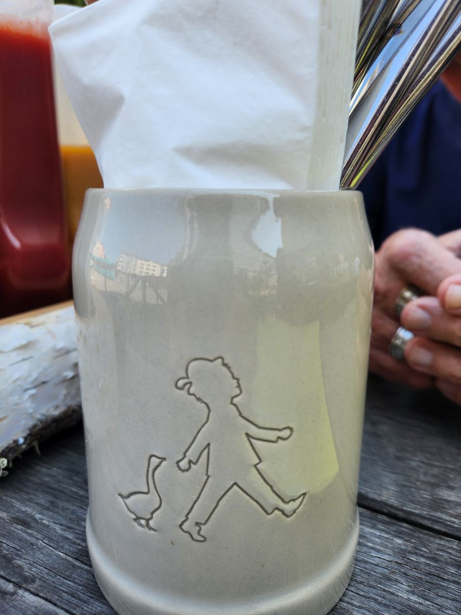 Making our way back toward the hotel, we take a different route and stop for drinks at this cute little café called Hans Im Gluck – translated to mean Hans in Luck, one of the Brother Grimm fairy tales about a boy who believes he is lucky and everything happens to him is good. It has an adorable logo of Hans and a little duck following him – which is what draws me in. The beer and wine are pretty good too!