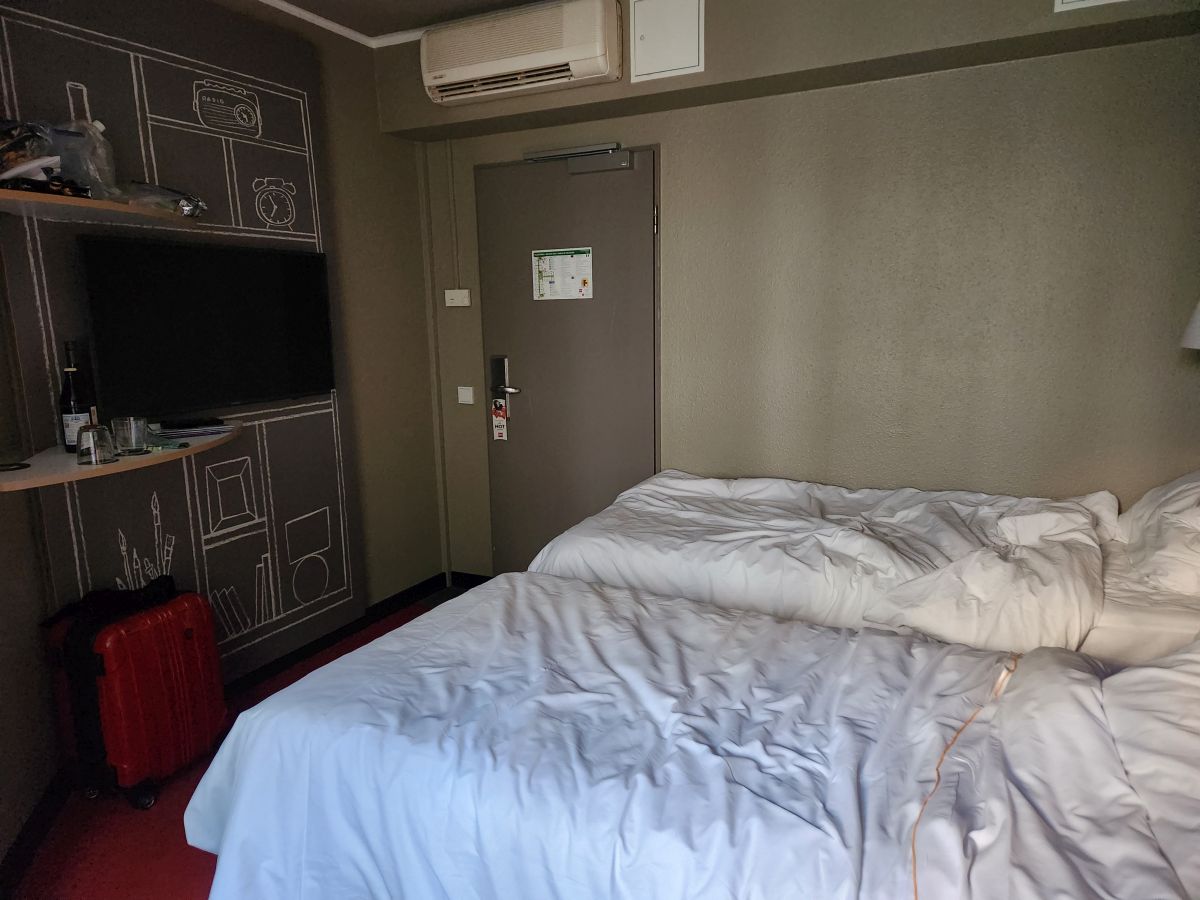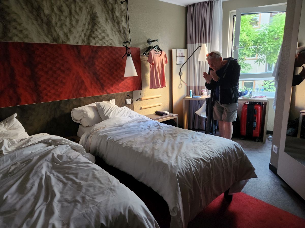 Yep, we’re up at our normal early time, but what a night! Boy these beds are great and comfy and we both slept like logs. We manage the bathroom and shower – it’s small but efficient – and then head downstairs to see if we can get any coffee or anything. Breakfast is 45 euros, and we aren’t springing for that, but the bartender guy says we can get cappuccino, so what the heck. 6 Euro 20 later and we have machine cappuccino. At least it is caffeine.