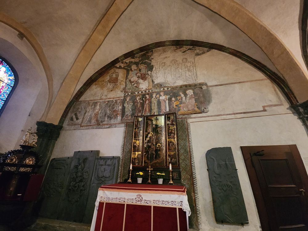 Next we walked over to the St. Martin Church, where I finally snapped into life! St. Martin Church is the largest Gothic church built in the Graubunden canton, built after the city fire in 1464. It has wonderful arches and frescoes and an amazing creche that is placed on an angle – and we never could figure out why. The information Gaby had never addressed that little oddity.