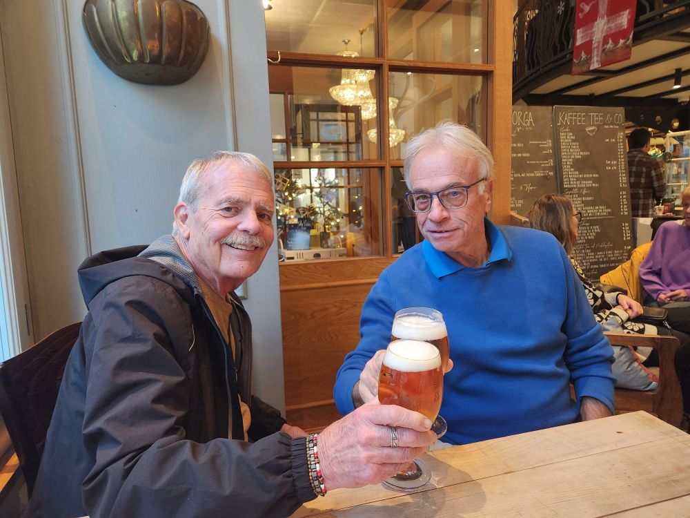 Then we are onto our last stop: The Kaffee Klatsch in the old Post Office/Library building. The building alone is very historic and great architecture, and the café only enhances it. On two levels, it is a bustling busy place serving everything from light meals to desserts to coffee and spirits. We opt for spirits and take this opportunity for our first toast to our overdue reunion. A very fun end to an excellent excursion in Chur.