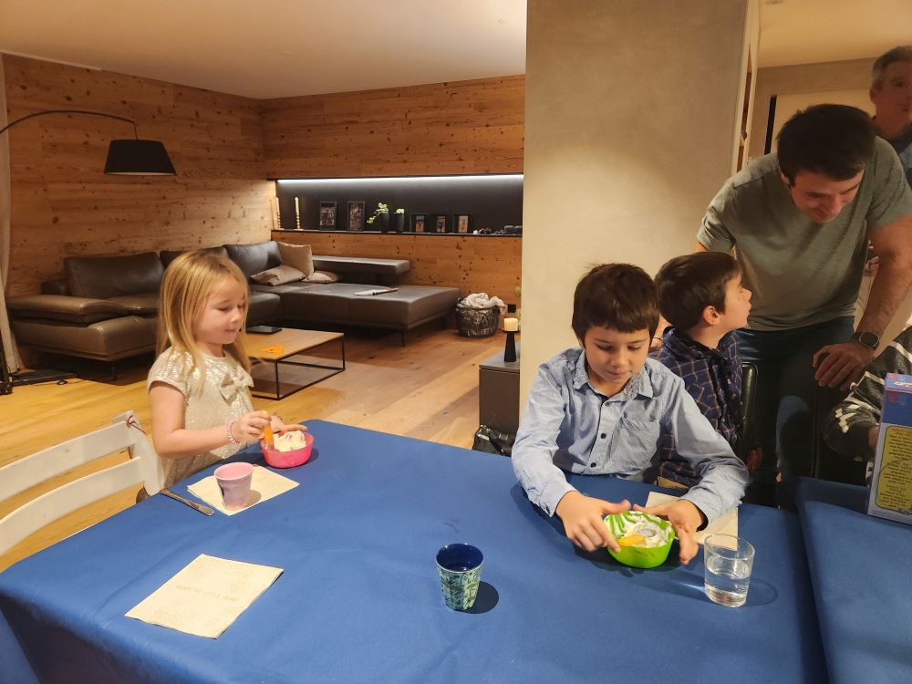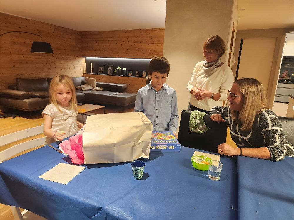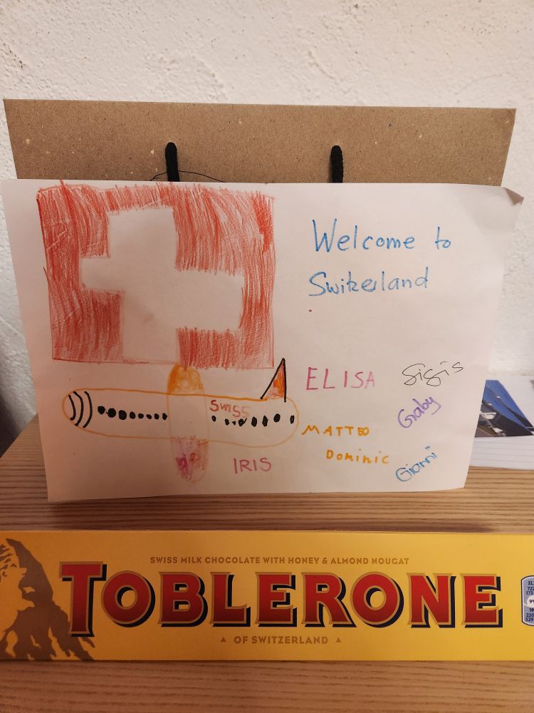 We had a wonderful reunion, sitting and chatting and getting caught up with each other. Then it was off to our adorable little Airbnb 4 minutes down the road in a lovely house facing a pasture and of course the mountains. The room (complete with a miniature kitchen and excellent bathroom) was once used by the owner’s daughter – and now they rent it out. It is perfect for us for a couple of days and so close to Gaby and Sigis, we can walk over there easily. In addition to the adorable room, we are greeted with a wonderful welcome present – created by the Dominic, Elisa and Matteo! The sweetest drawing of our plane and the Swiss flag, a section colored by each child along with a huge box of Toblerone chocolate. The perfect Swiss welcome package.