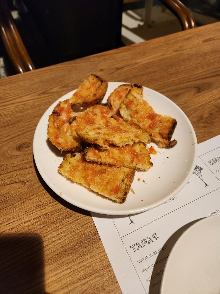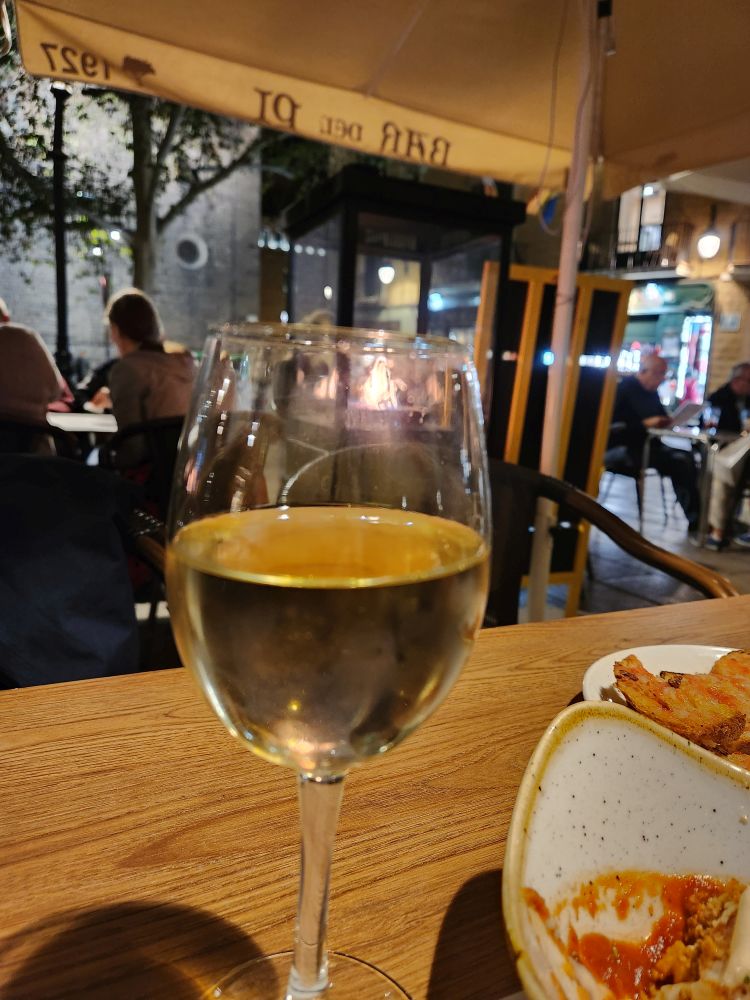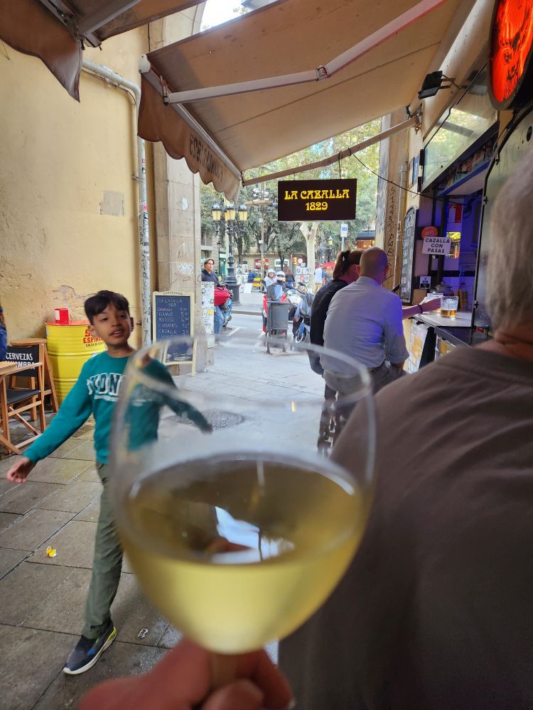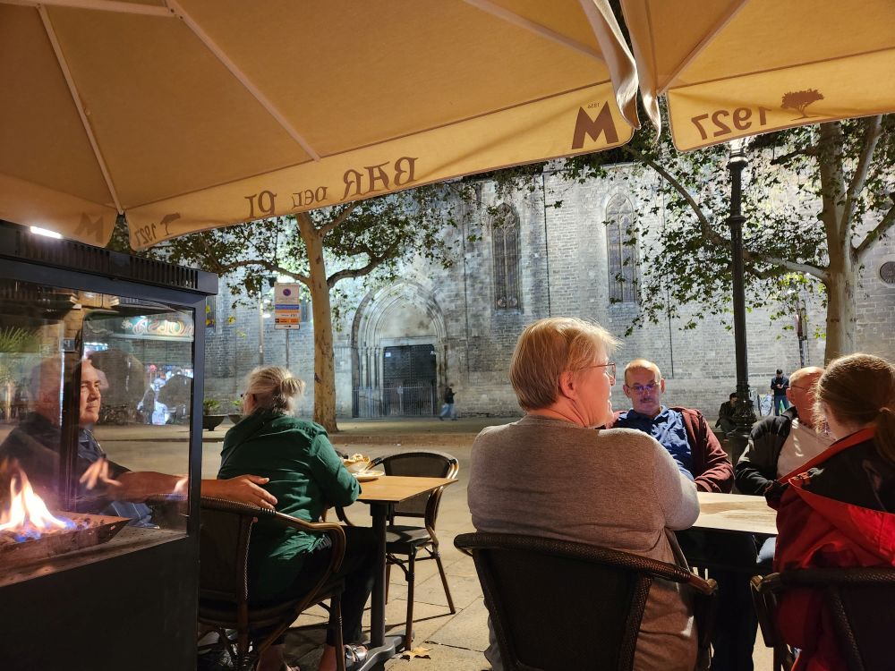 Back at the hotel we map our strategy, then hit the streets looking for some place to eat. As it turns out, right down the street are 2 little restaurants/bars that have outdoor seating. Perusing the menus, either will work, but the Bar Del Pi has more seating and great fire pits, and even though they charge a surcharge for the food outdoors, we’re hoping it’s worth it. And boy is it ever! An excellent meal of tapa ensued.