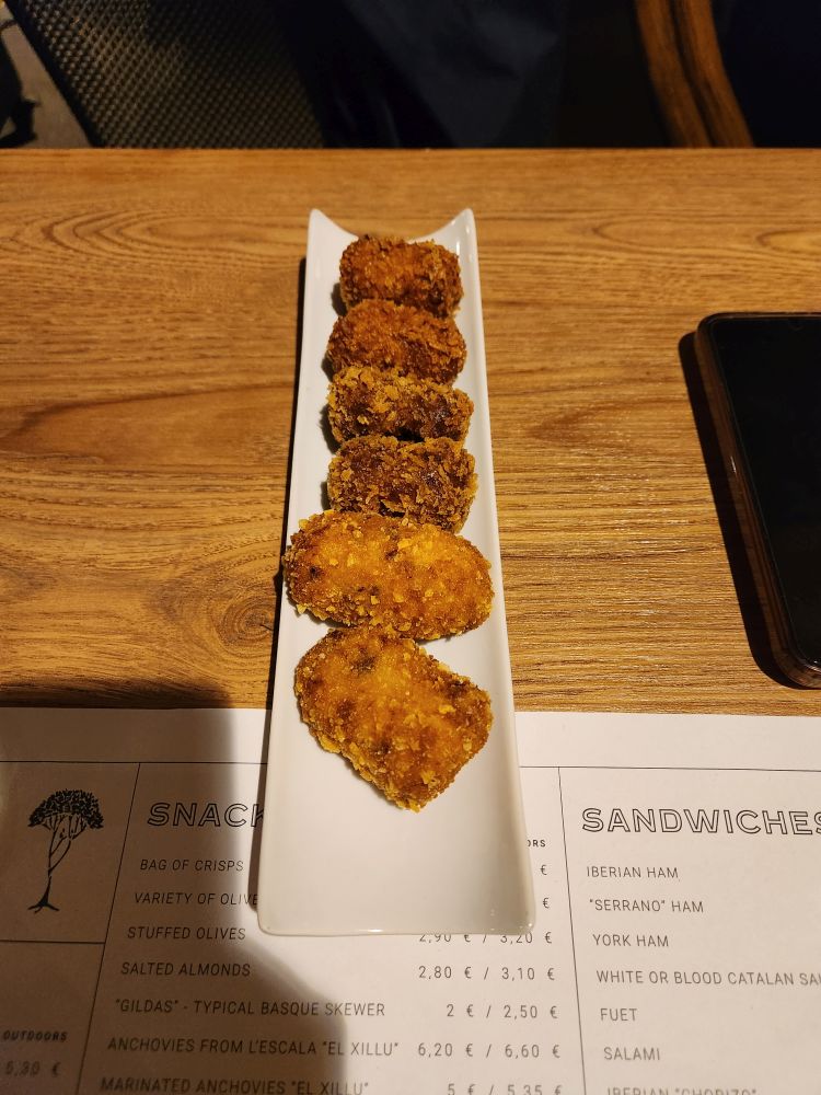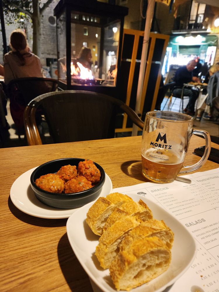 First are the Mountain Croquettes, filled with cheese, mushrooms and black truffle. Excellent! Then we try the Bomba del Pi, which is a fried potato ball stuffed with meat and served with a spicy sauce. Equally fabulous! Then the Pan de tomat (or here in Barcelona the Pa amb Tomaquet – which I practice saying with the precious waiter!) – because, well, you have to have whatever the bread with tomato is called when you are here in Barcelona. It is a requirement. And it does not disappoint. Next up is the Grilled Octopus, which quite frankly is the only disappointment of the meal. It isn’t bad, it just isn’t great – and coming after all the other stellar dishes, it doesn’t really shine. We finish off with another beer and wine, as well as meatballs with tomato sauce and bread. Perfect. We are stuffed, but not too crazily and we are just happy sipping on our drinks, warmed by the fire, watching the world go by us on the square.