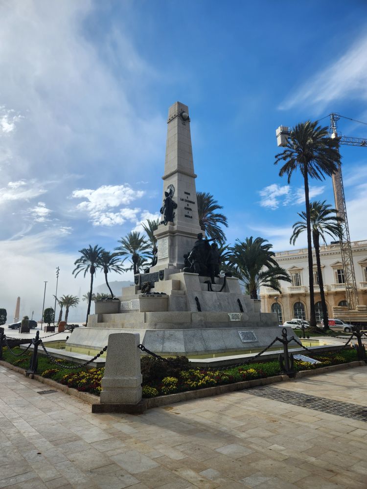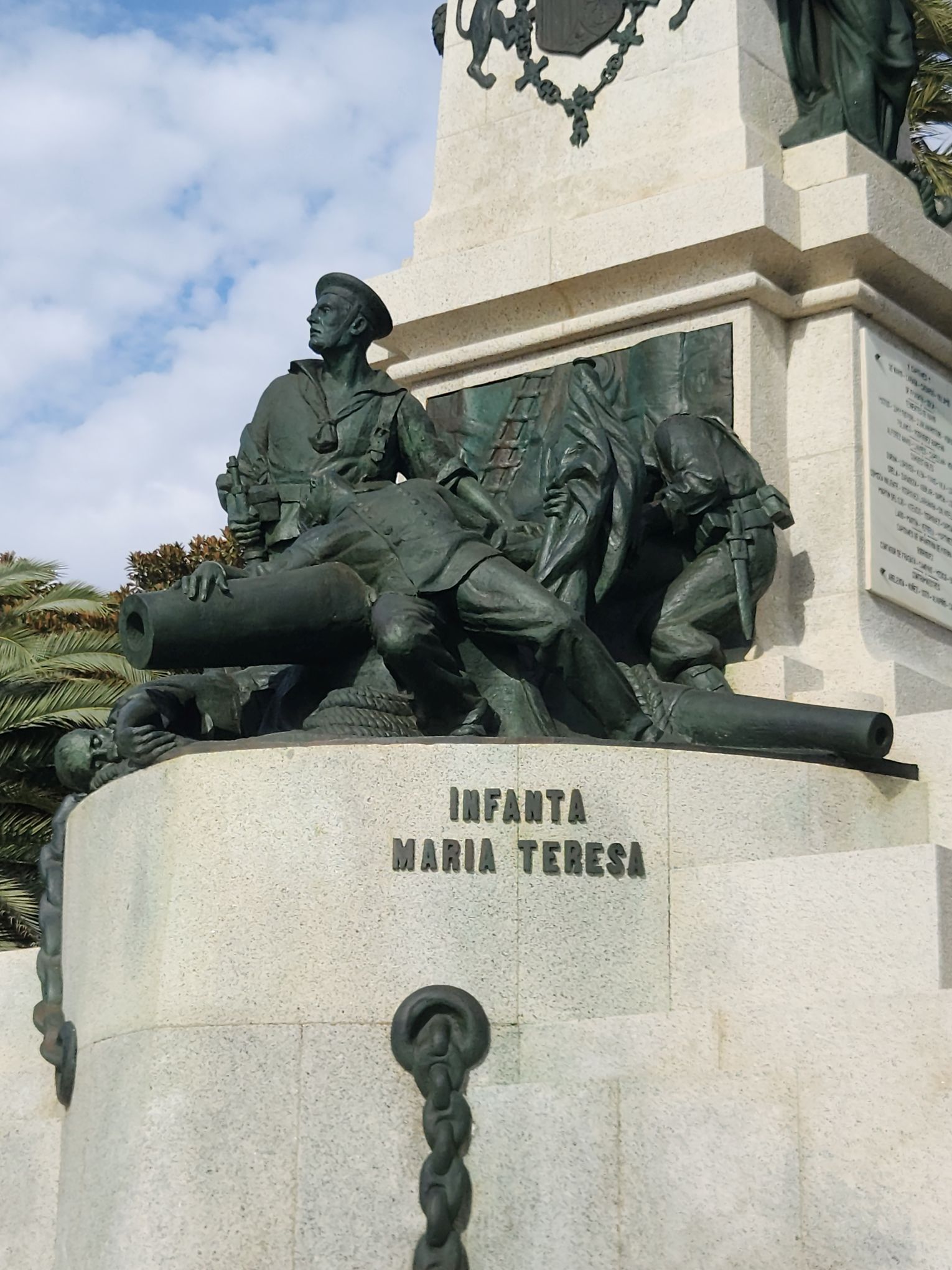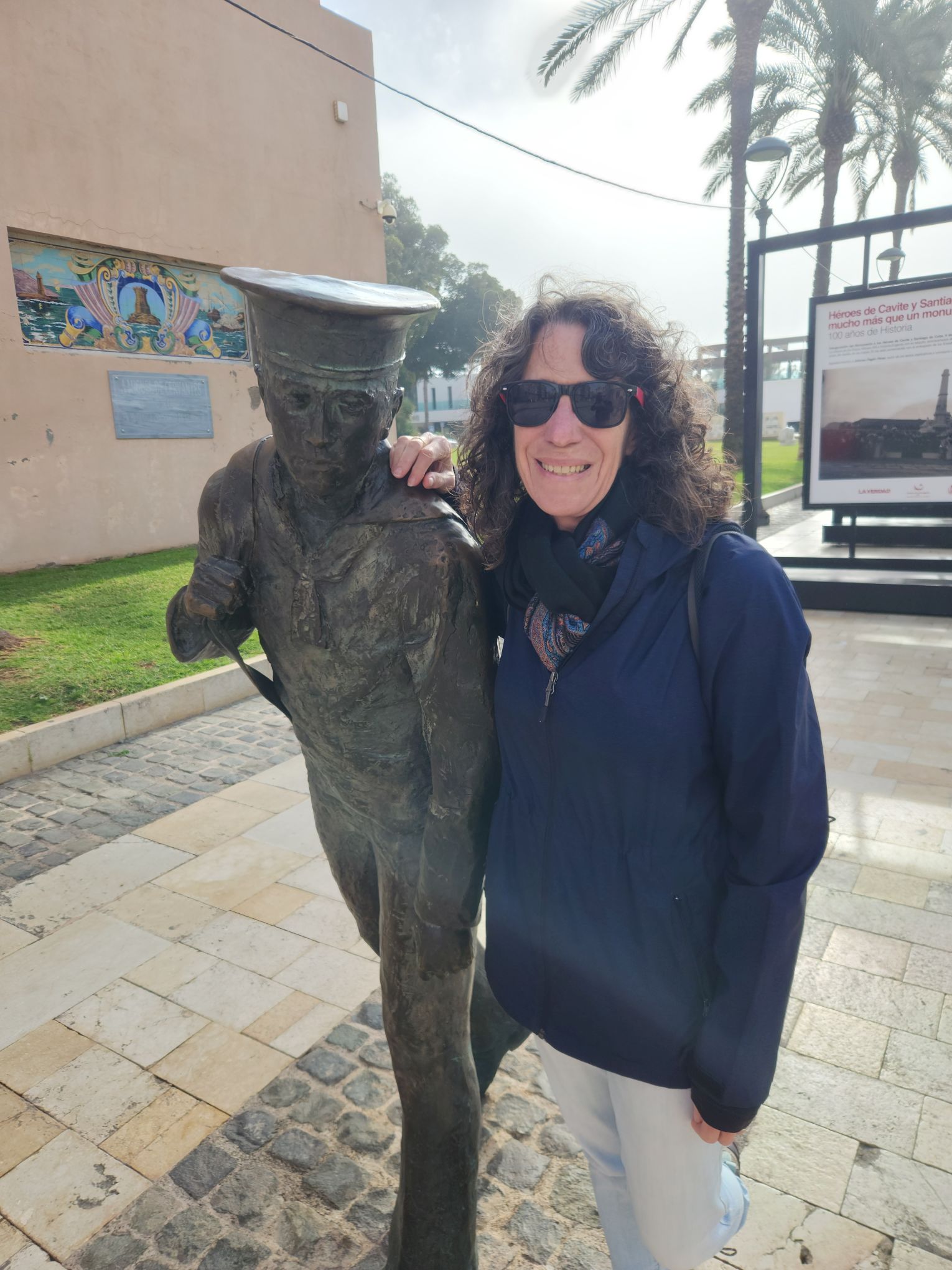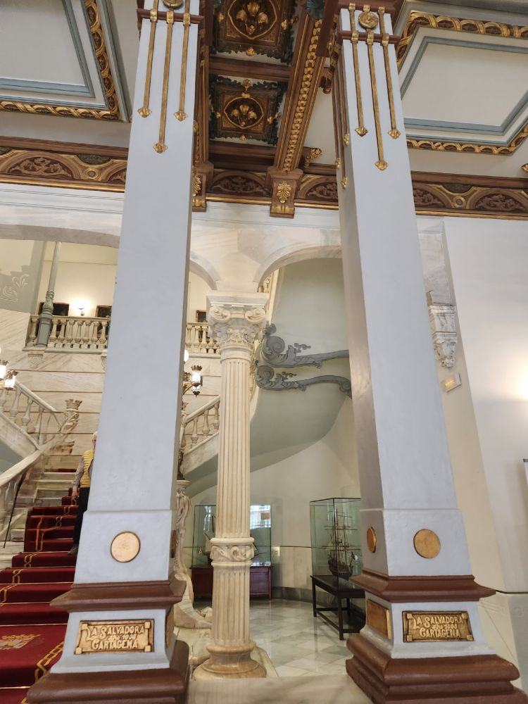 While there are tours there, the next English tour isn’t for a couple of hours, so we just do our own little tour of the 100 year old gorgeous building. We start off in some small artist gallery displays, then traverse the incredible marble lobby to get to a huge exhibit on the Cavite y Santiago de Cuba Monument, which turned 100 years old just yesterday. There were signs on the walkway into the city explaining the history, and now here there is more information, solo en Espanol! But we do our best with translations, loving a miniature cork reproduction of the monument and watching a fascinating video presentation about the monument, it’s creator and all the dignitaries, including the American Ambassador, who came to Cartagena for the unveiling.
