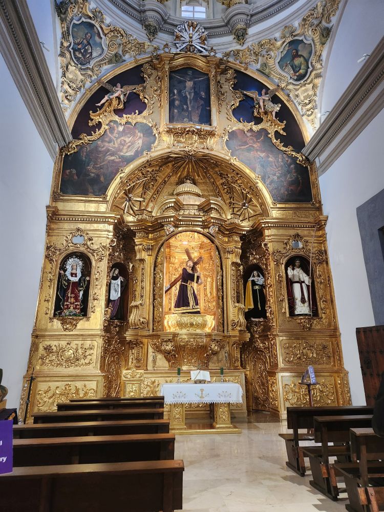 While totally foggy and cold at the waterfront, a few blocks away and it is gorgeous, sunny and much warmer. Incredible what weather can do! We meander through the pedestrian main street, looking at a fun t-shirt store (unfortunately with all the designs on the back) then popping into the Iglesia Castrense de Santo Domingo for a quick look around.