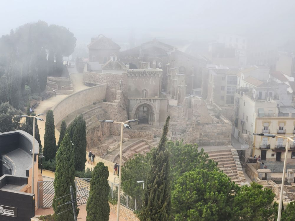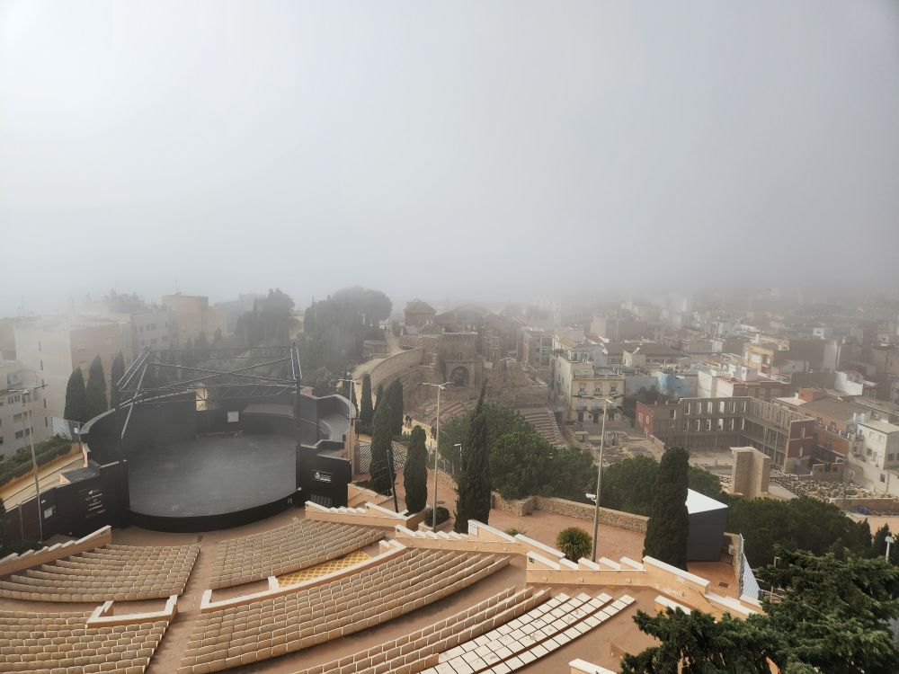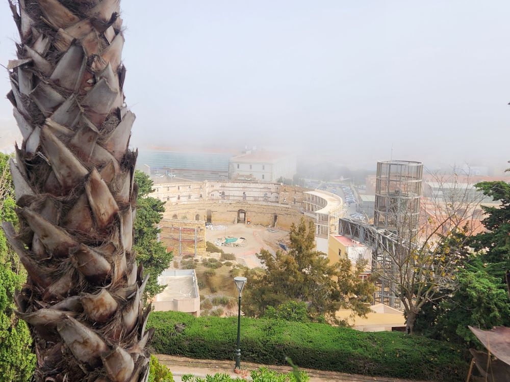 Continuing up the hill, we finally reach the fortress, with more views out across the theater as well as the new amphitheater, as the fog starts rolling inland in waves.