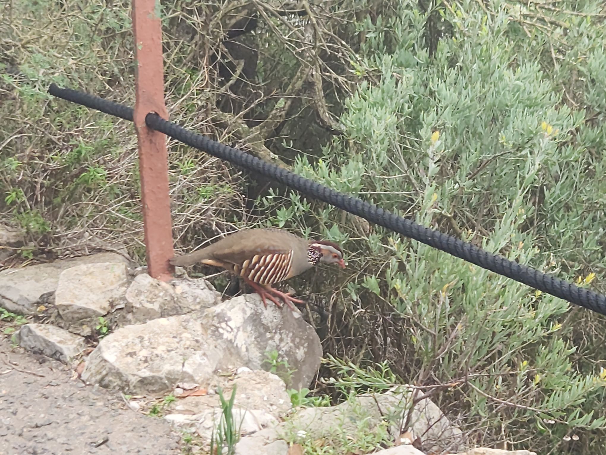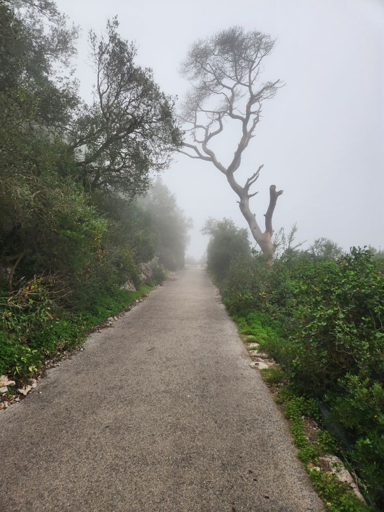 From here you can access the Mediterranean Steps, which is said to a challenging trail that leads all thew ay down to Jews’ Gate. If we had more time – we might attempt that – going down that is! – but since we do have time constraints, we reverse course and head down the paved, non-challenging path toward St. Michael’s Cave, pausing along the way some really neat looking bird with striped wings, and getting glimpses of the coastline down below as the fog moves in and out.