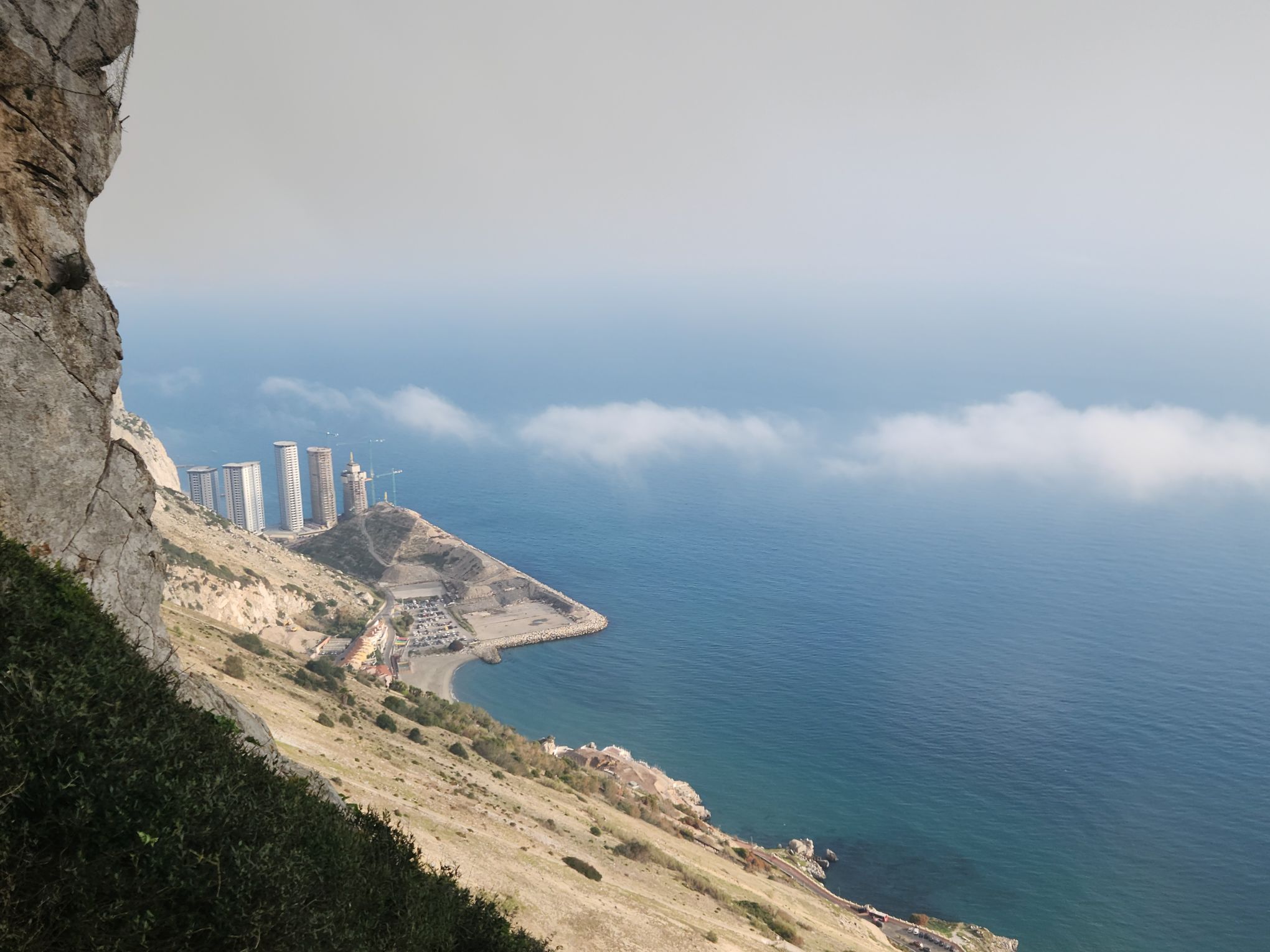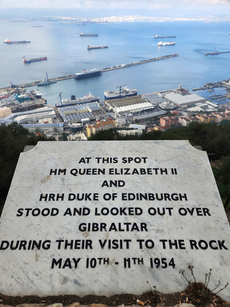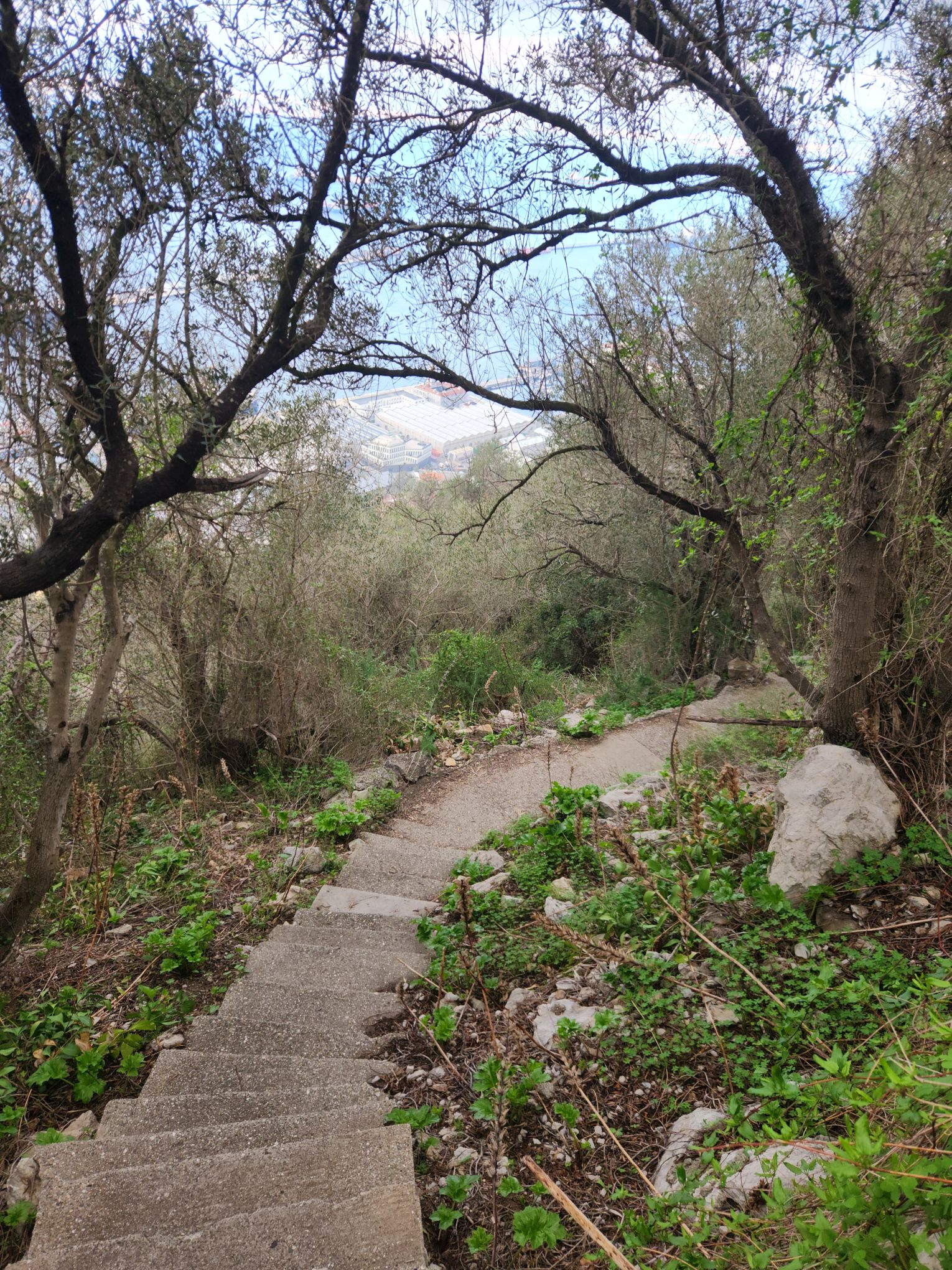 We pass by the spot where Queen Elizabeth looked out over Gibraltar on her visit in 1954, with great views down into the now clear harbor. There’s our sweet Pursuit docked way, way below us! Then head down these little stone stairs and along a path, through scrub and a few trees, that occasionally opens up to fantastic views out over the city and the water to the coast of Spain.