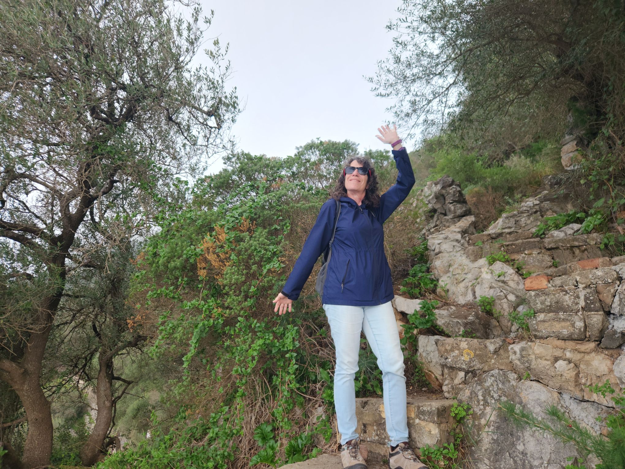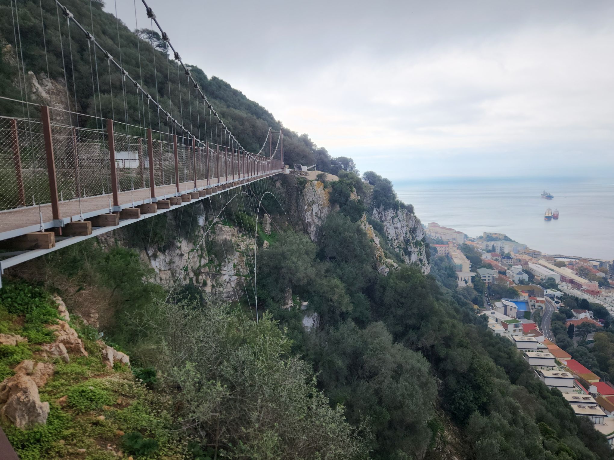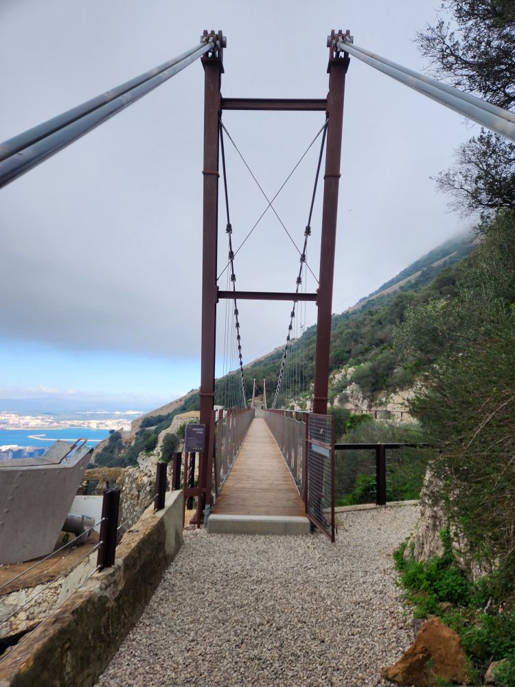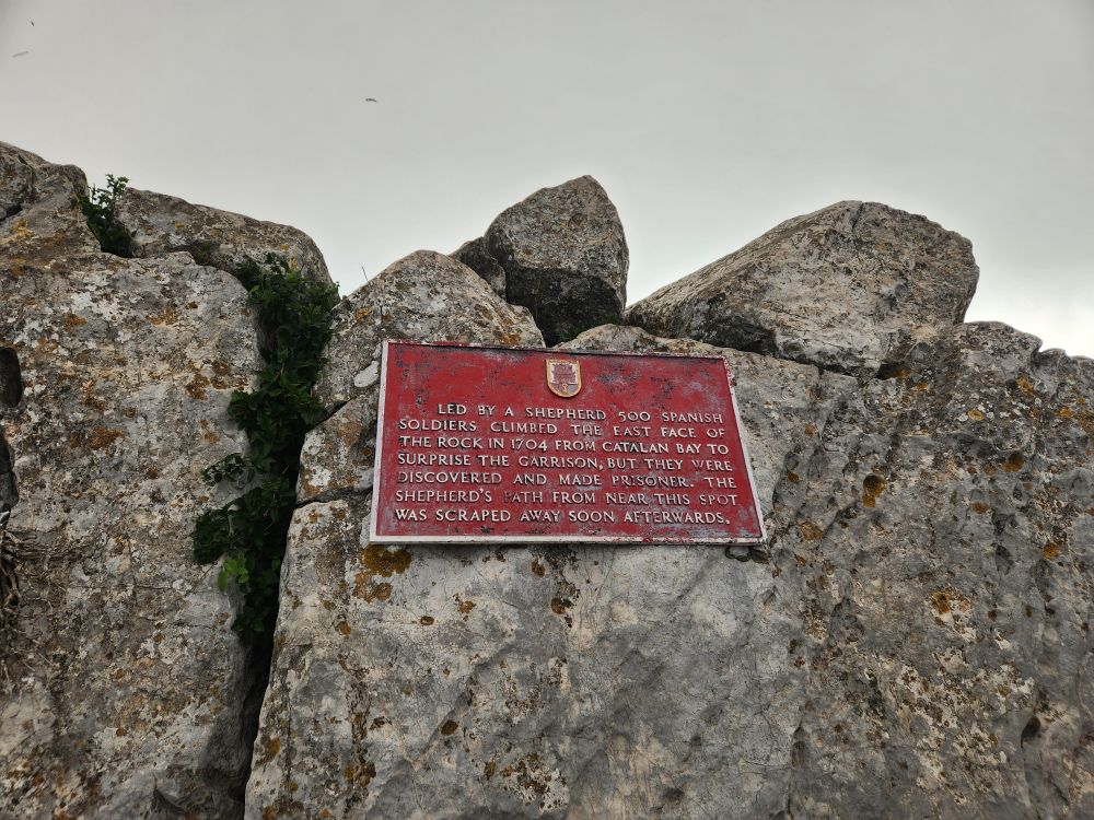 We pass by the spot where Queen Elizabeth looked out over Gibraltar on her visit in 1954, with great views down into the now clear harbor. There’s our sweet Pursuit docked way, way below us! Then head down these little stone stairs and along a path, through scrub and a few trees, that occasionally opens up to fantastic views out over the city and the water to the coast of Spain.