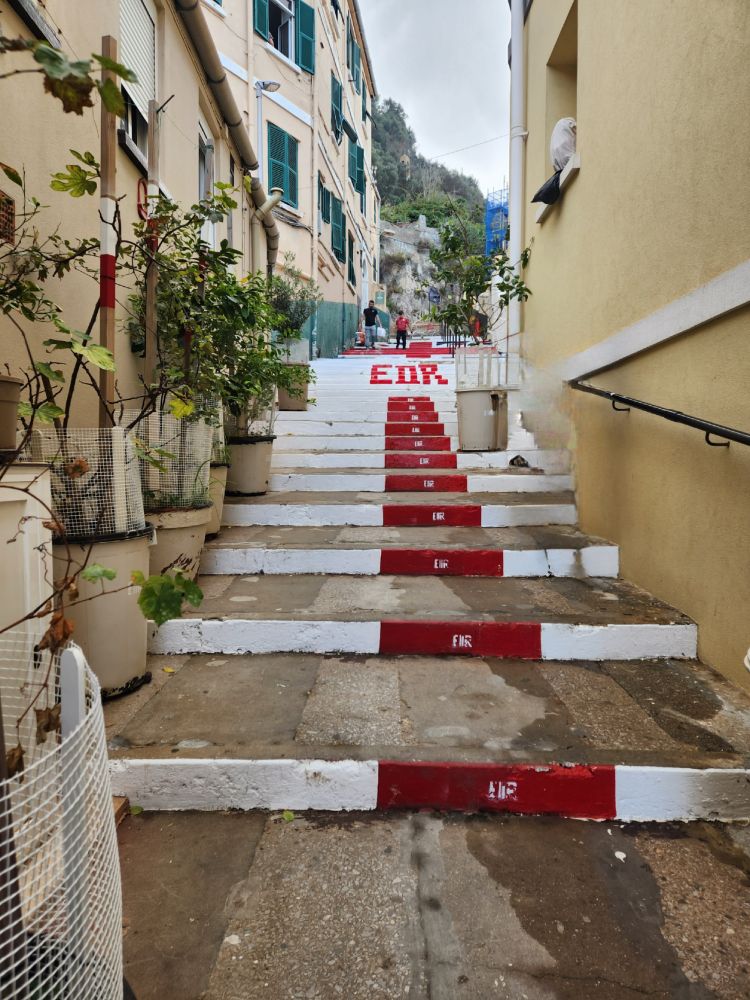 By that point in time it is getting on toward noon and we make the decision to skip the Great Siege tunnels, which we have visited previously, and head back into town on the Devil’s Gap Footpath which leads directly into the Upper Town area and the city center. On the way down, we get great views of the city, a look at one of the brick shafts used to vent the tunnels underneath us, as well as a great look back up the painted steps – a symbol of Gibraltar’s wishes to remain British after they were painted with the Union Jack during the 1967 Referendum (since repainted and refreshed in 2011).