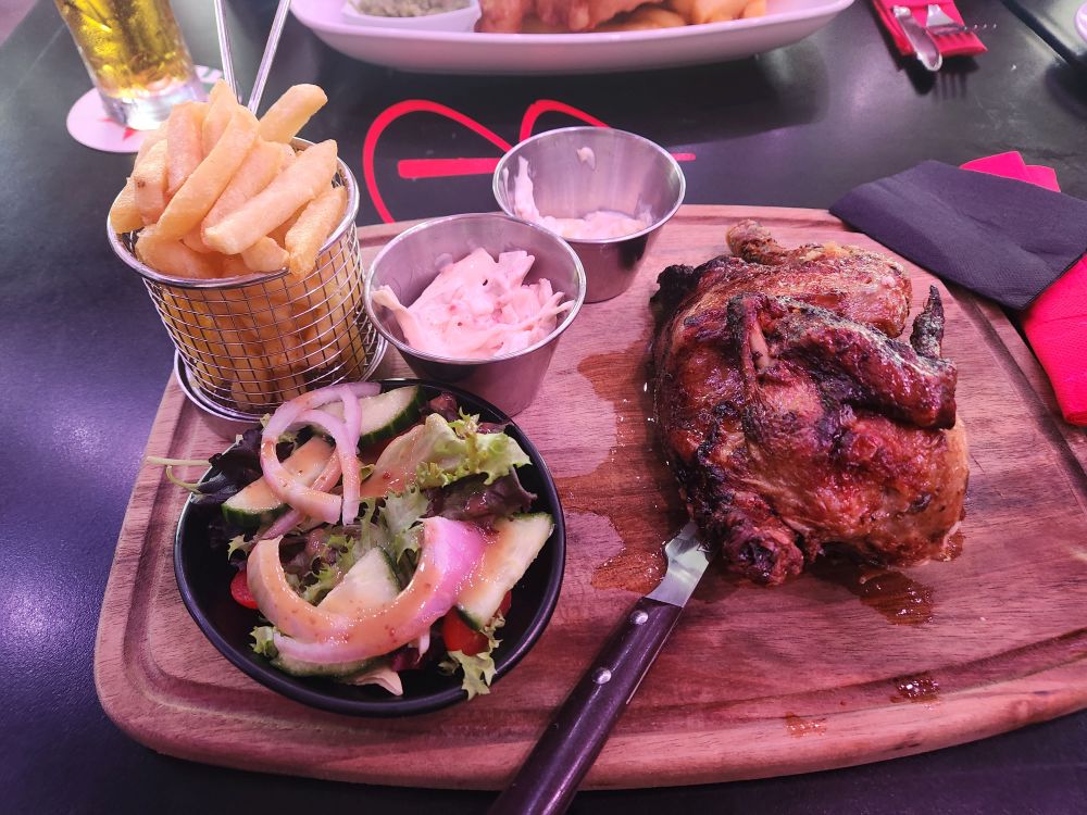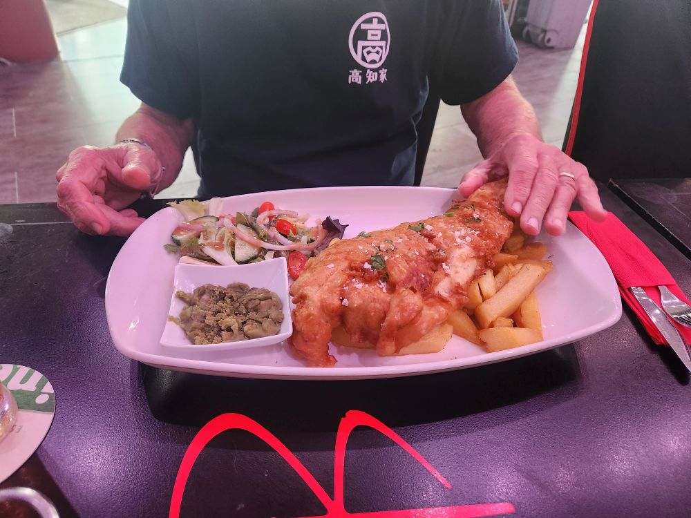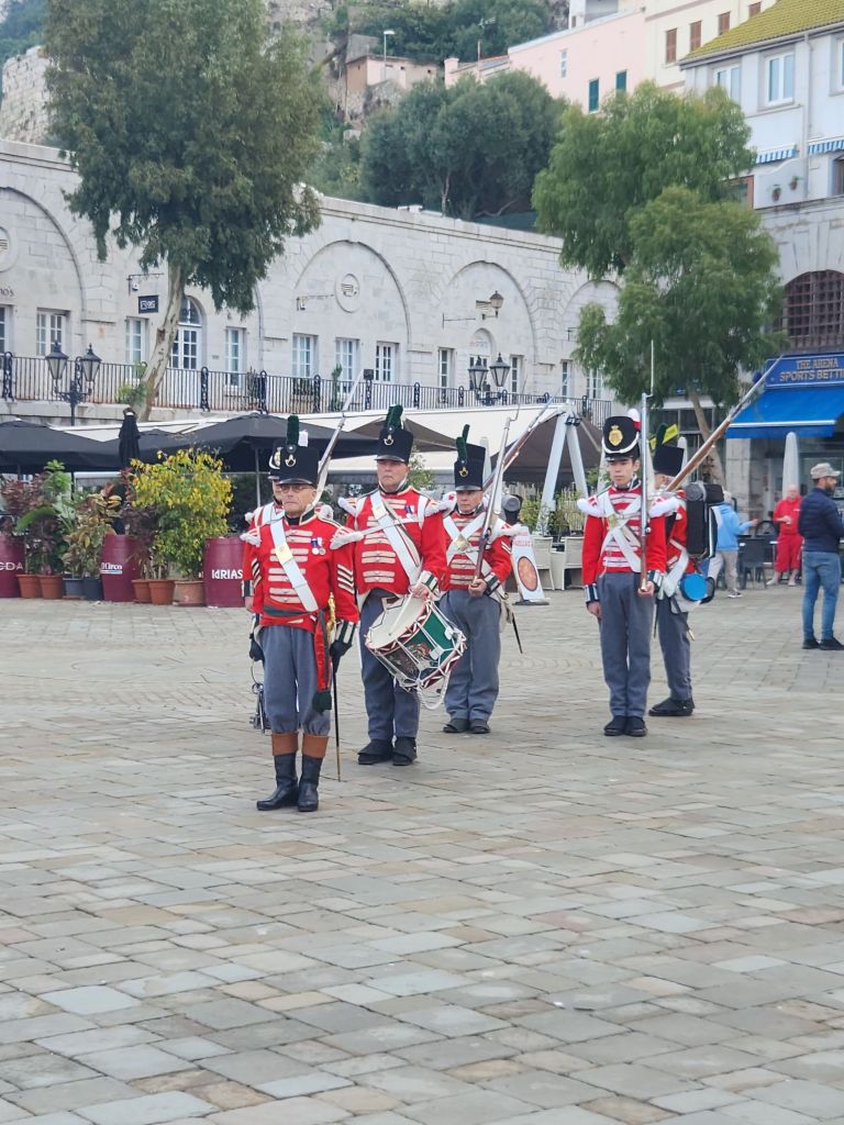 And then we are back down to the old town, and a British military parade or something going on in Casemate Square. It is Saturday and the town is bustling with people – we are heading toward Bruno’s our traditional spot for lunch, but had started to consider staying in the center of town. Not! It is way too peopley out here! So off we go to the marina, to Bruno’s and our own private little club – as we are the only customers there for quite a while! We have a wonderful lunch of fish and chips (monstrous!!!) and a half roasted chicken (a little hammered, but still really good), plus excellent pours of wine and beer.