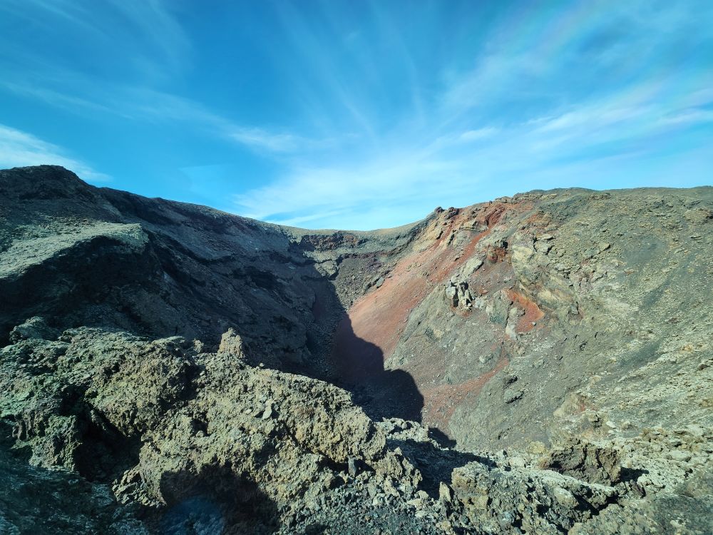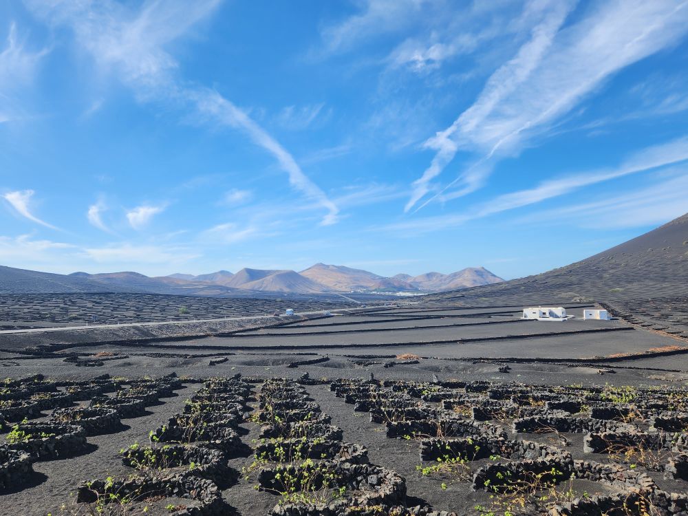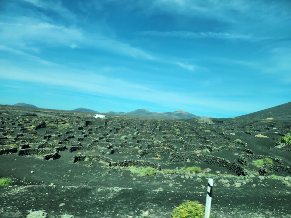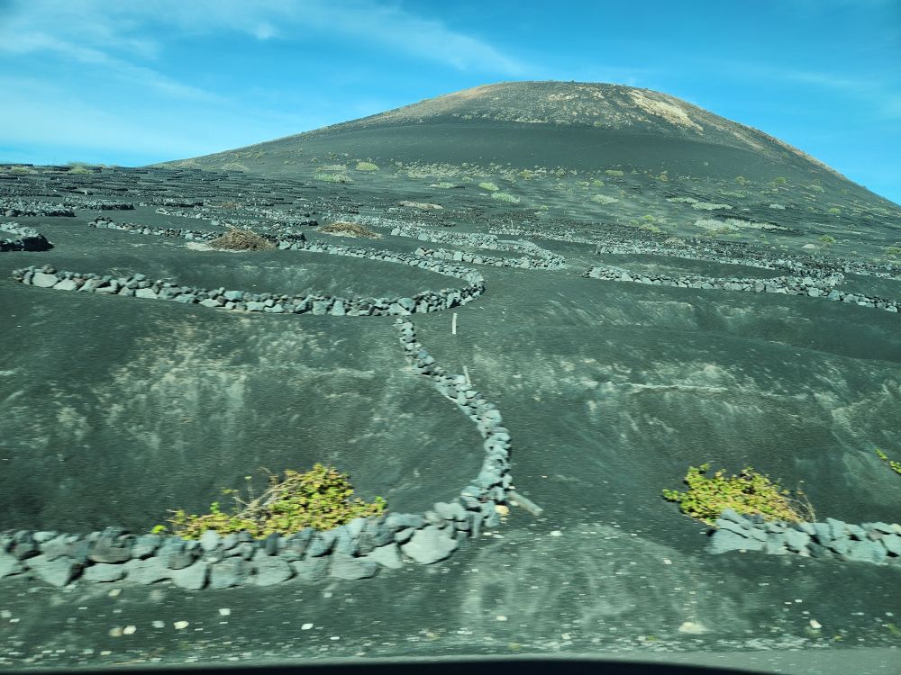 Our next stop is a bodega to taste the local wine grown in volcanic soil. On the way, we pass through the wine region of the island. Grapes are the largest crop on the island, producing 3.2 million kilos of grapes last year. Other crops include (in order of importance) onions, potato, cereal and aloe vero. Each well adapted to this type of volcanic soil and climate. In the wine region through which we are driving, every vine is planted in a circular ditch-like pit with volcanic rocks placed in a semi-circle around it to protect from the wind and keep the water from washing the vine away when it rains (all those 6 days!). The vine “pits” stretch out across the terrain for as far as the eye can see. They reach way high up on the hills and out across the flatter valleys. Virtually everything is picked by hand, they don’t use “motors,” as Anna calls mechanized harvesting. There are a couple of vineyards set up for “motors,” where the rock walls are in a straight line allowing the mechanical picker to go up and down the rows, but by and large, everything else is semi-circular and hand picked. A monumental task – particularly in this environment!